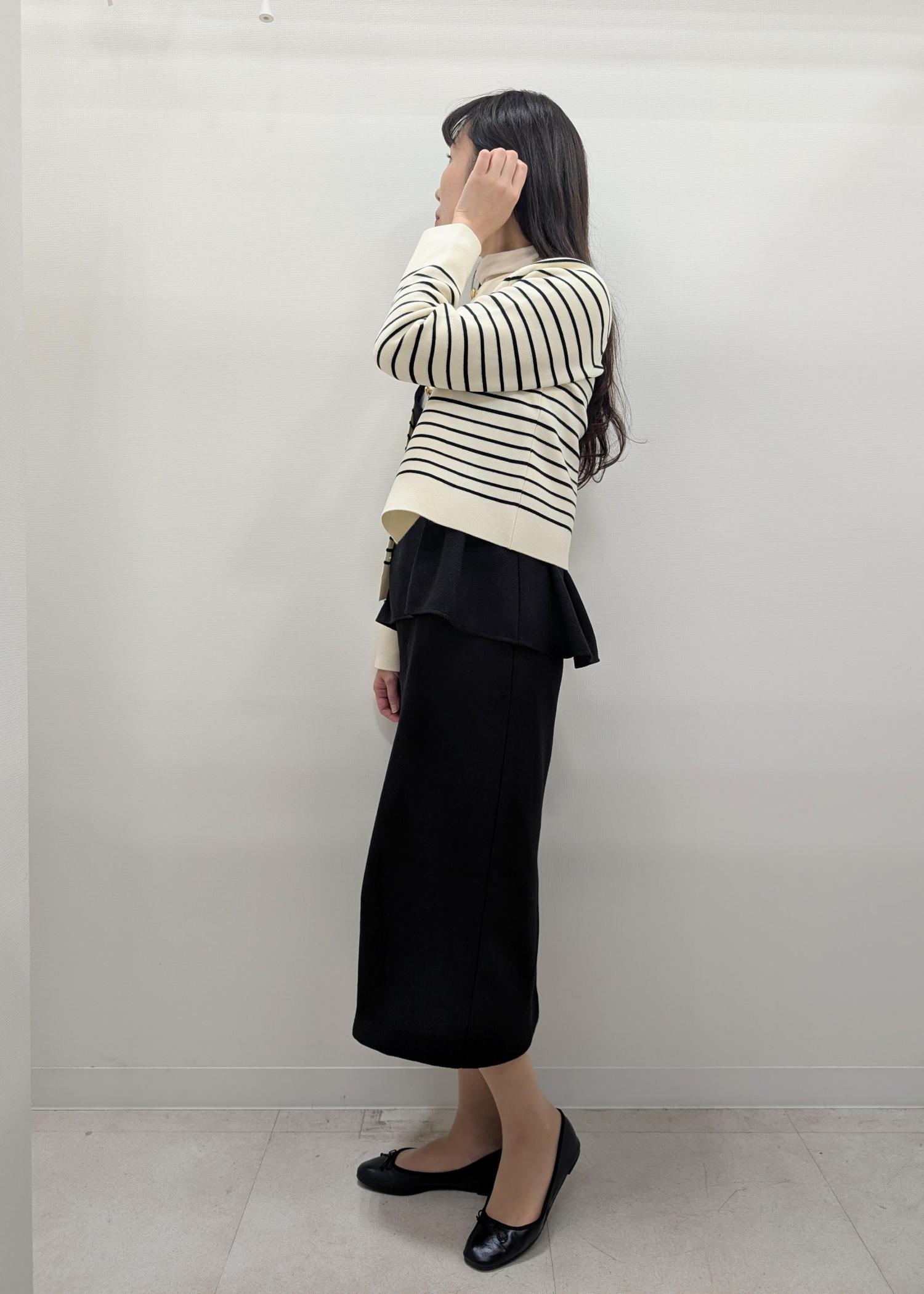 トレンドのペプラムワンピースに合わせてカーディガンは短めの丈を選びました(^^)