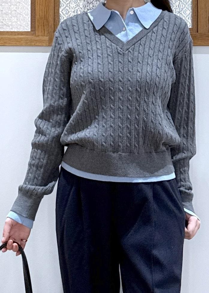 グレー(07)は、トレンドのブルーシャツをレイヤードしている風のニットで1枚でトレンド感があるのが嬉しいポイント◎