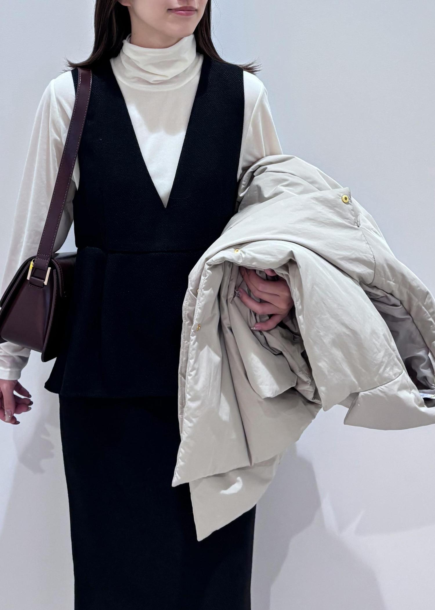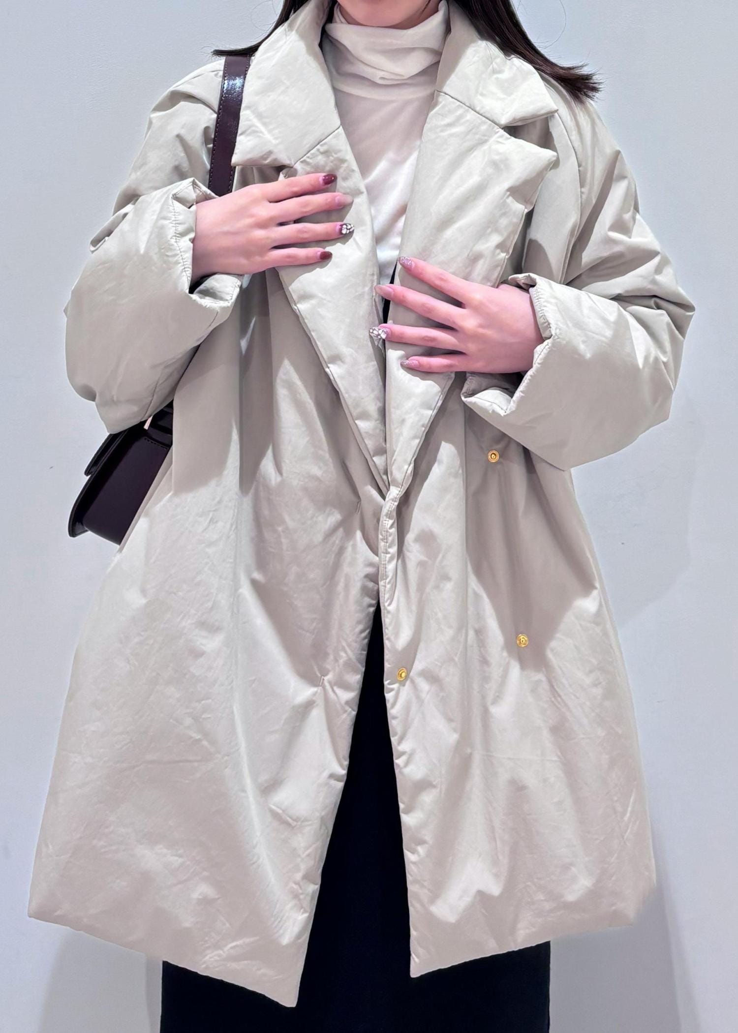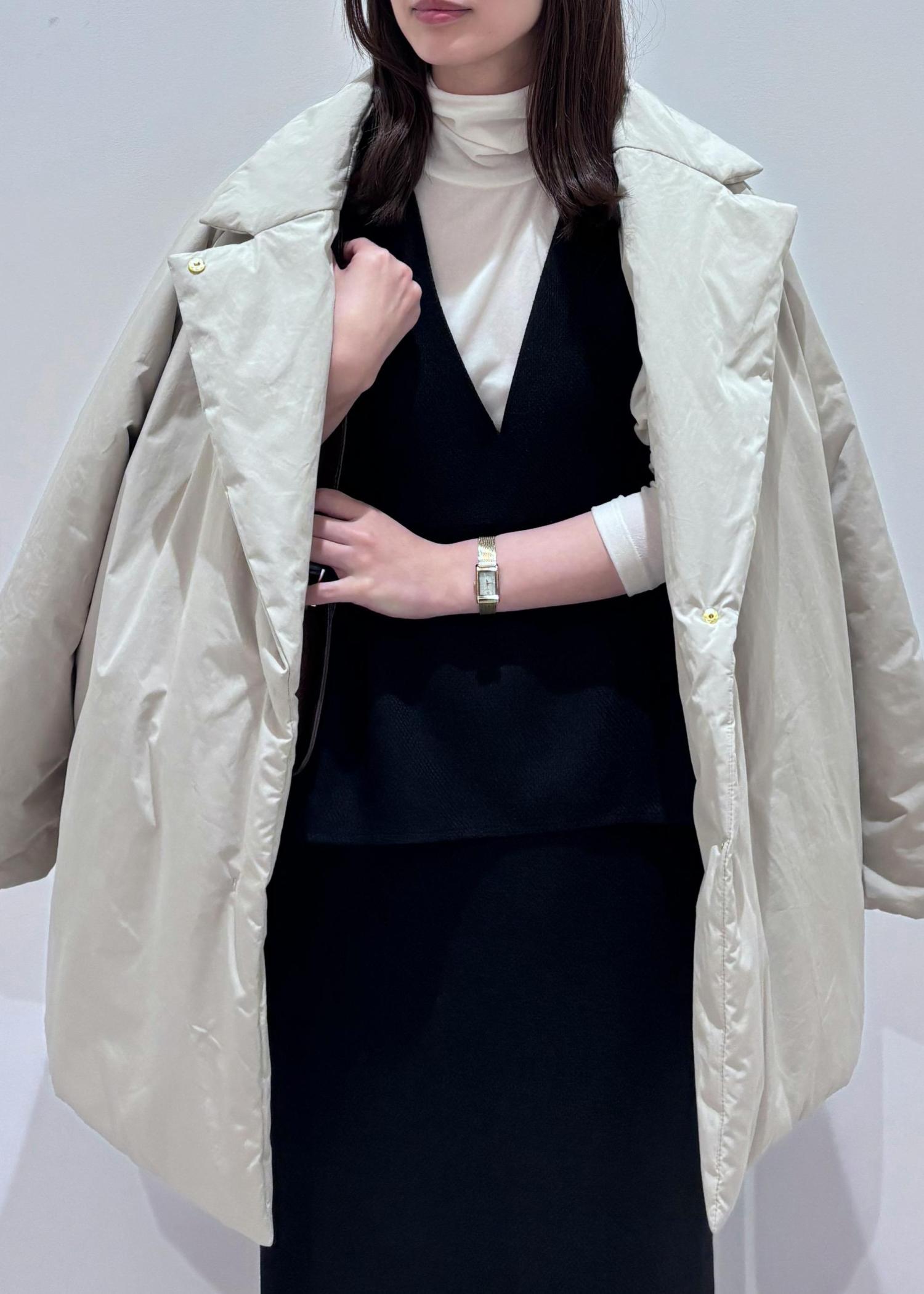 とっても軽く、厚みのあるふわふわした生地感で包み込んでくれます。ボタンを閉めると襟を立てることができるので、首周りも暖かく風除けも◎ -