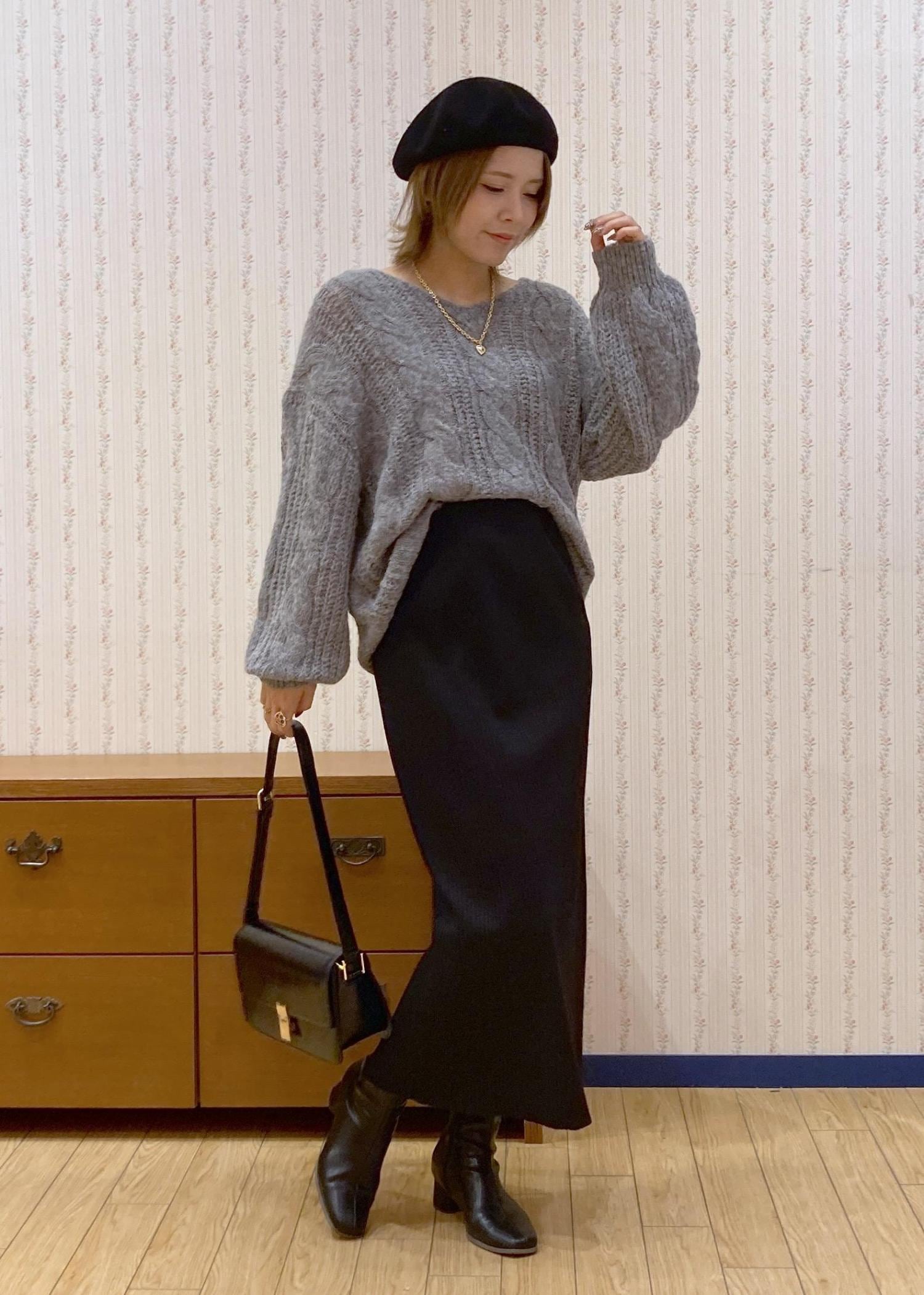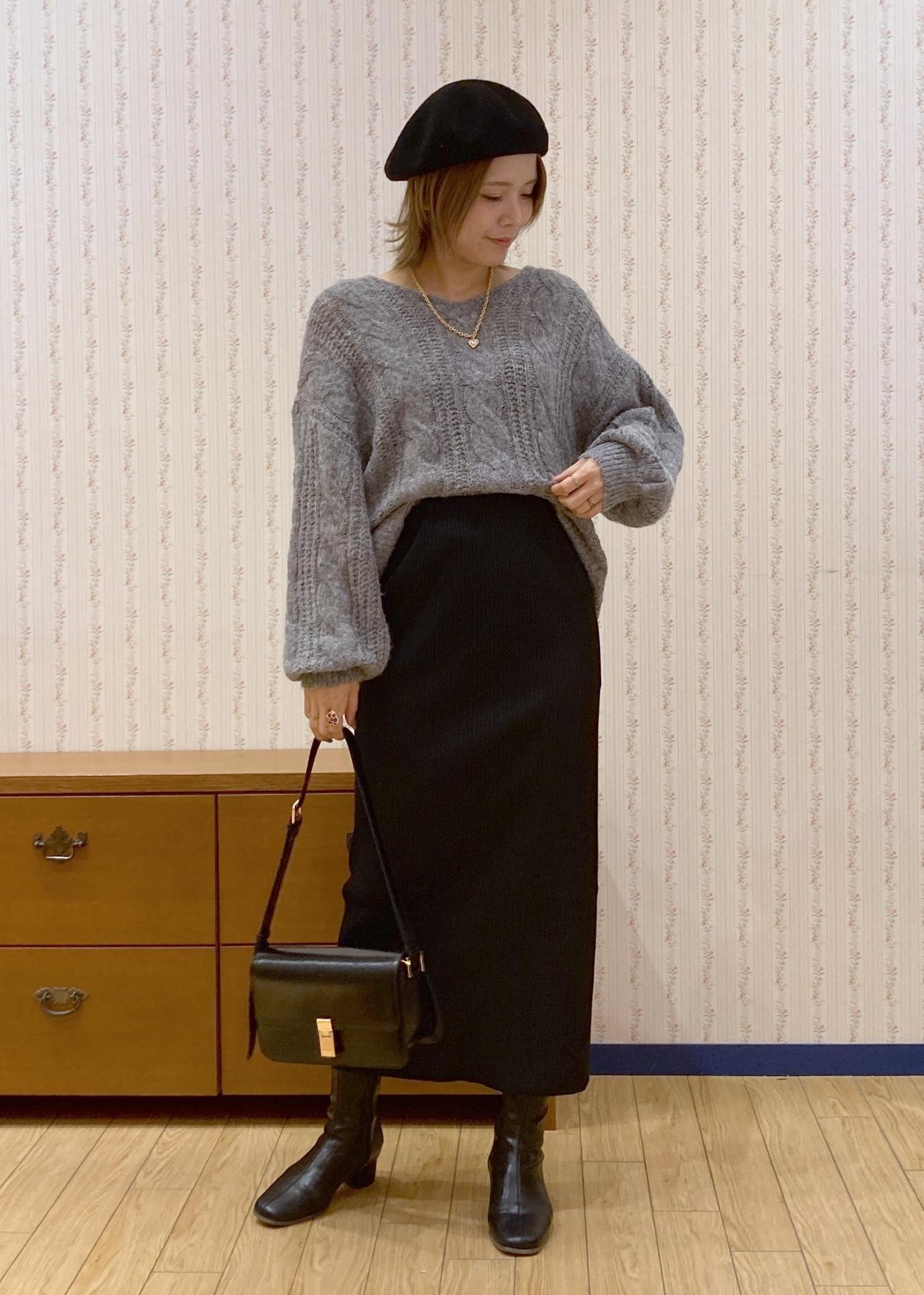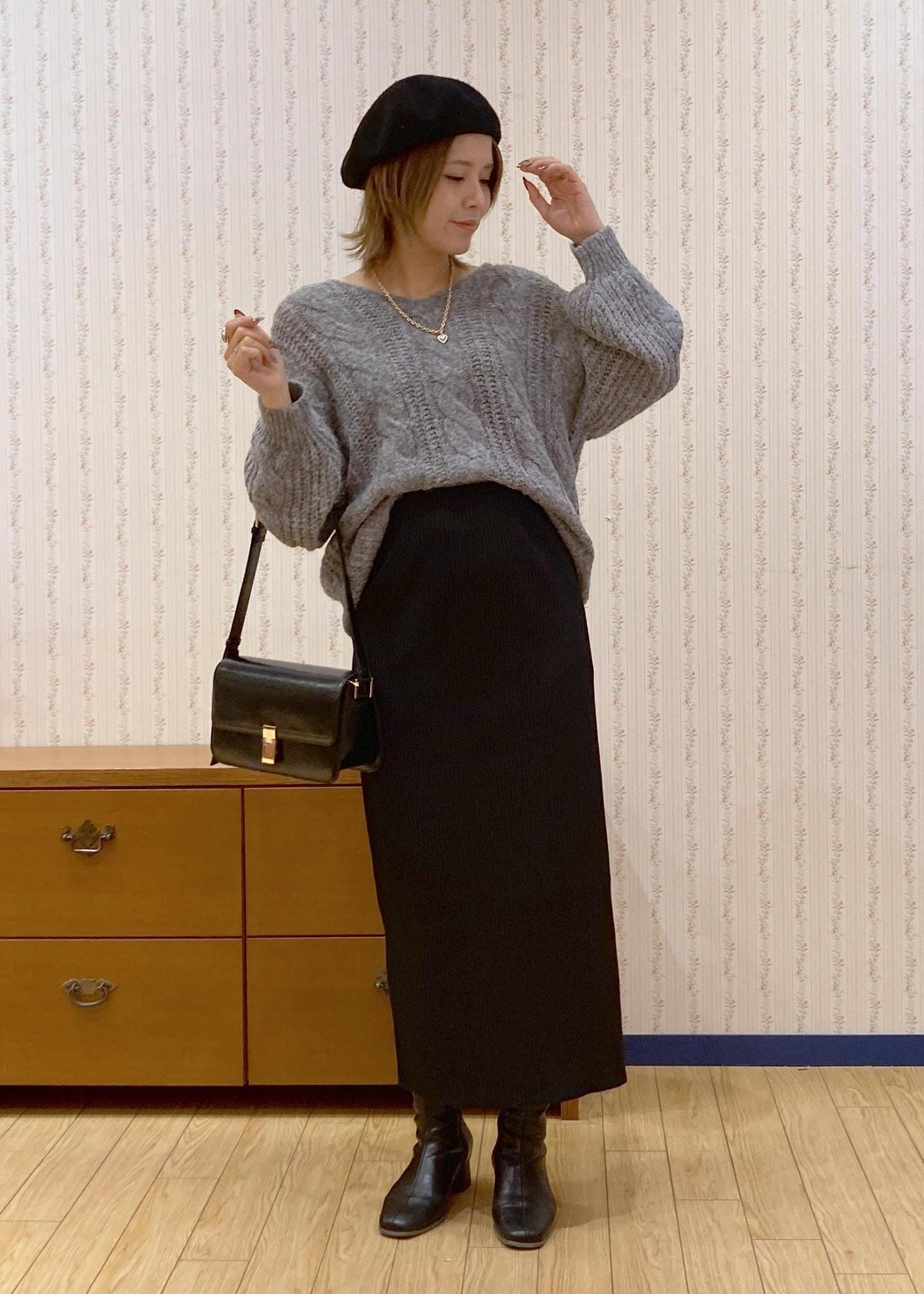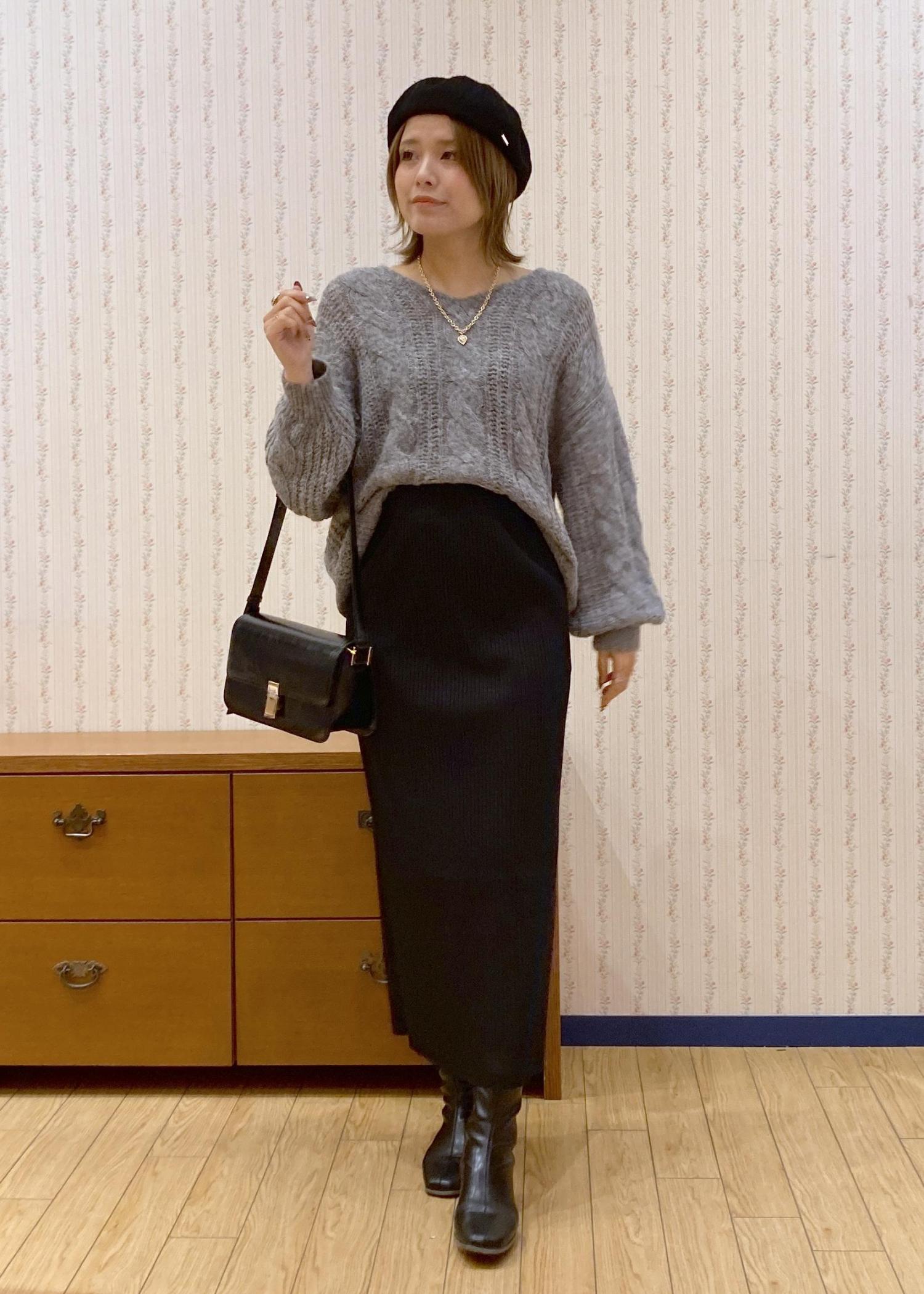 ゆるっとしたシルエットのニット×タイトスカートでメリハリをつけて、ウエストは前だけインして目線を高く見せてスタイルアップ効果を狙いました!