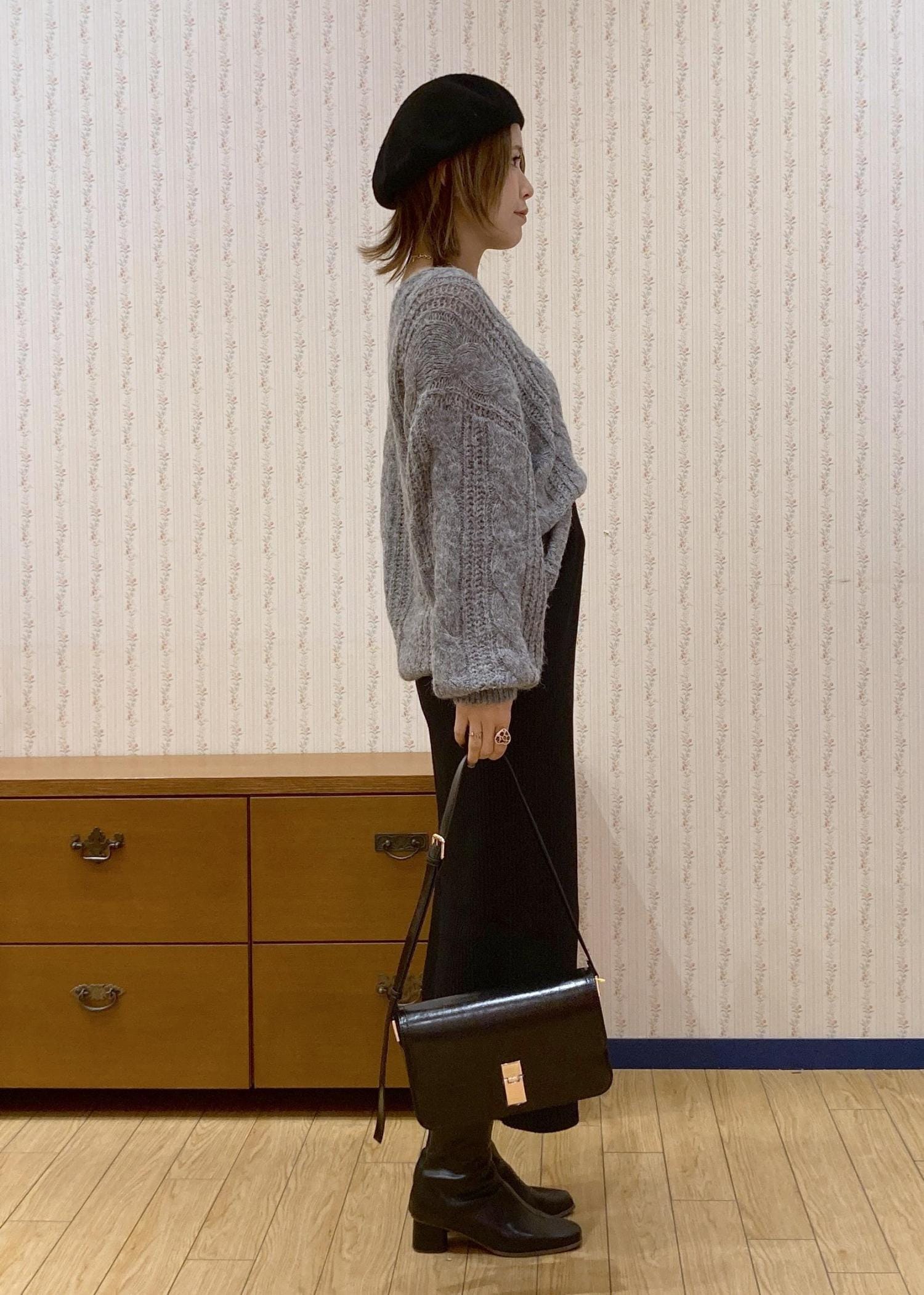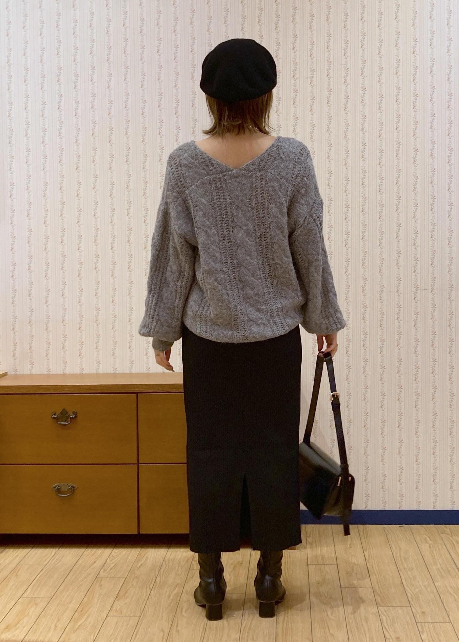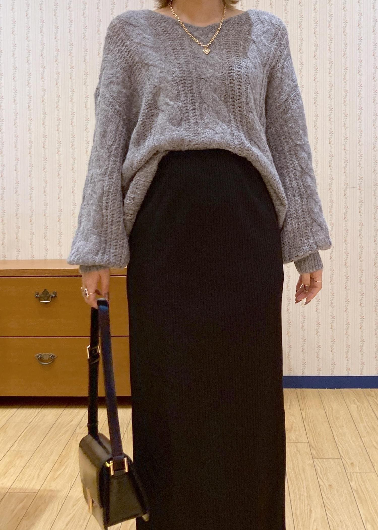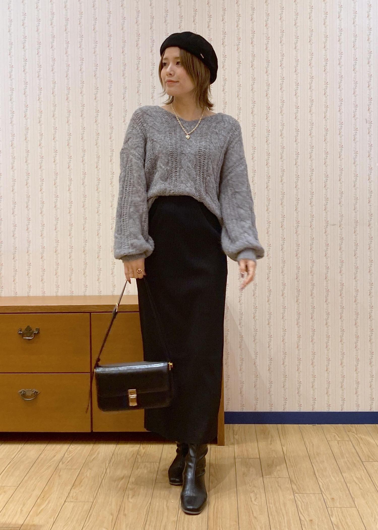 ゆるっとしたシルエットのニット×タイトスカートでメリハリをつけて、ウエストは前だけインして目線を高く見せてスタイルアップ効果を狙いました!