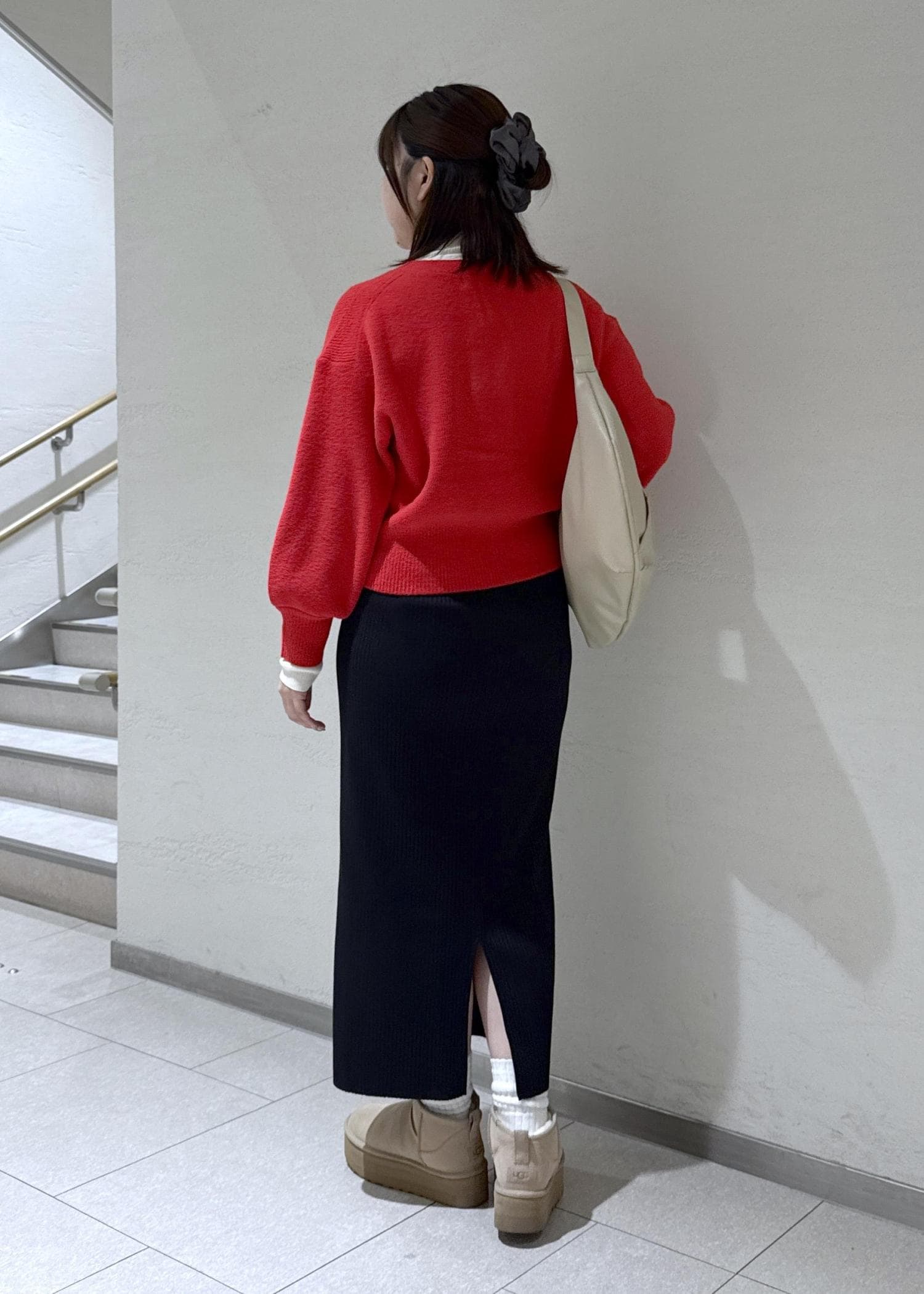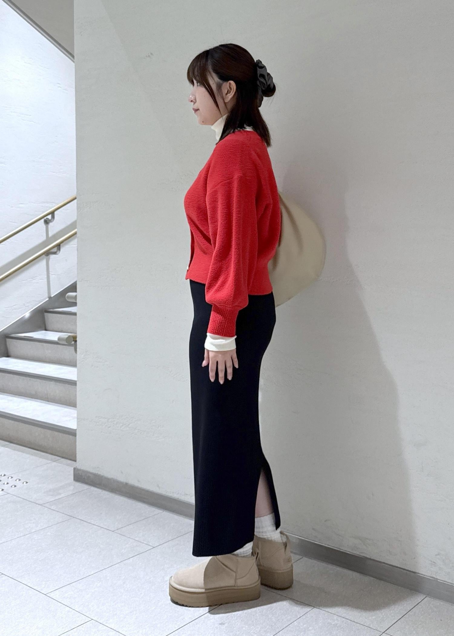 ショート丈にトタンテレコスカートは腰周りが気になるので、合わせるアウターはミドル丈がオススメです。