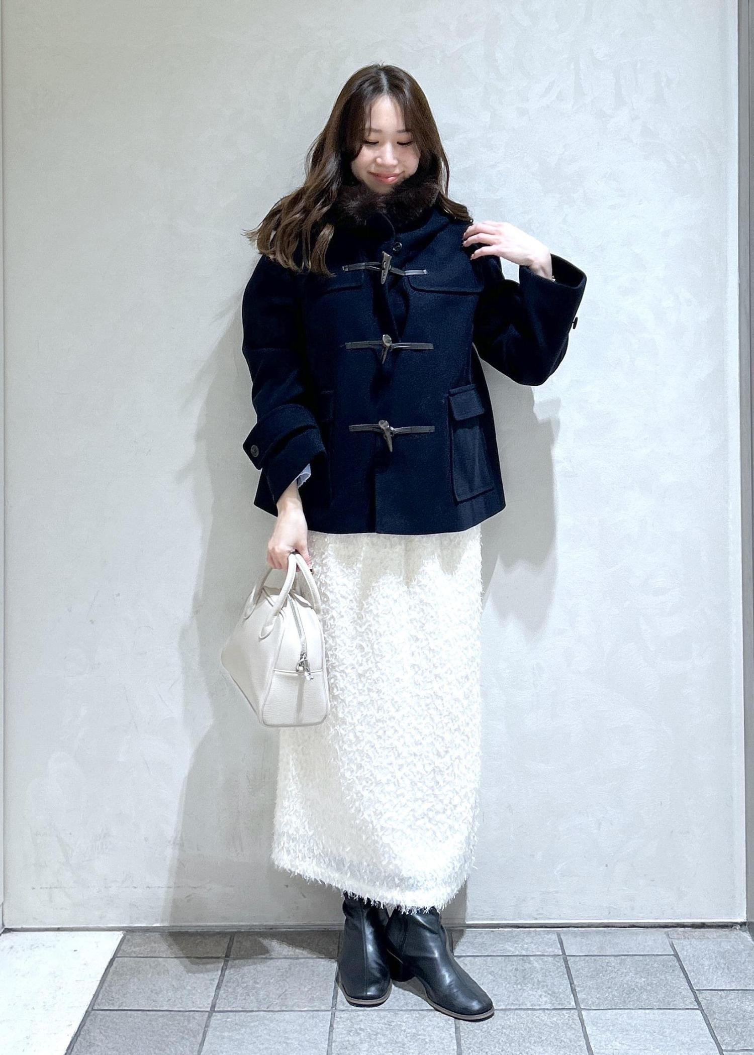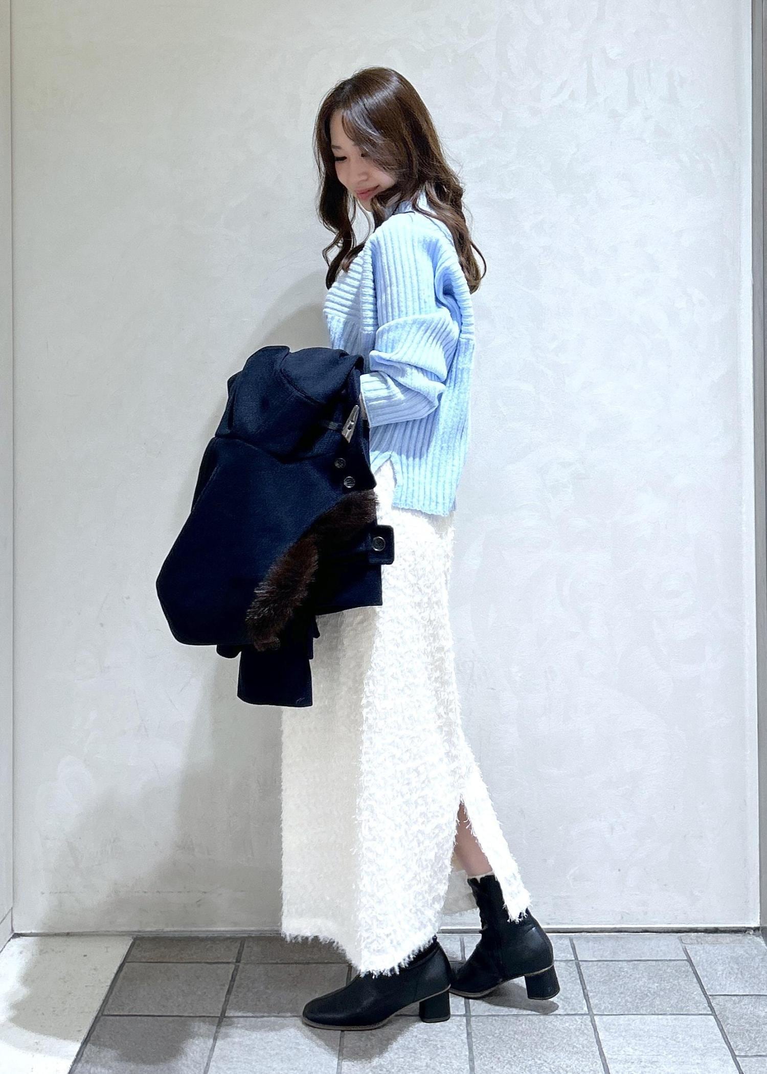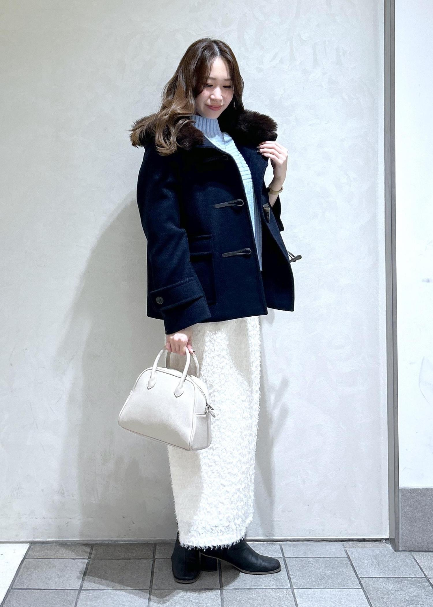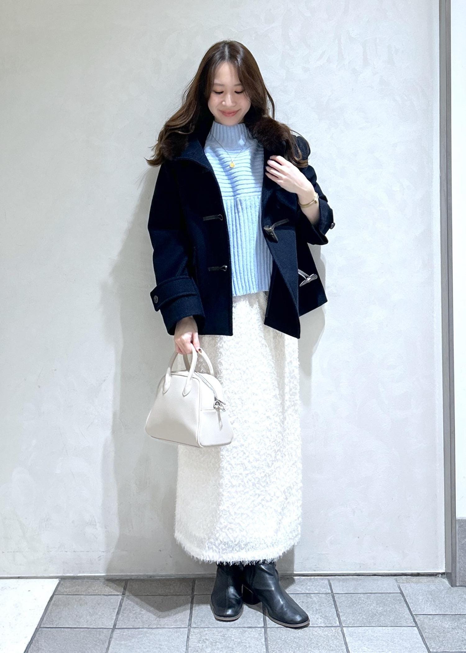 ブルーのニットにネイビーのダッフルアウターで冬のお出かけコーデスタイリングにしました。