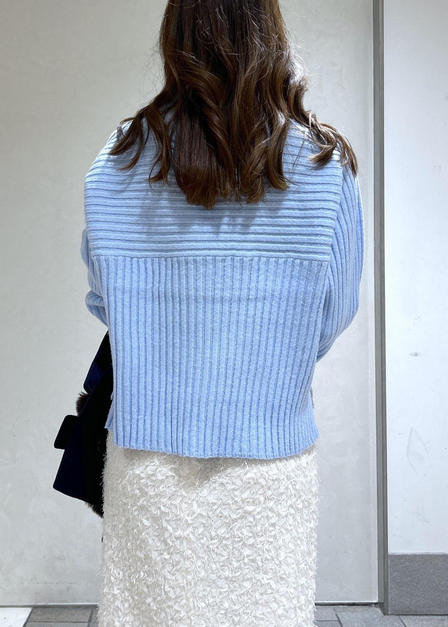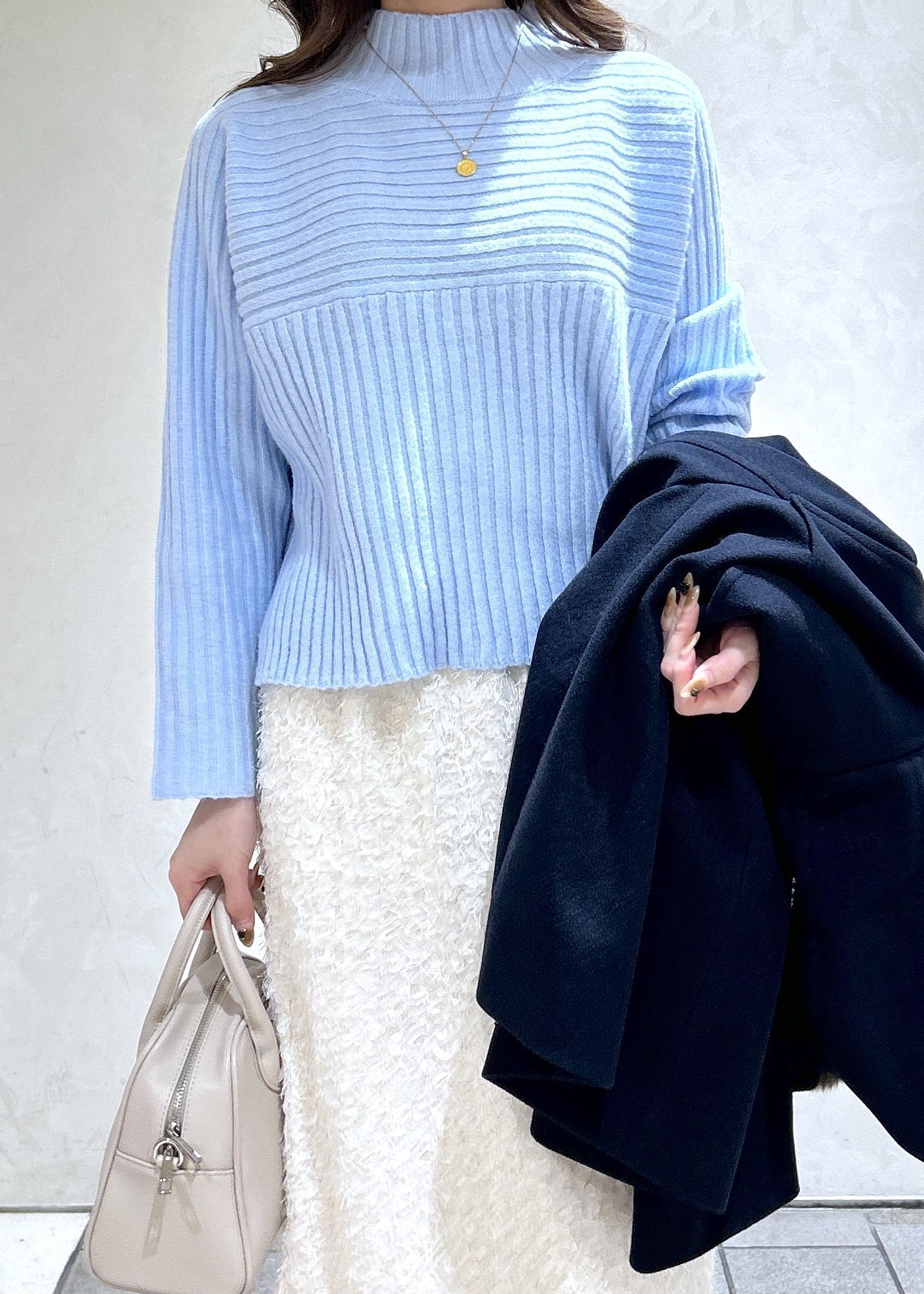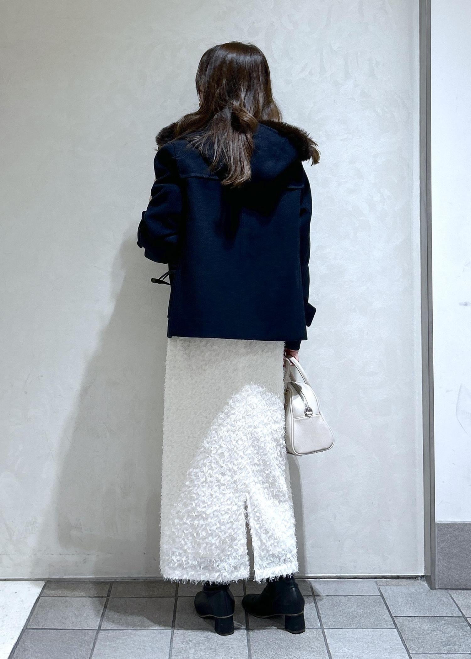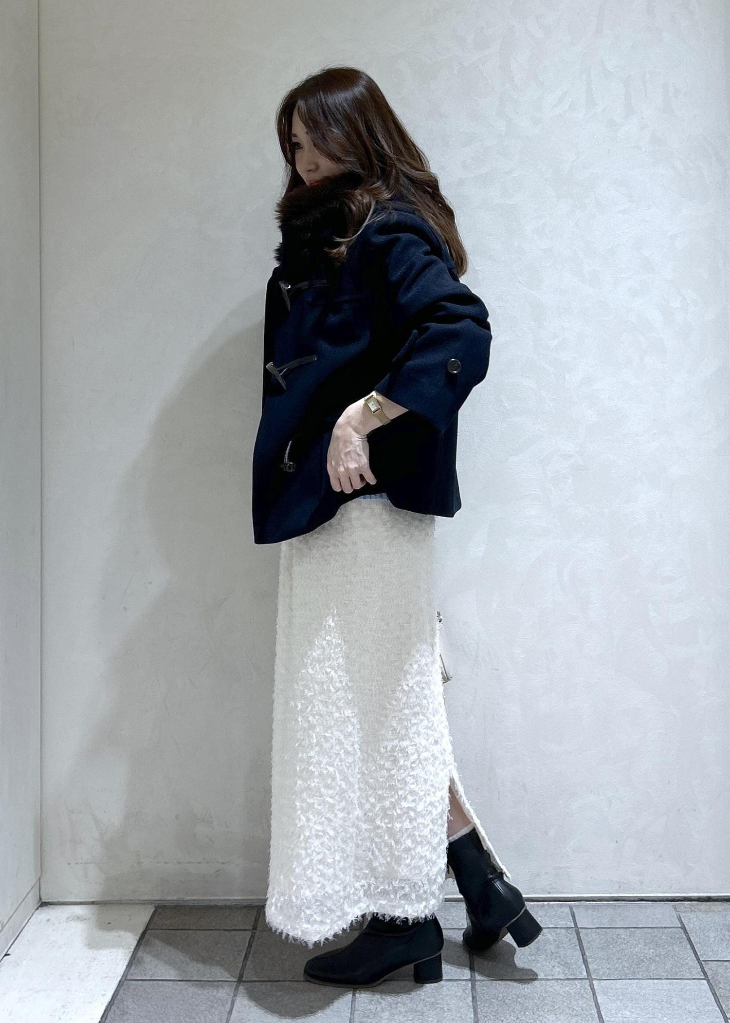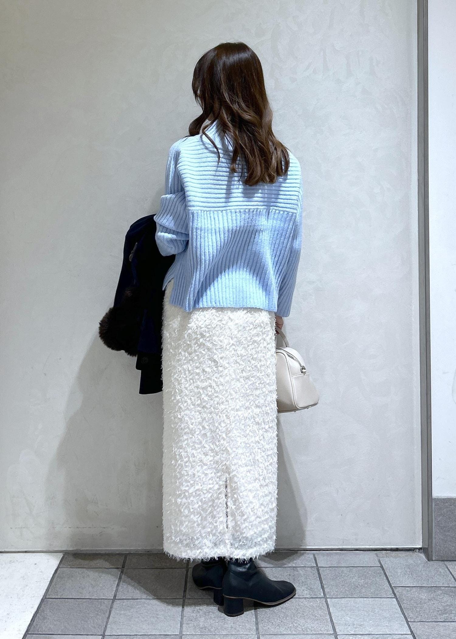ブルーのニットにネイビーのダッフルアウターで冬のお出かけコーデスタイリングにしました。