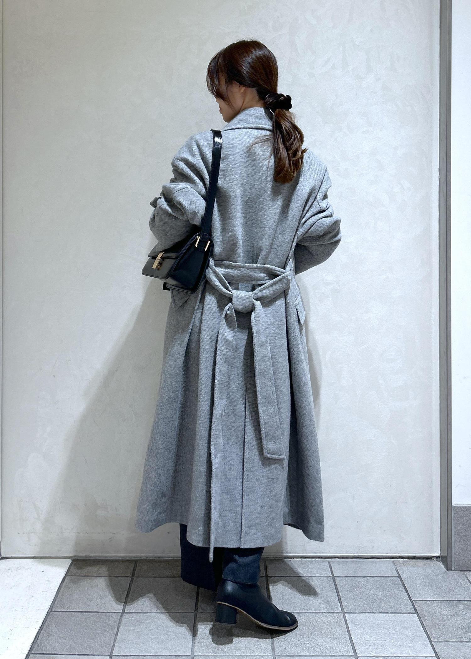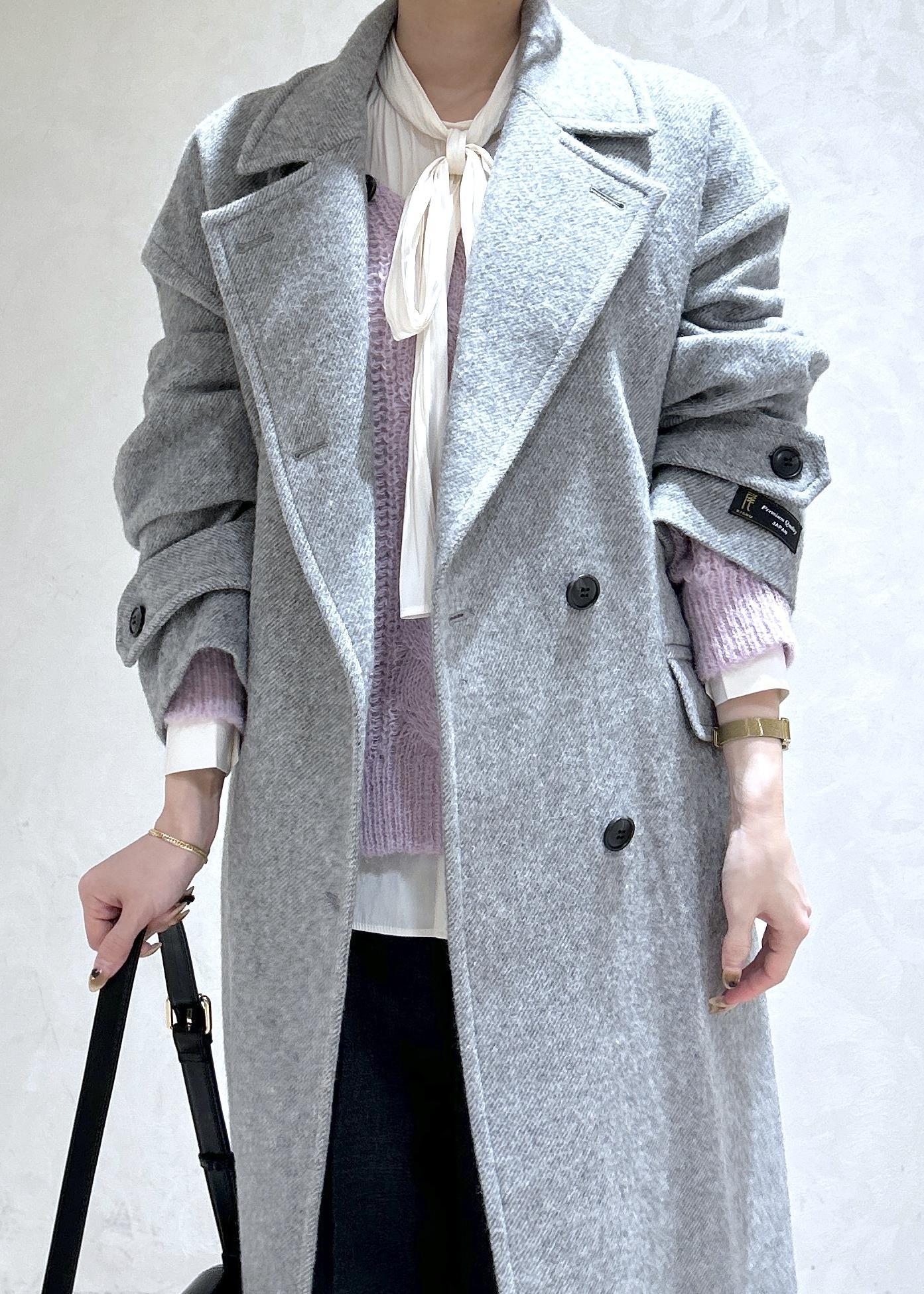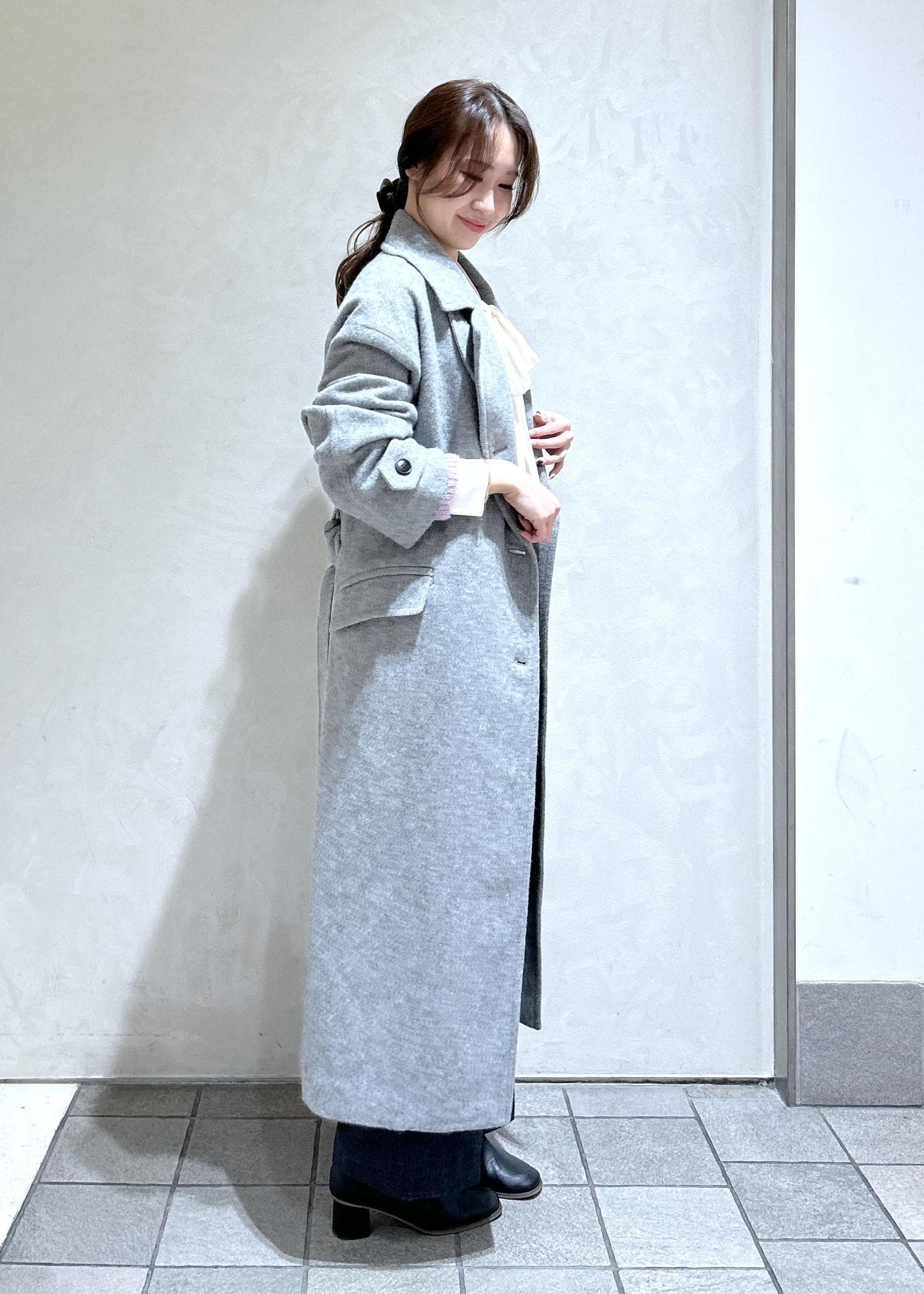 グレーのロングコートにインナーはピンク系でキレイめな冬スタイリングにしました。