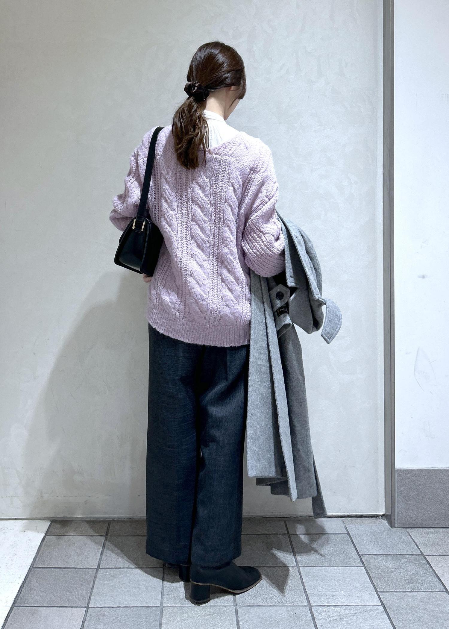 首元のあきが気になる方は、中にシャツやTシャツなどレイヤードスタイルがおすすめです。