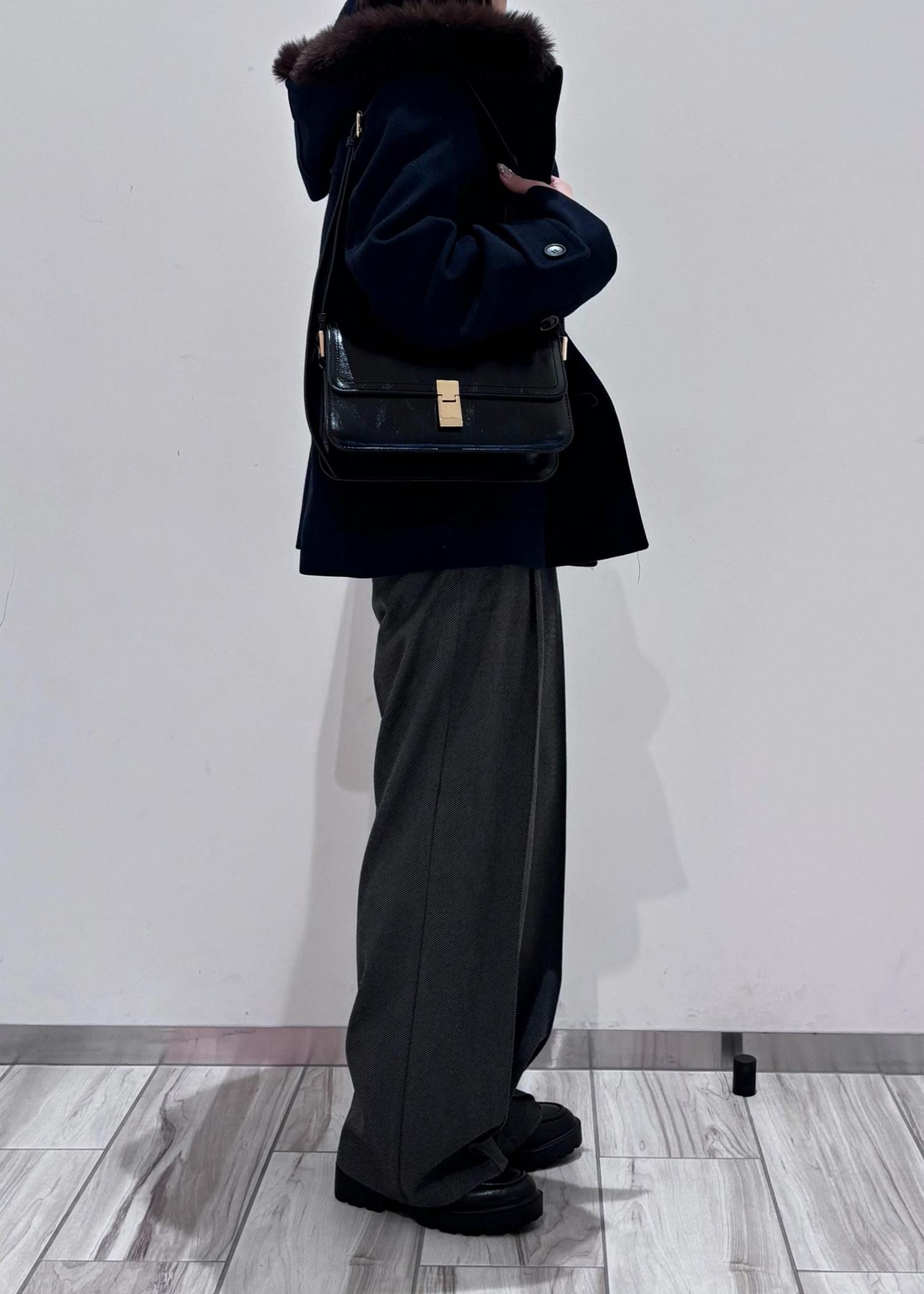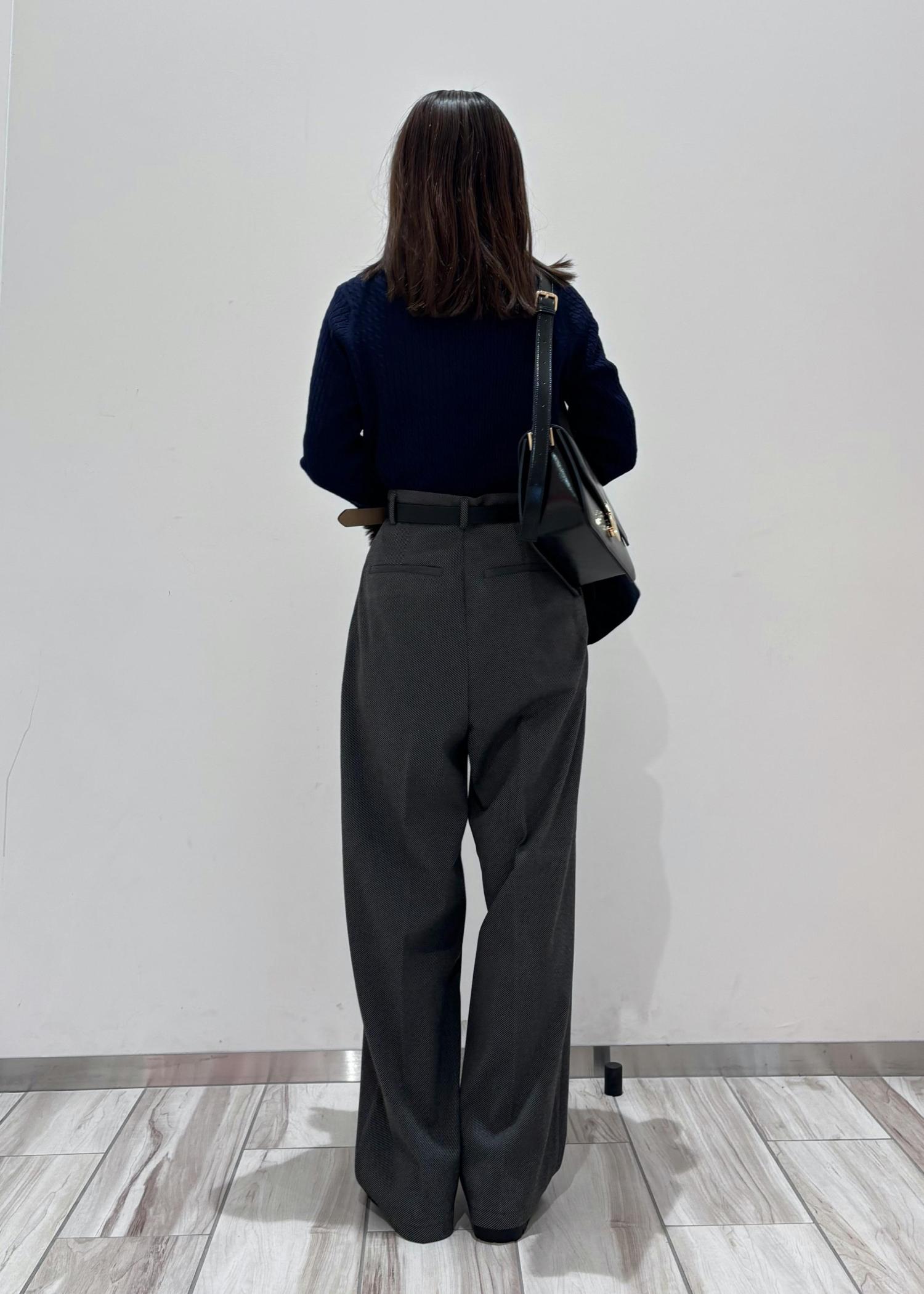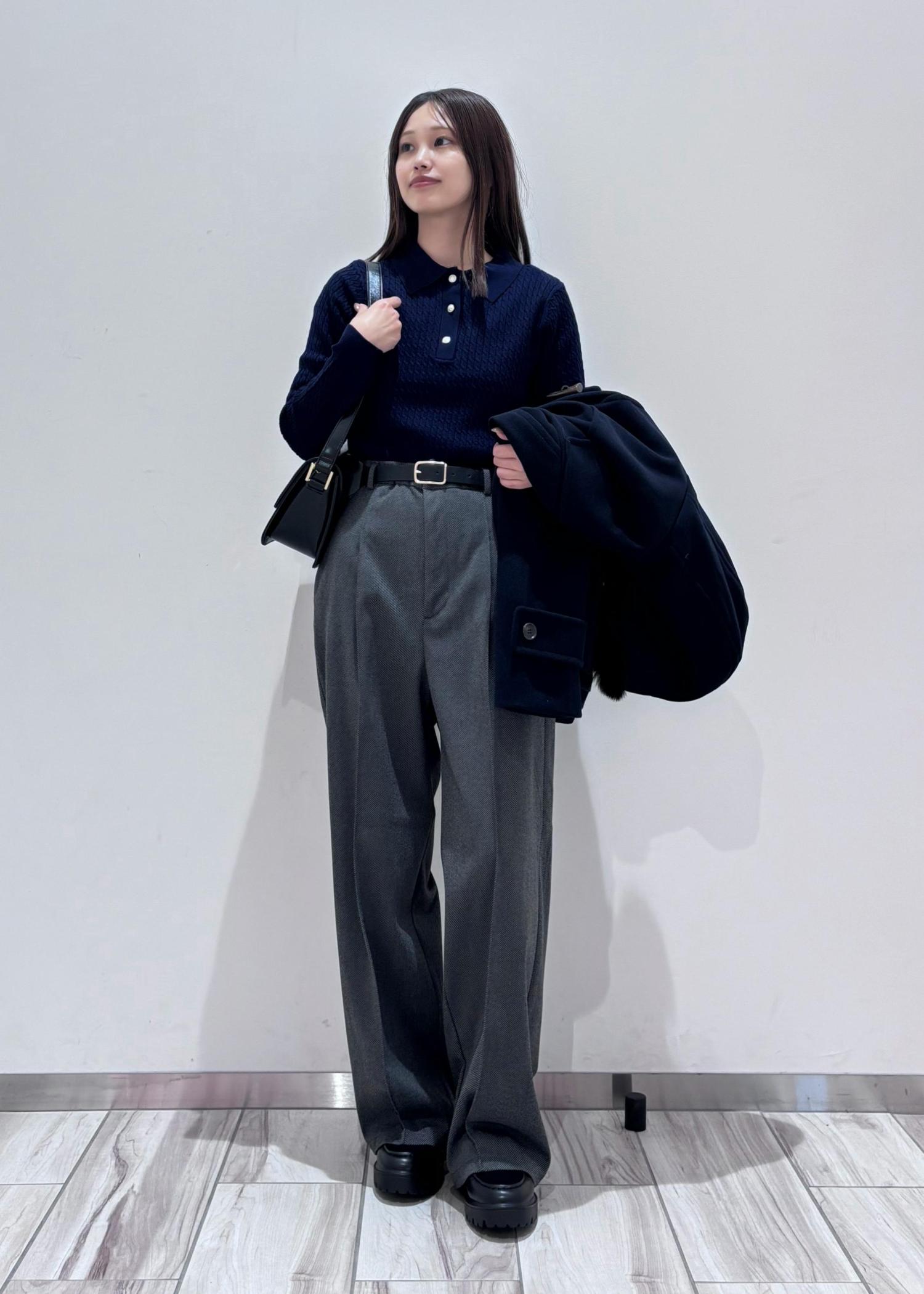ネイビーの襟付きトップスと、グレー系の同系色でまとめてみました◎ 真っ黒よりも重たすぎないネイビーが清潔感とお肌を白く明るく見せてくれるグラデーションコーデ♪