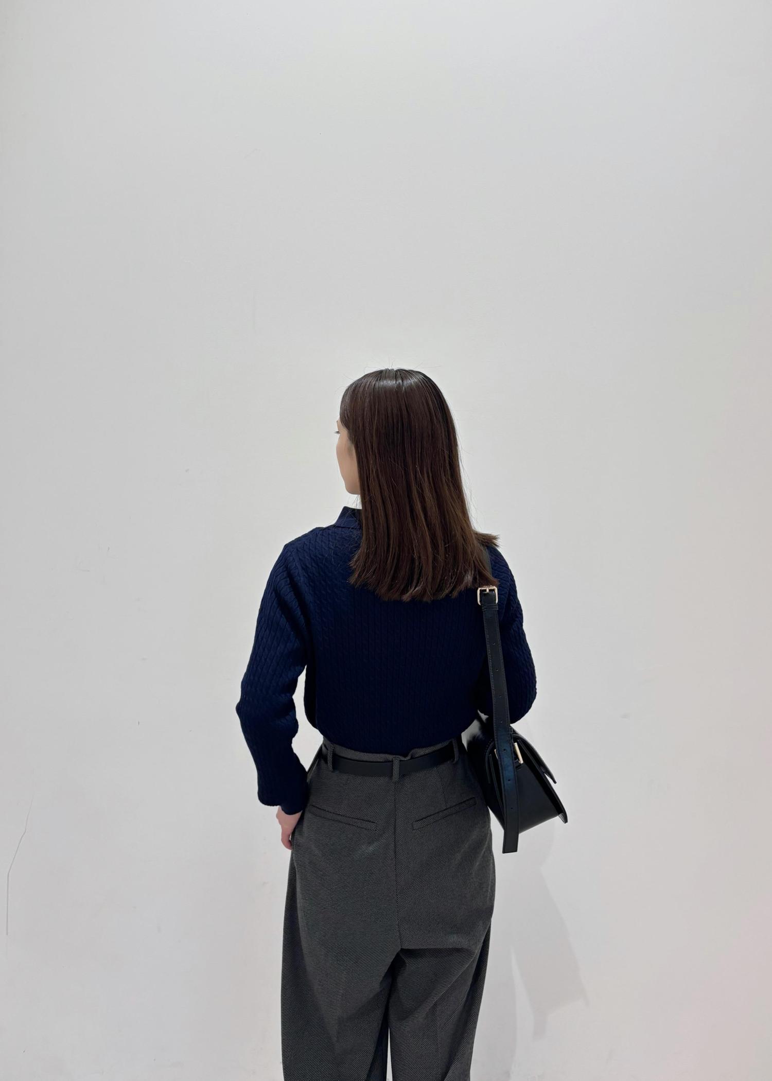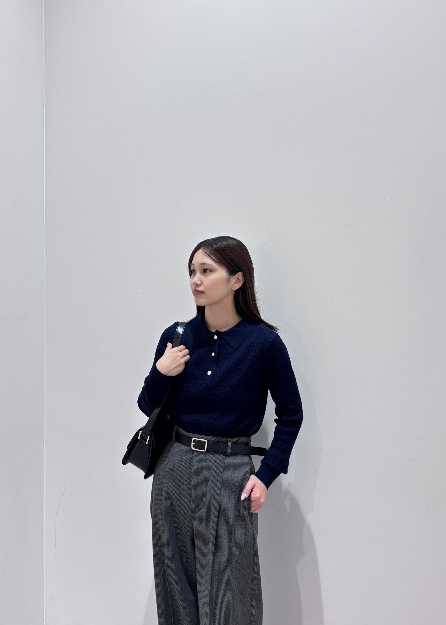 ROPÉ PICNICポロカラーミニケーブルニット/イージーケアネイビー / F¥5,489レビュー程よいケーブルあみと、サイズ感が体のラインを綺麗に拾ってくれます。襟付きなのできちっとかんもあり、一枚着でも、上にアウターを羽織っても様になる一枚です。