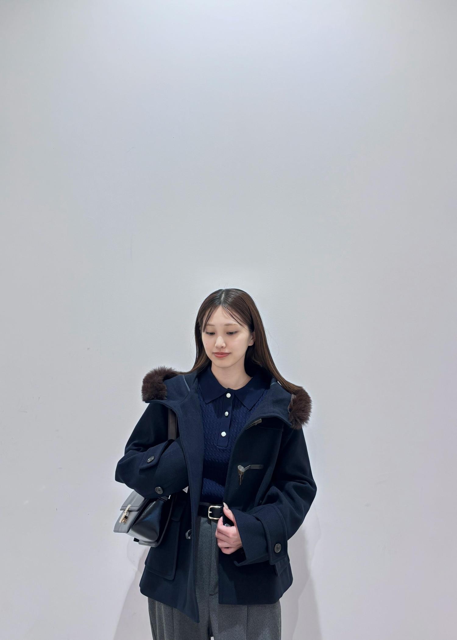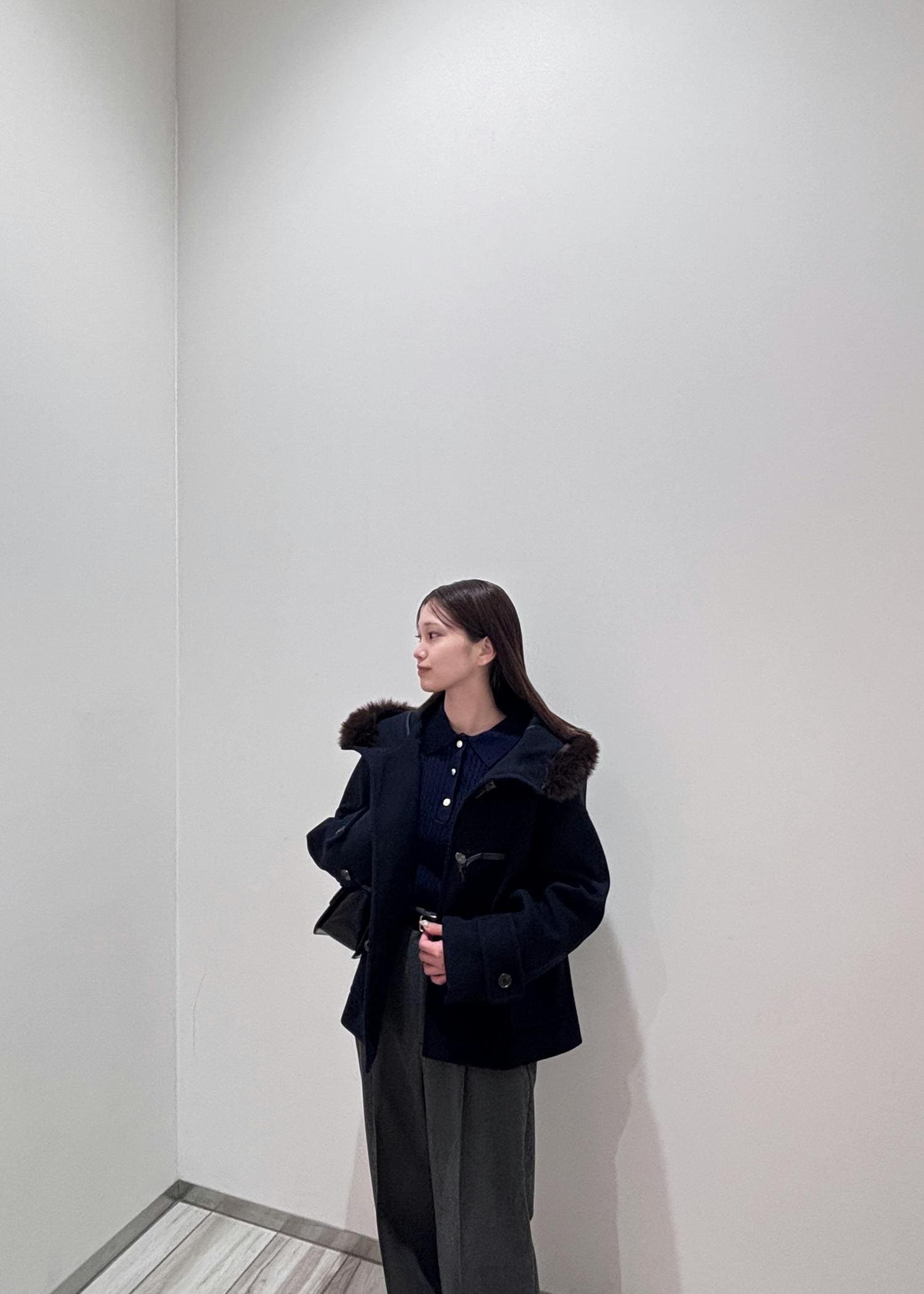 ROPÉ PICNICジャージーメルトンシリーズ ファー付きショートダッフルコート/リンクコーデネイビー / M¥13,200レビュー154cmでMサイズ着用しました。丈はお尻にかかる程の丈感です。軽くサラッと羽織れるサイズ感が着やすく、車通勤の方にもおすすめです◎