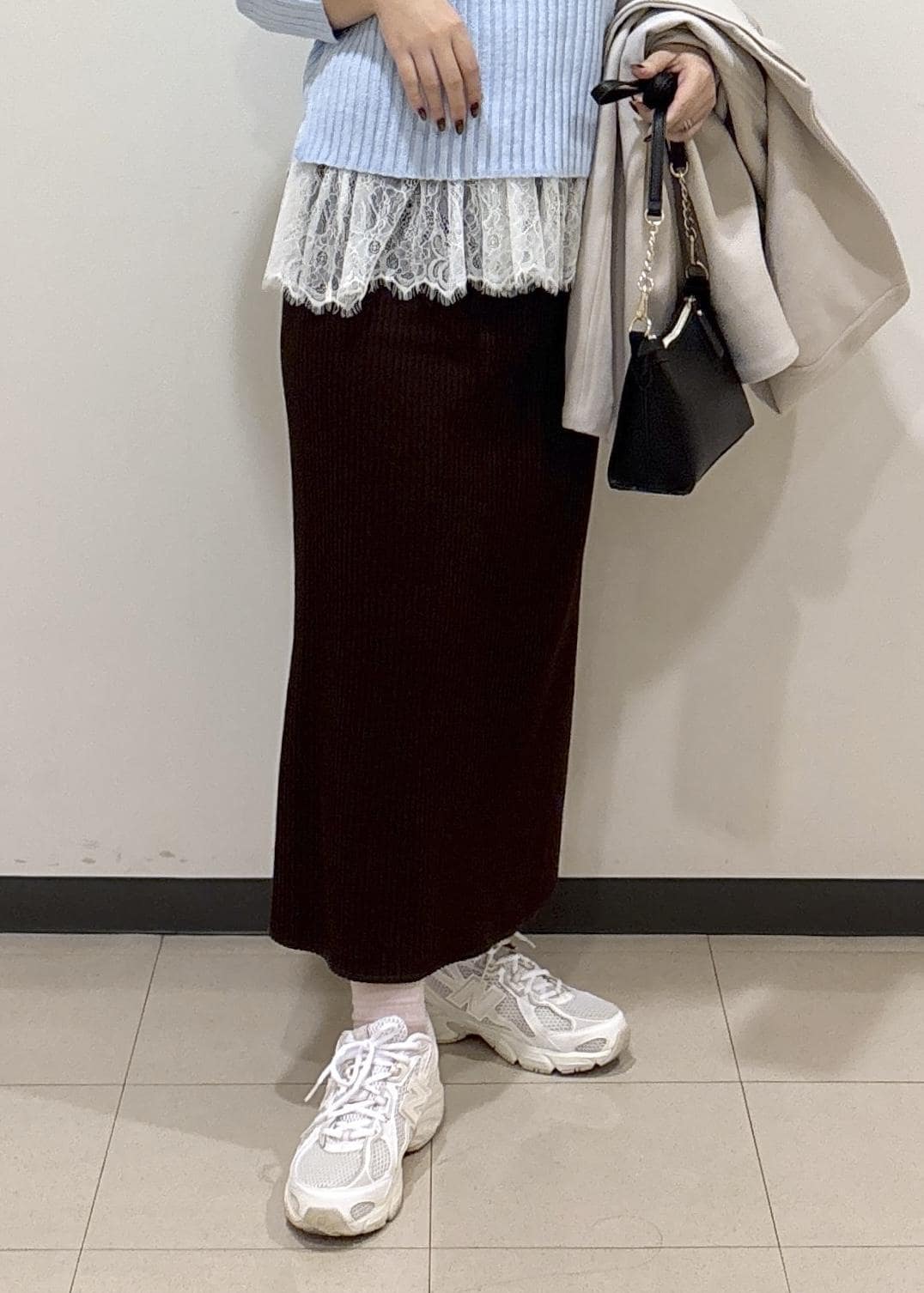 ROPÉ PICNICトタンテレコ Iラインリブニットスカートダークブラウン / 38¥4,499レビュー骨格ウェーブで下半身太めですが、しっかりした生地で太ももの肉感を拾いにくく着やすいです。