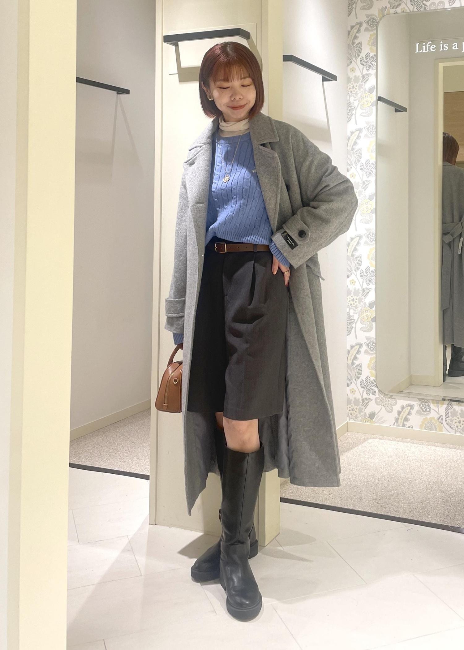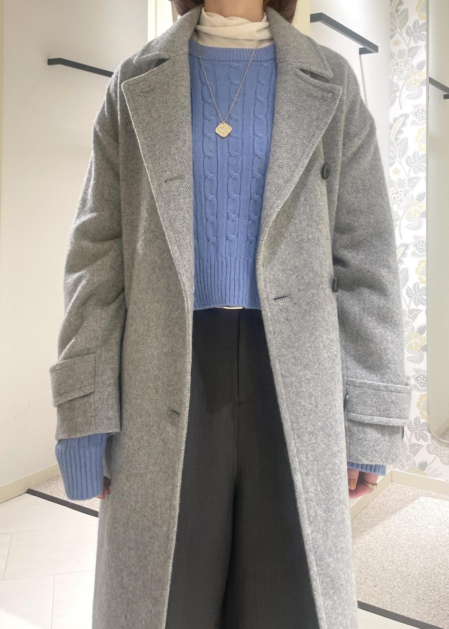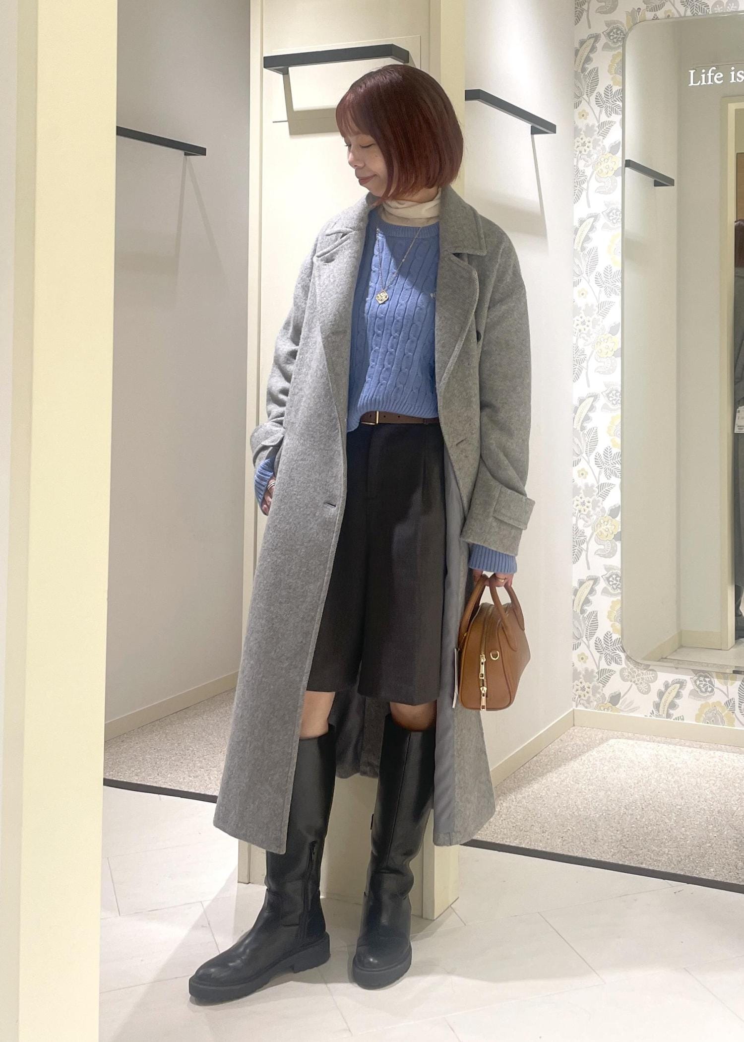 着丈は、膝下でロング丈ですが、ボタンやポケット位置が高く、ネックのデザインもあり、重量感を感じずバランス良く着て頂けます。