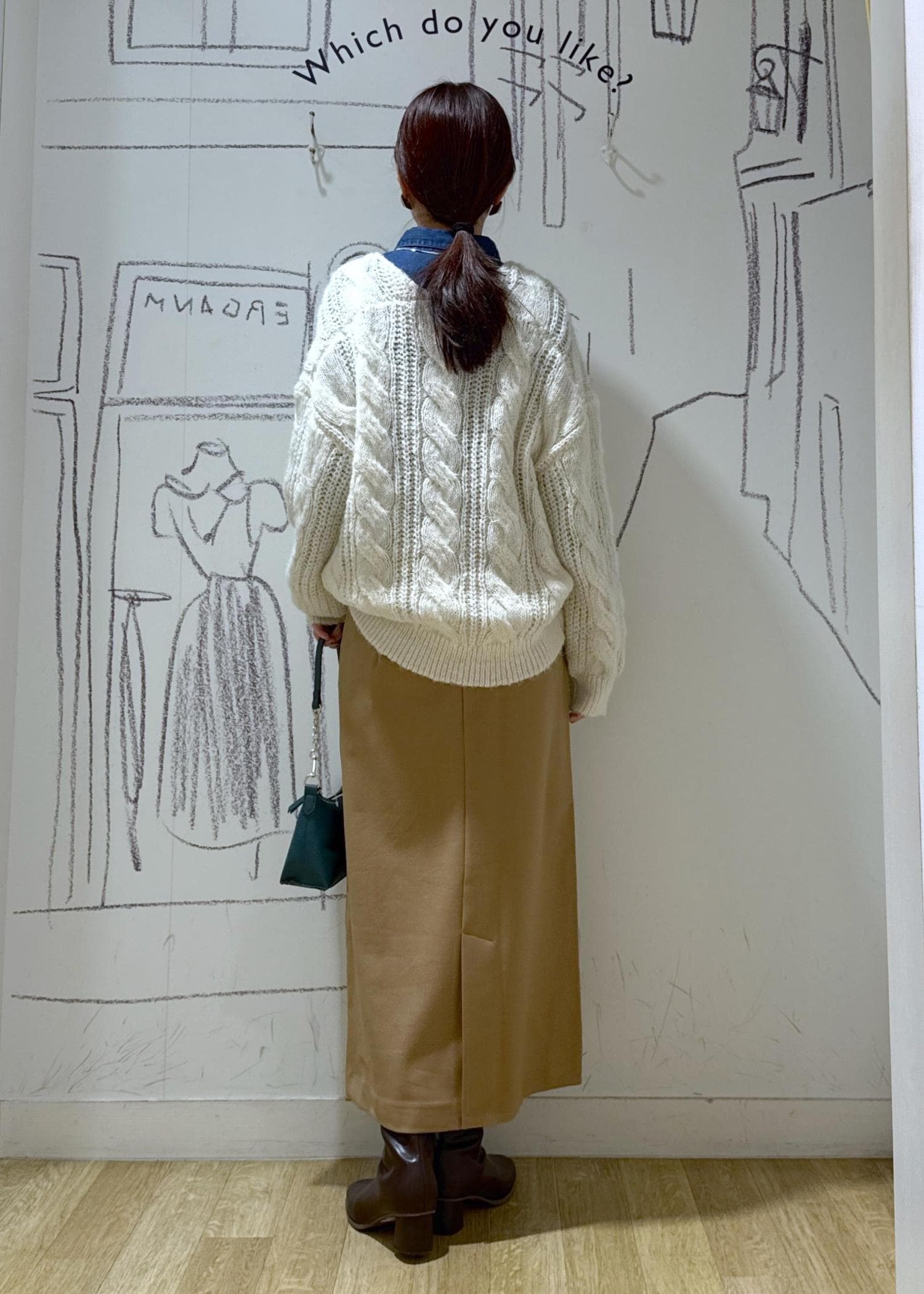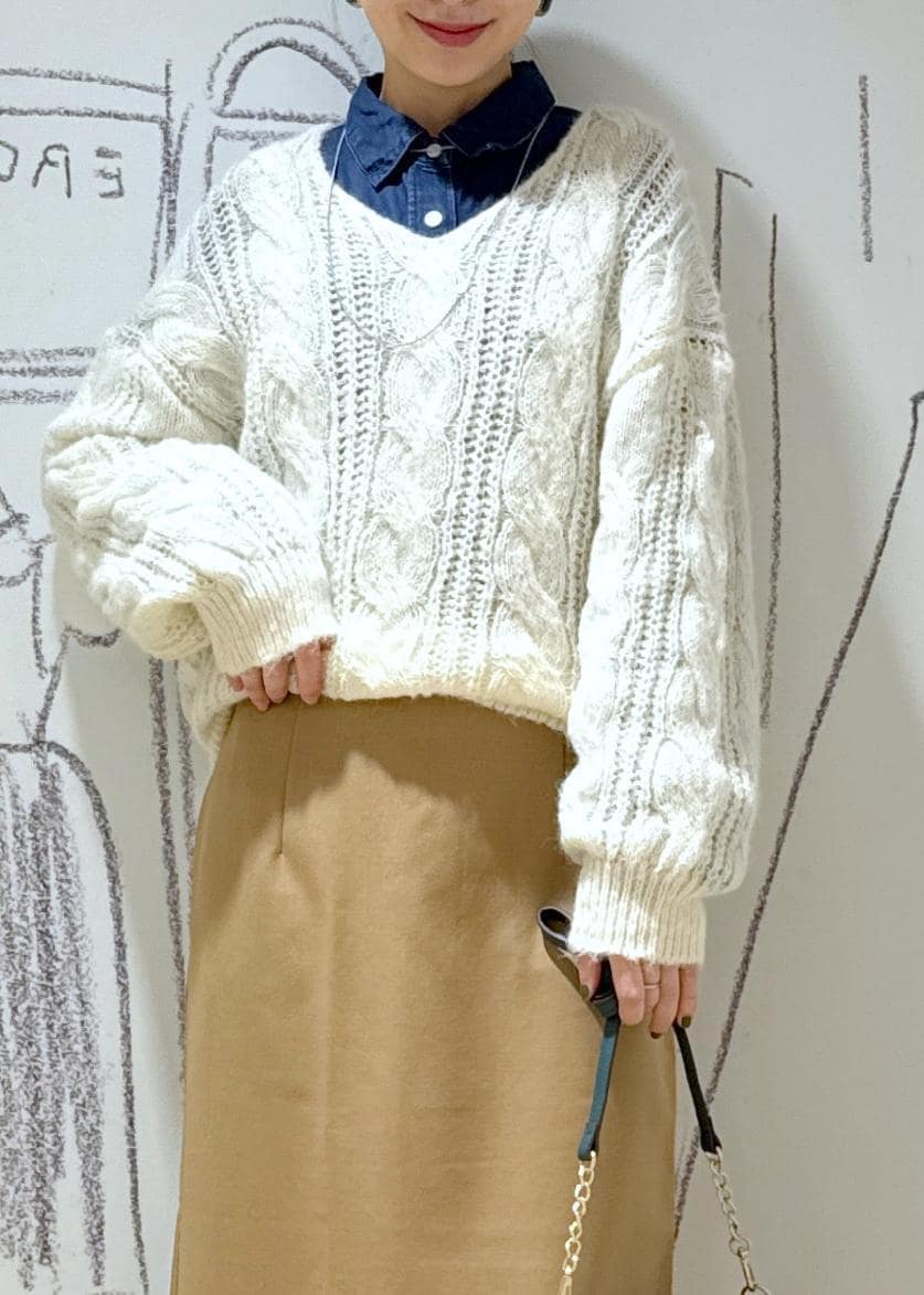 ROPÉ PICNICゆるケーブル編みVネックニットキナリ / F¥5,489レビュー緩めの編み方なので透けがあり、レイヤード必須。身幅・袖幅共にゆったりしているのでリラクシーな一枚。袖は長めでたぽっとボリュームが出るのが可愛いです。