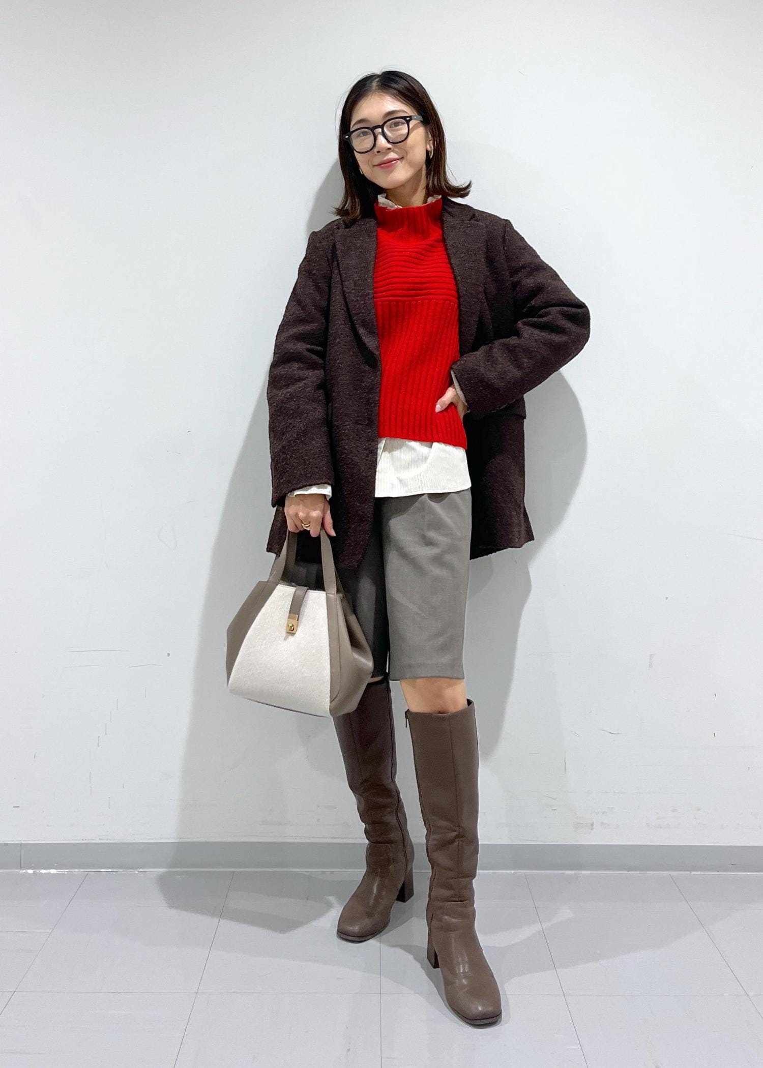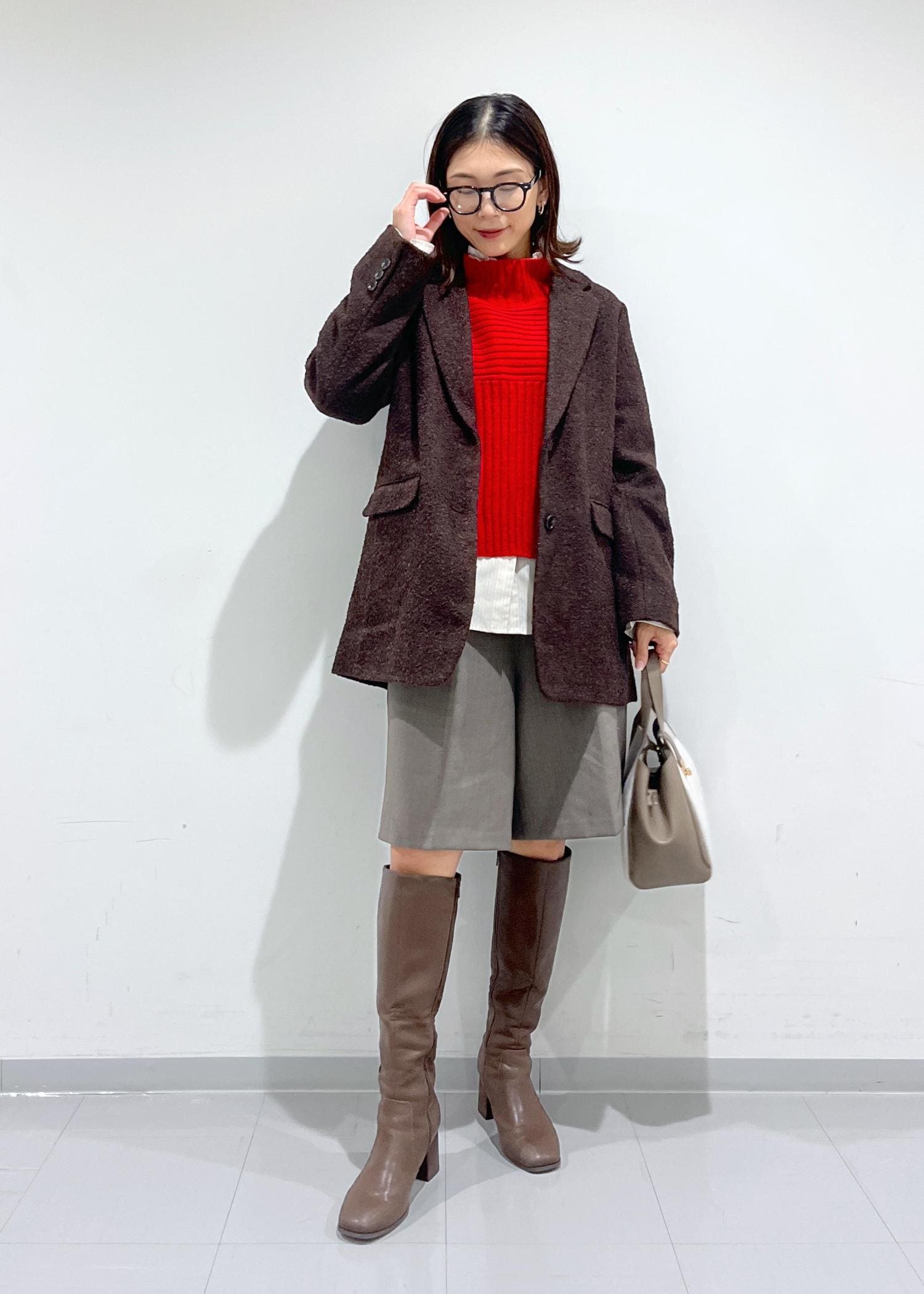 重ね着の多い時期、コーディネートが難しいカラーニットですがブラウンやベージュでまとめることで、上品さのあるカラーコーデに。