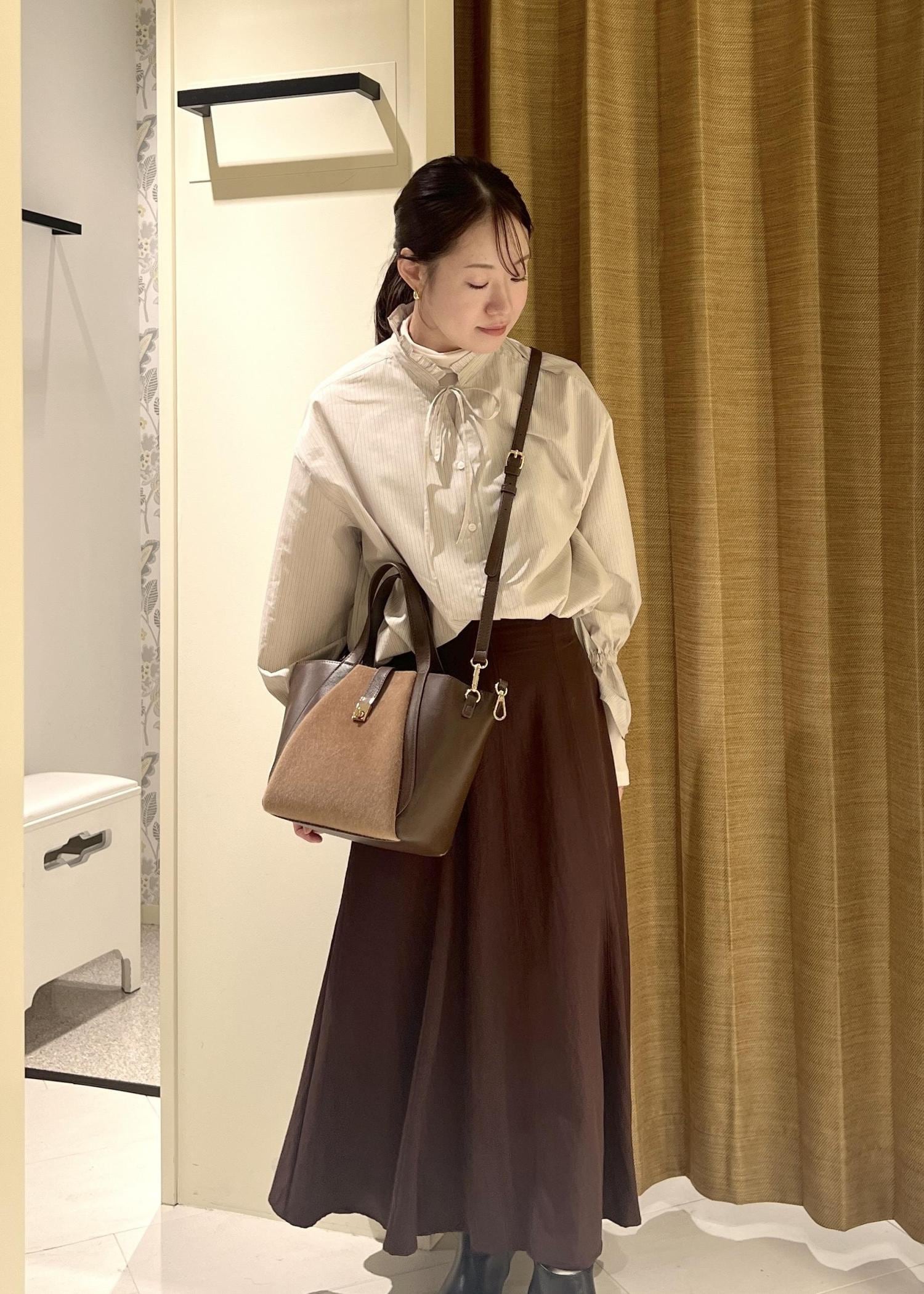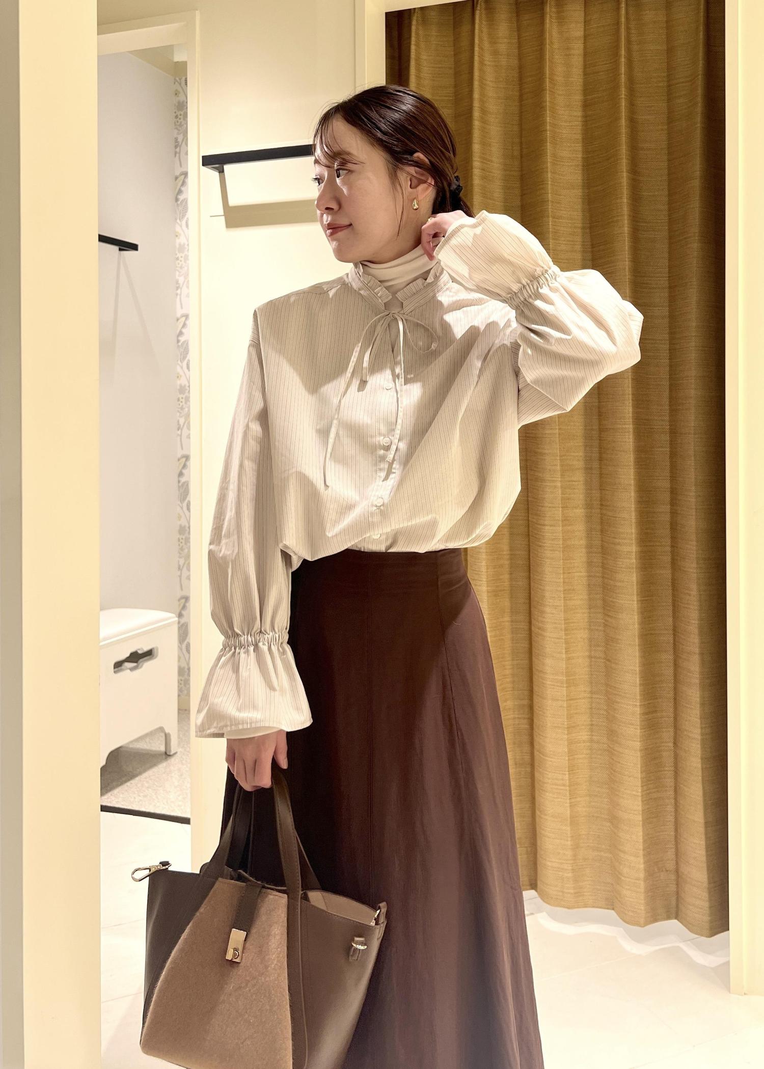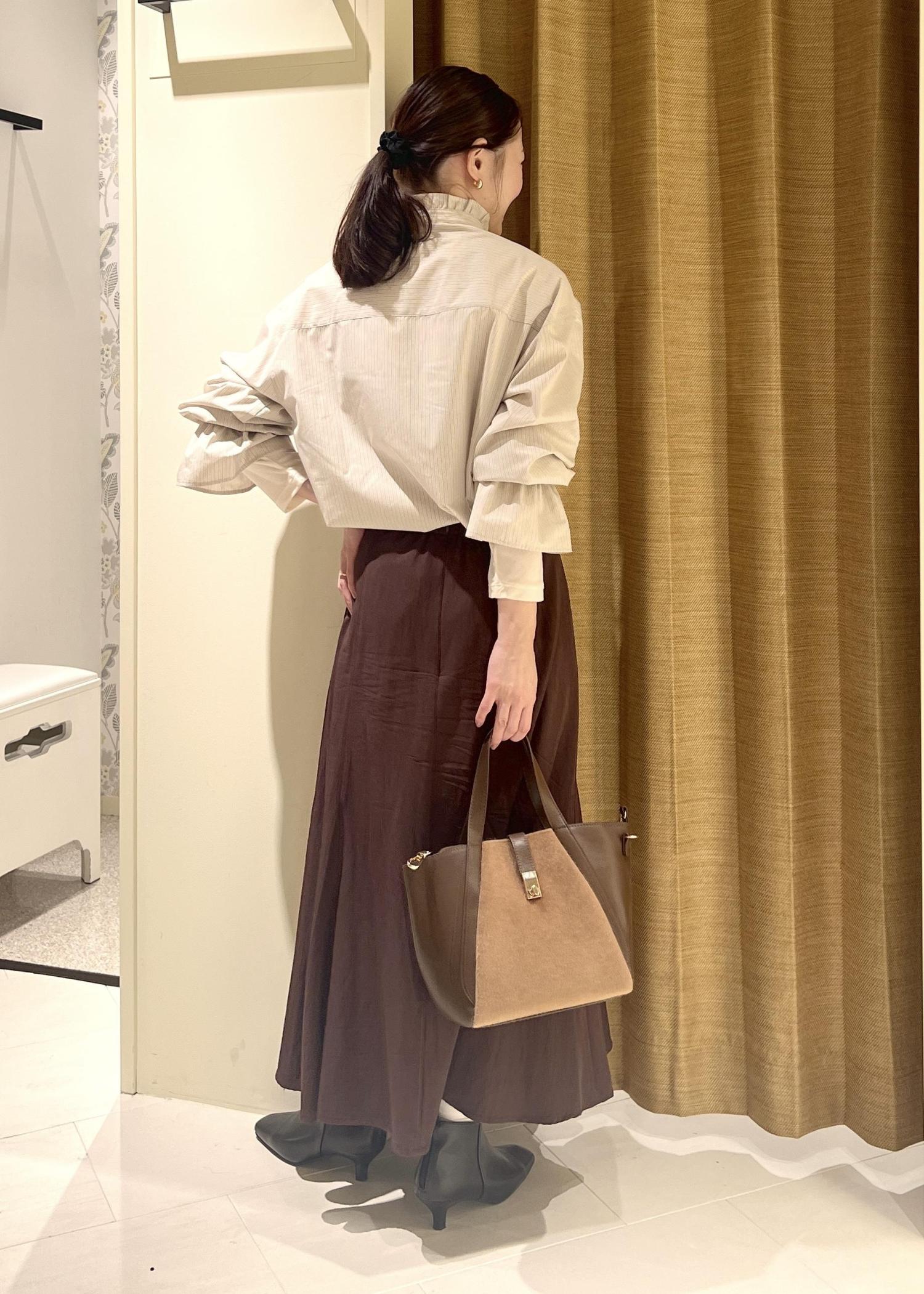 滑らかな素材で揺れ感があり、女性らしいスタイリングにぴったり。