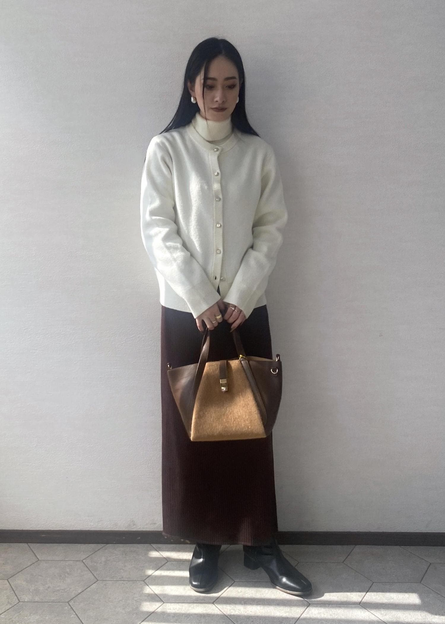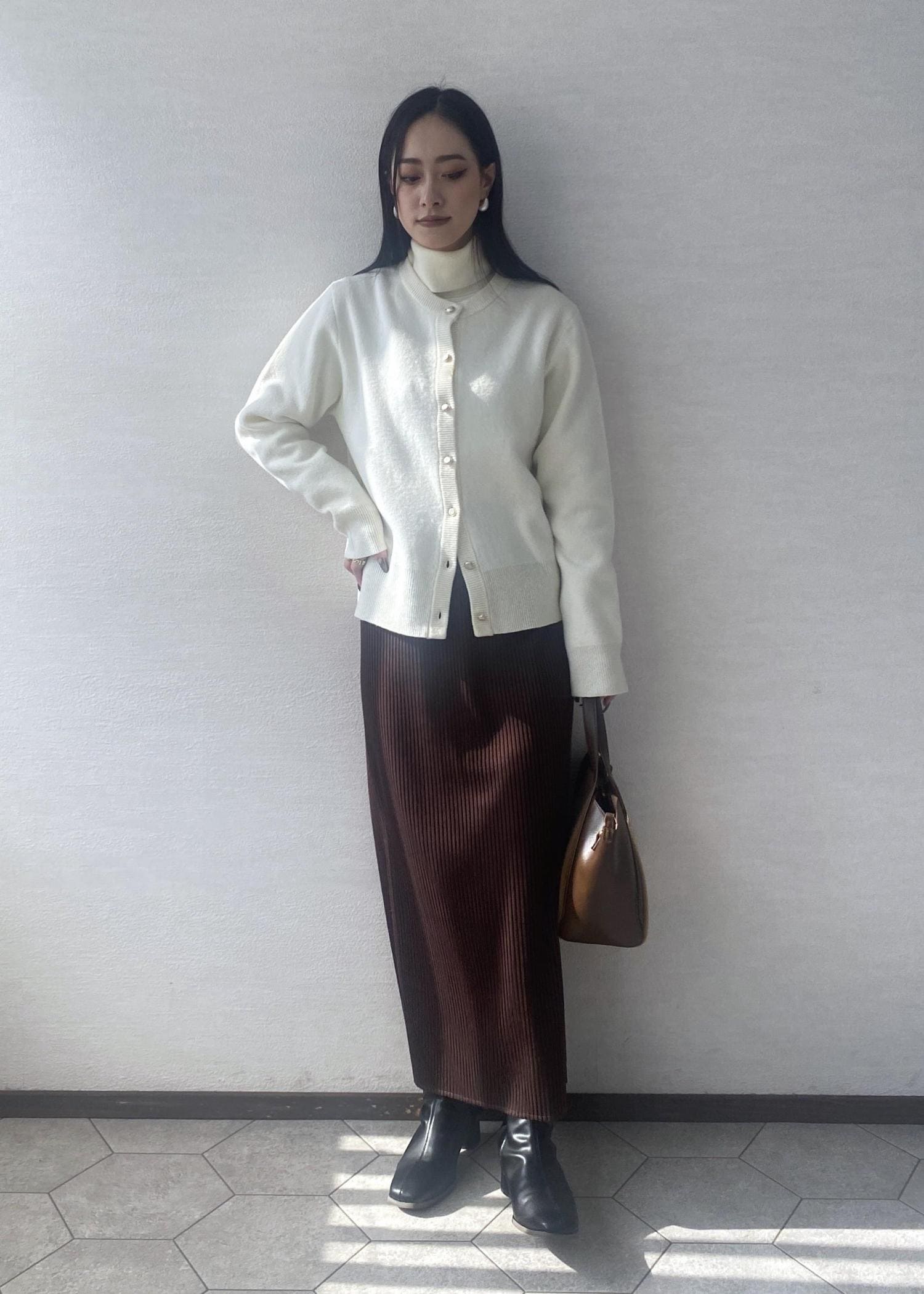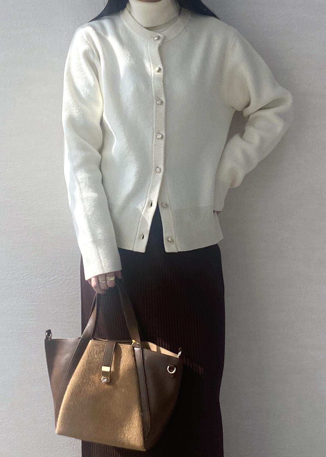 ウール混の軽くて暖かいニットカーディガンにブラウンが差し色のスカートを合わせたお出かけにぴったりなコーディネートです。