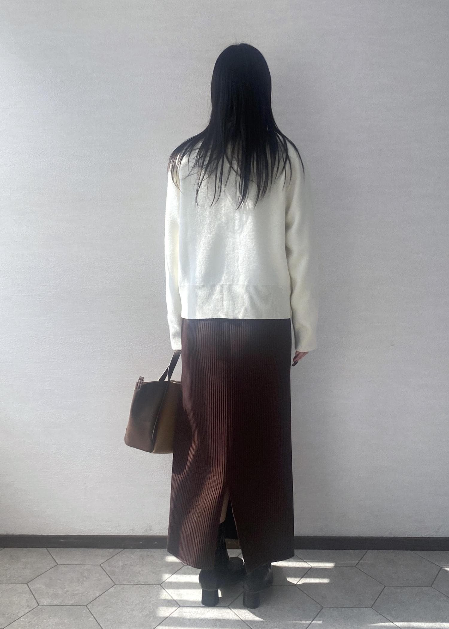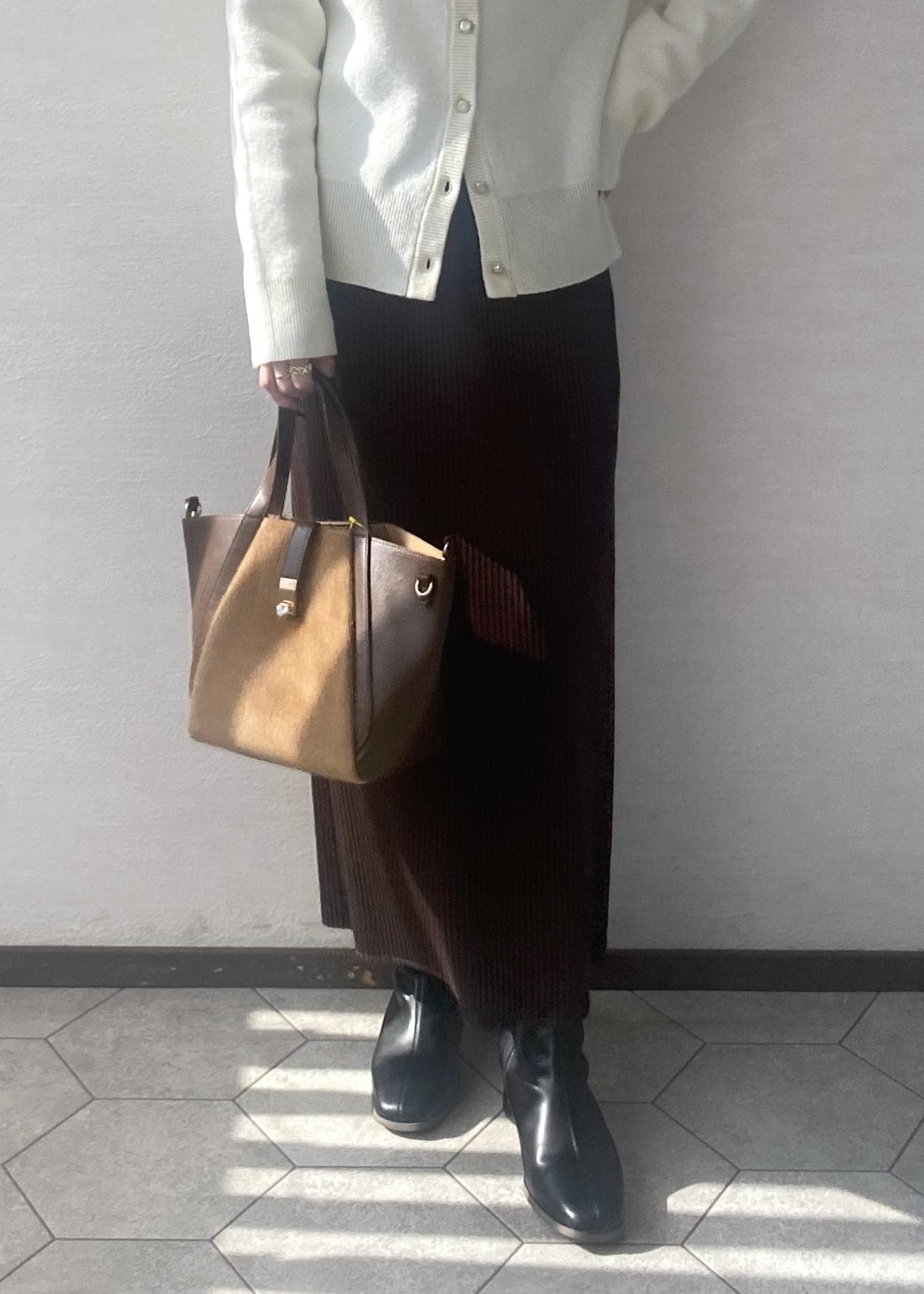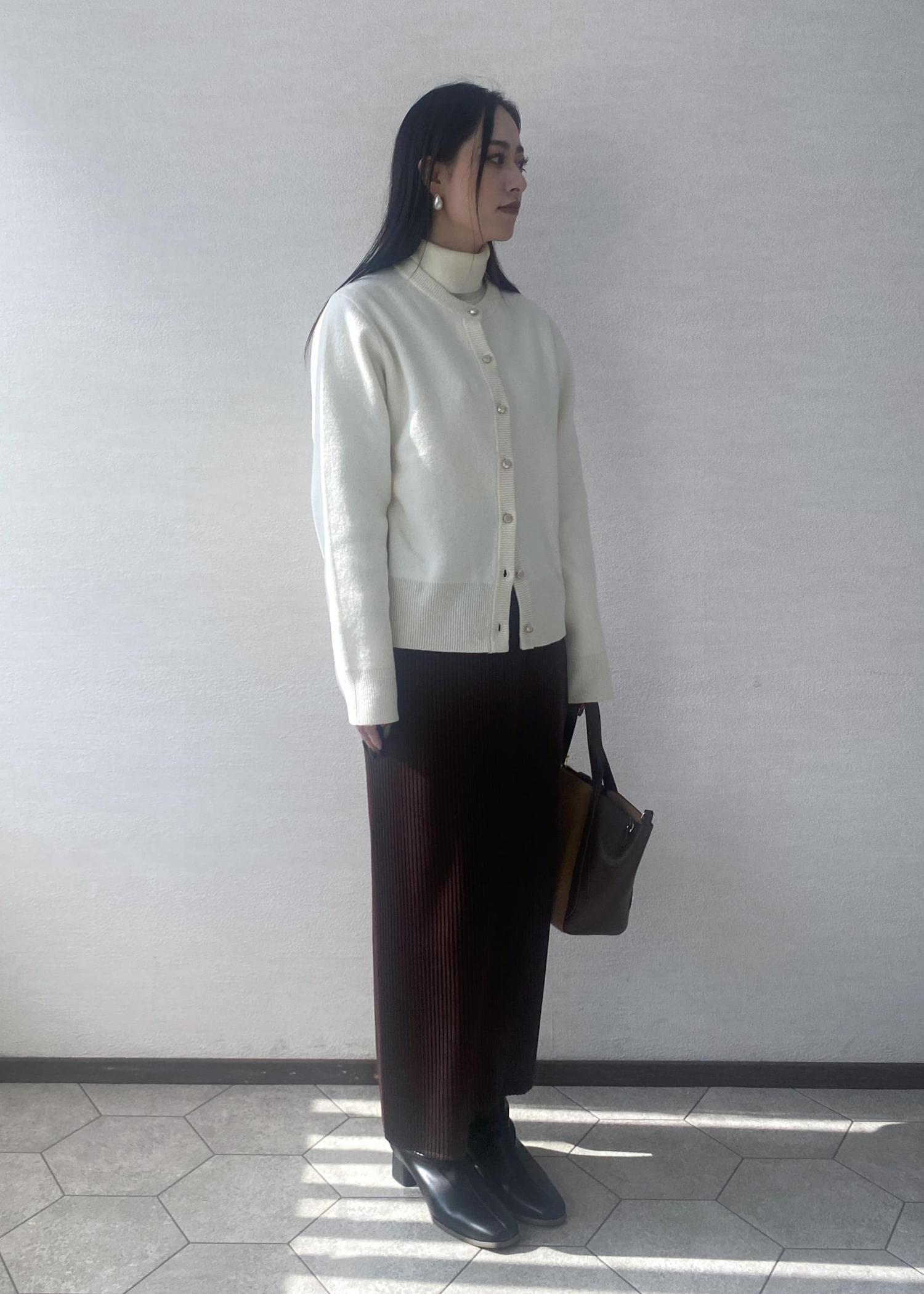 ウール混の軽くて暖かいニットカーディガンにブラウンが差し色のスカートを合わせたお出かけにぴったりなコーディネートです。