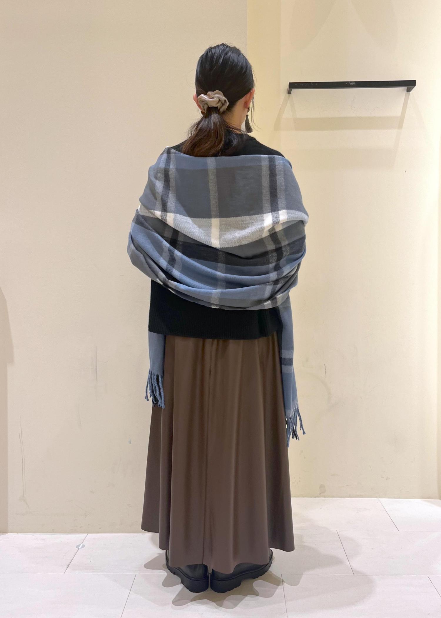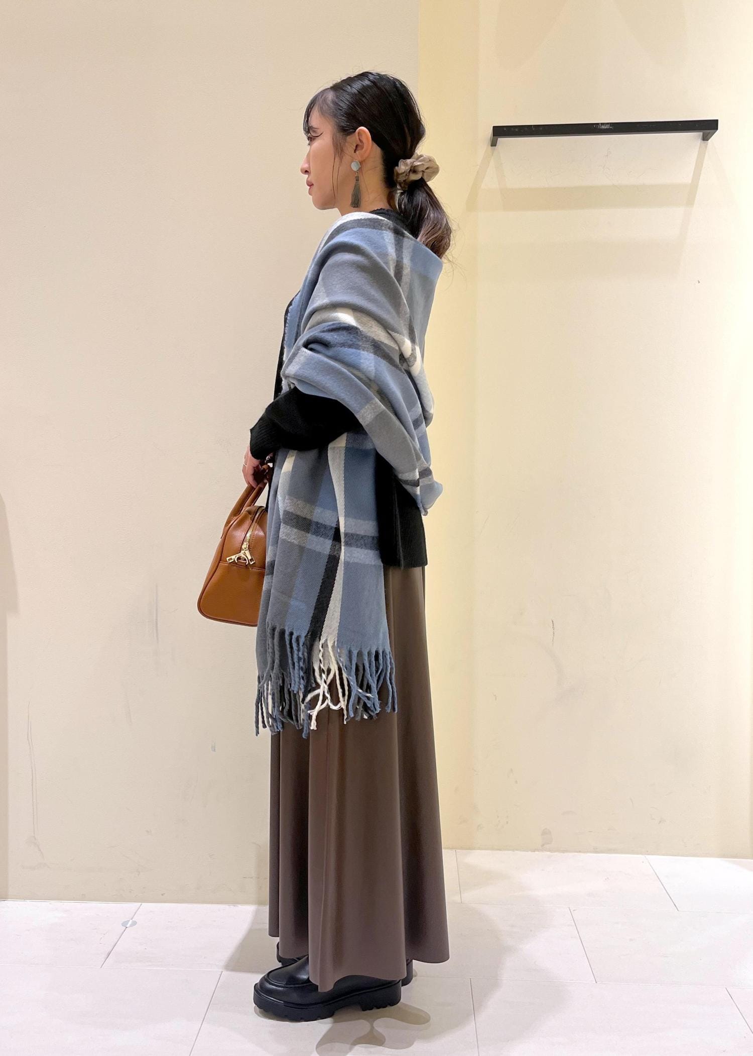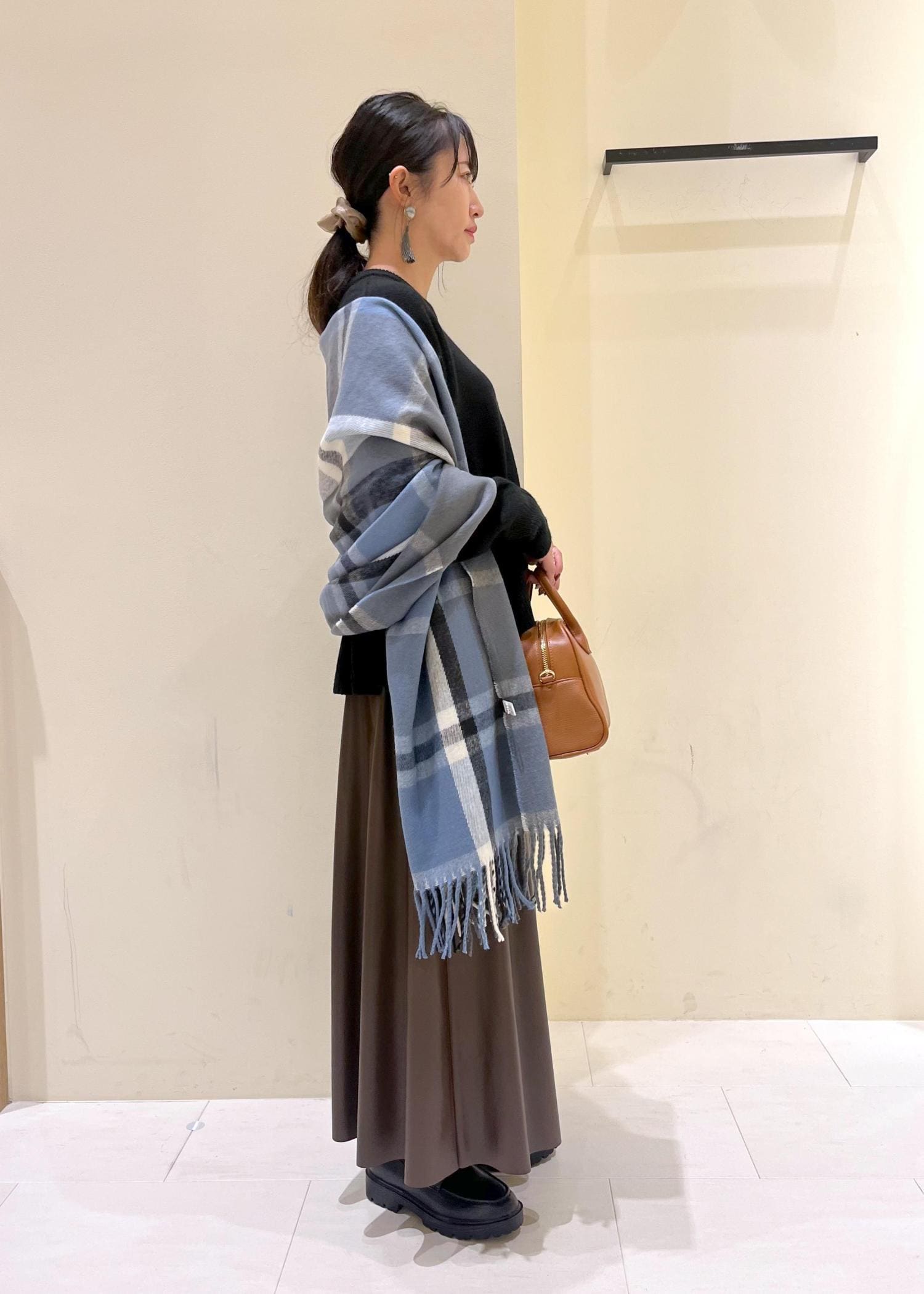ブラウン、ブラックのワントーンコーデにブルー系のストールを差し色に入れました◡̈