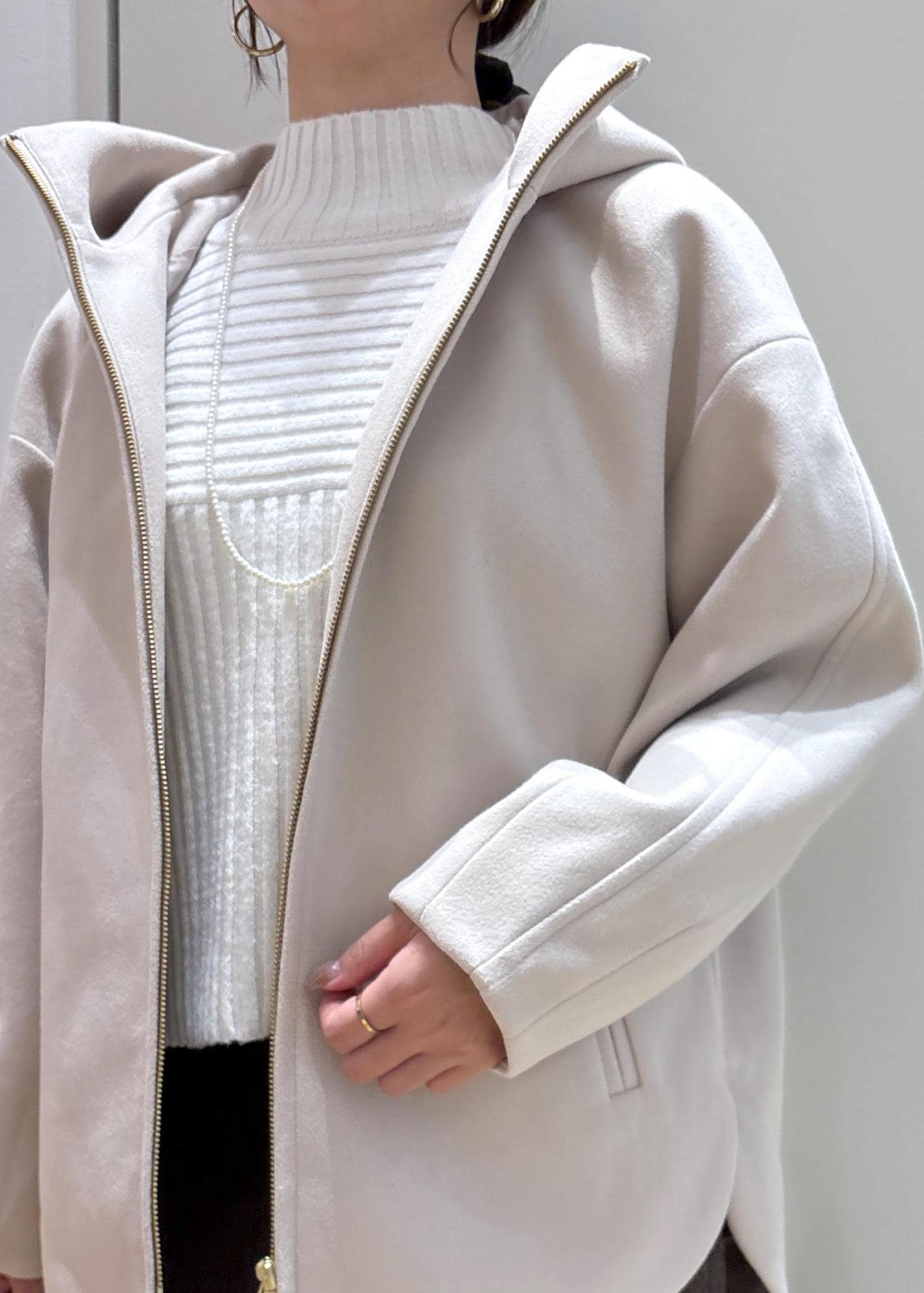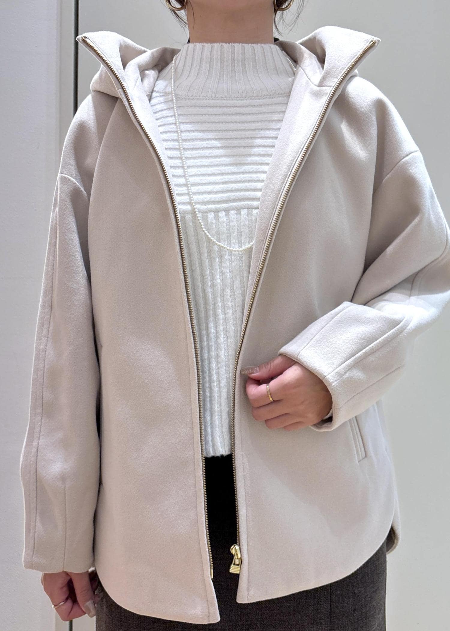 毎年人気のジップアップフーディーのコートはカジュアルにもきれい目にも合わせやすくおすすめです◎