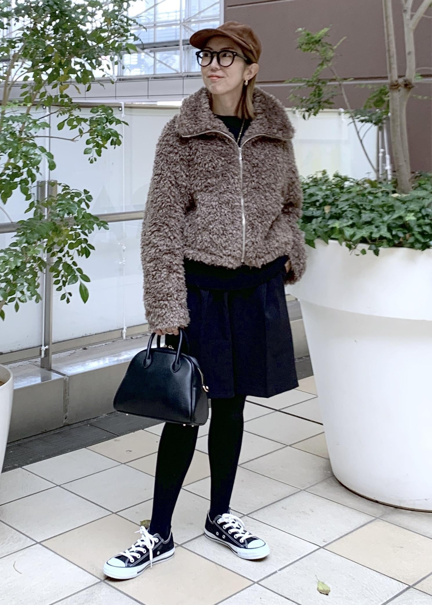 シンプルなブラックコーデに羽織ると大人も着やすいスタイリングに…