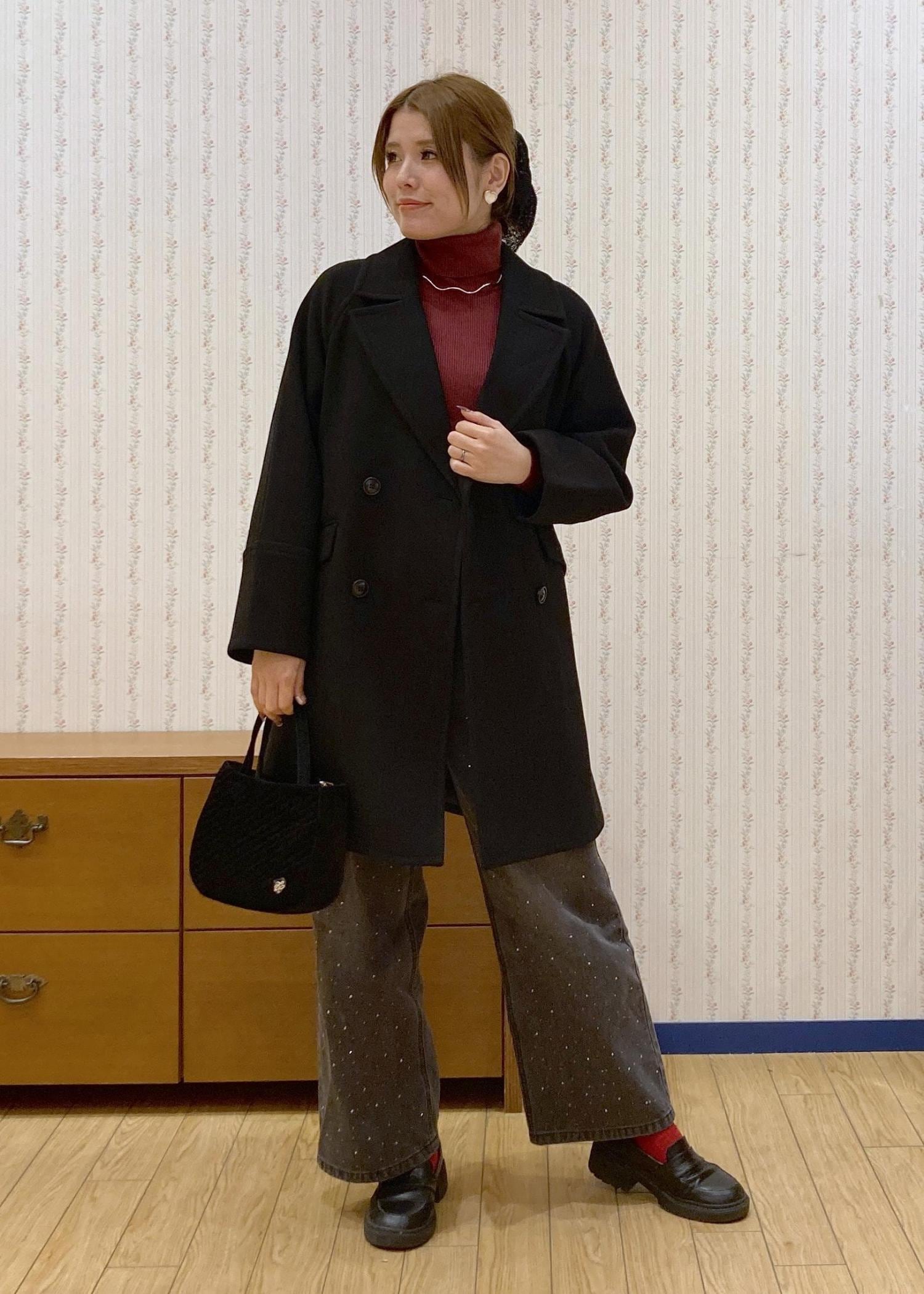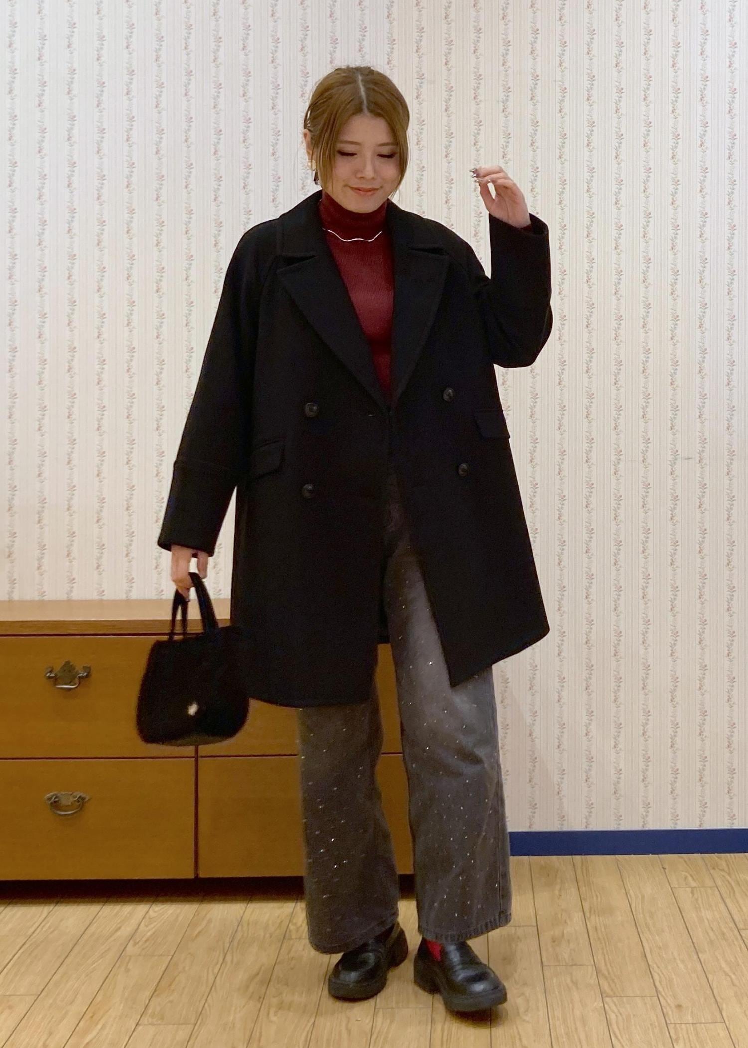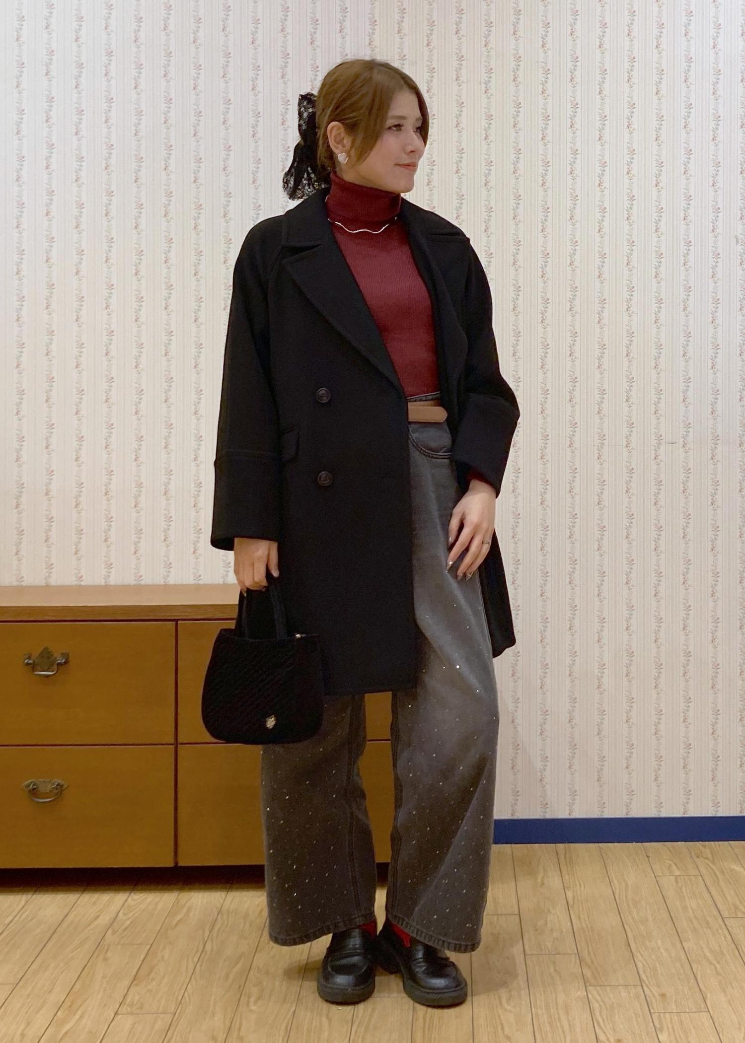 キレイめなコートにカジュアルなデニムを合わせて抜け感をプラスしたのがポイントです。