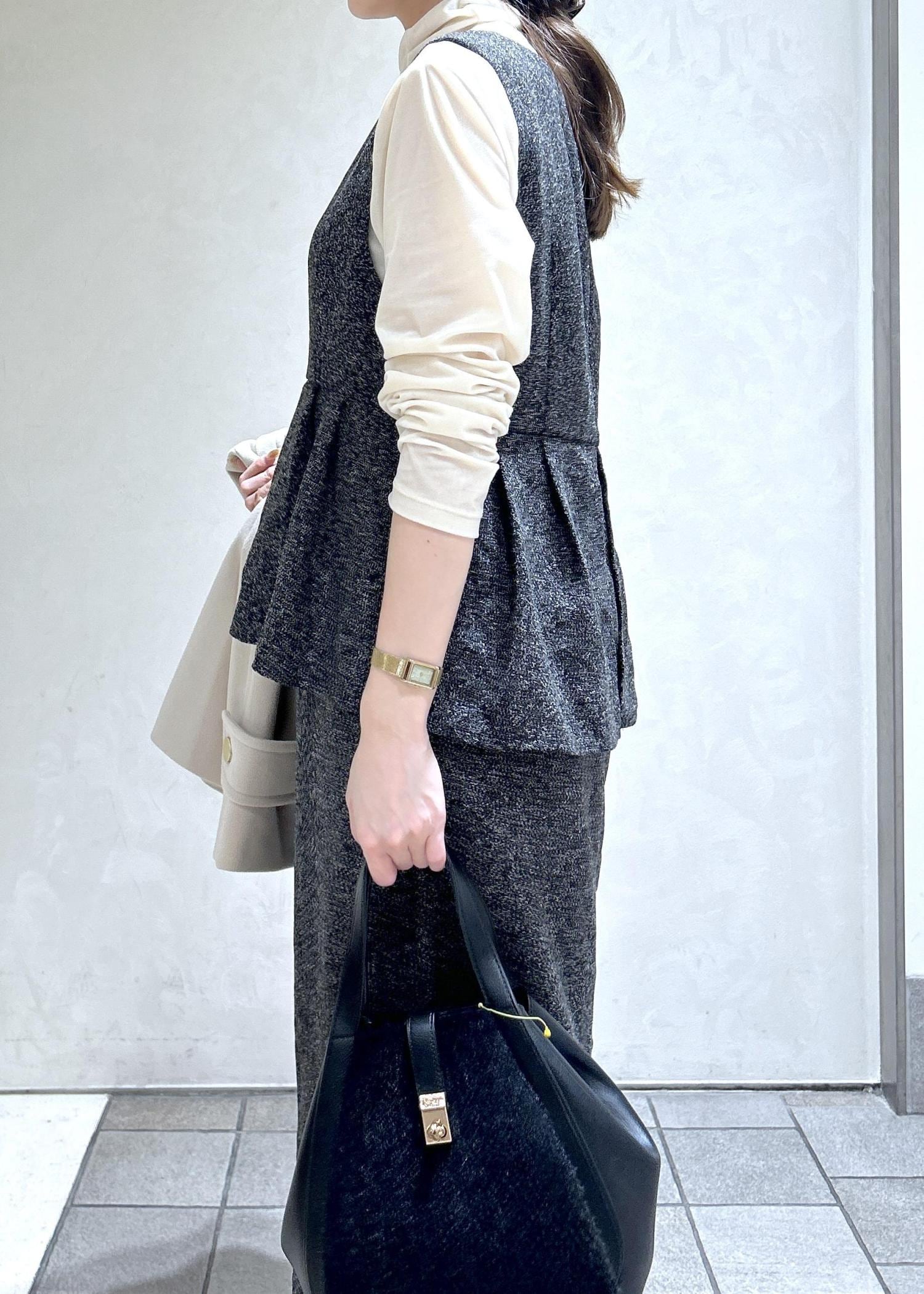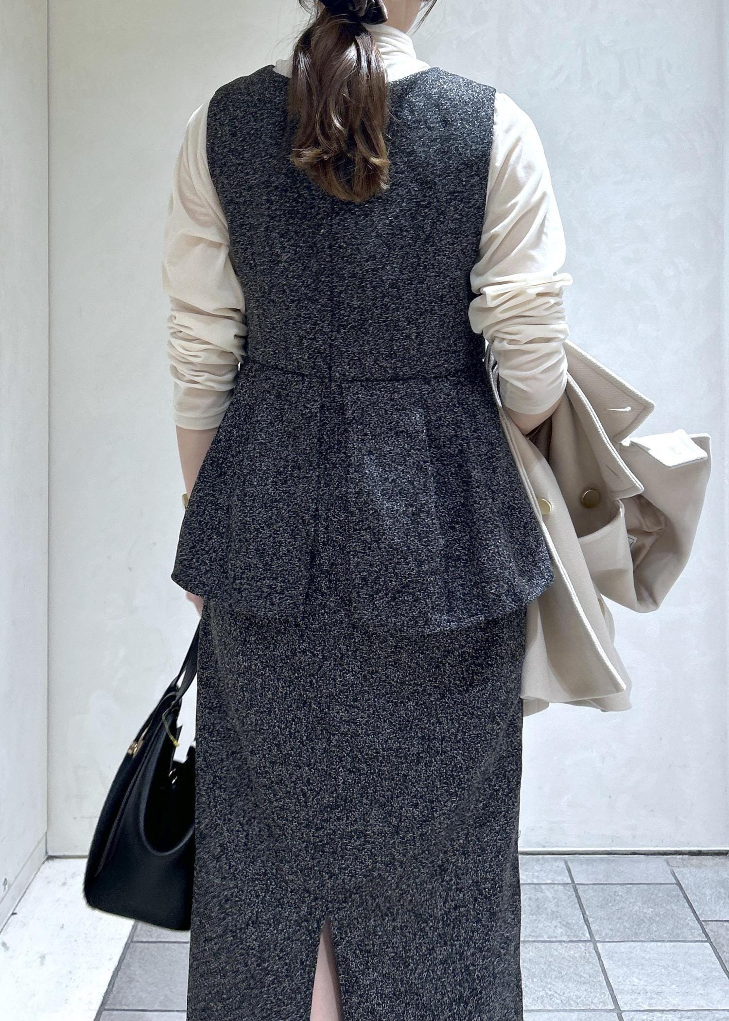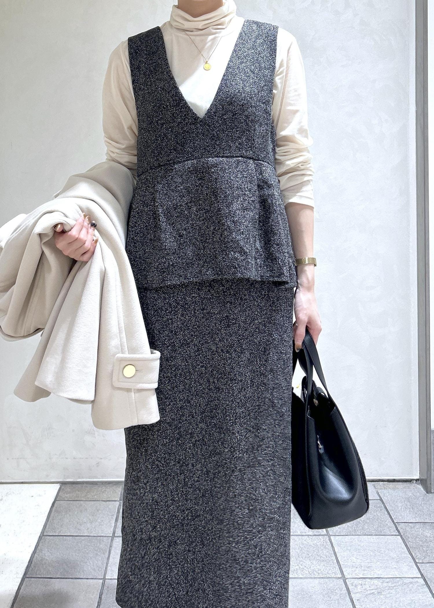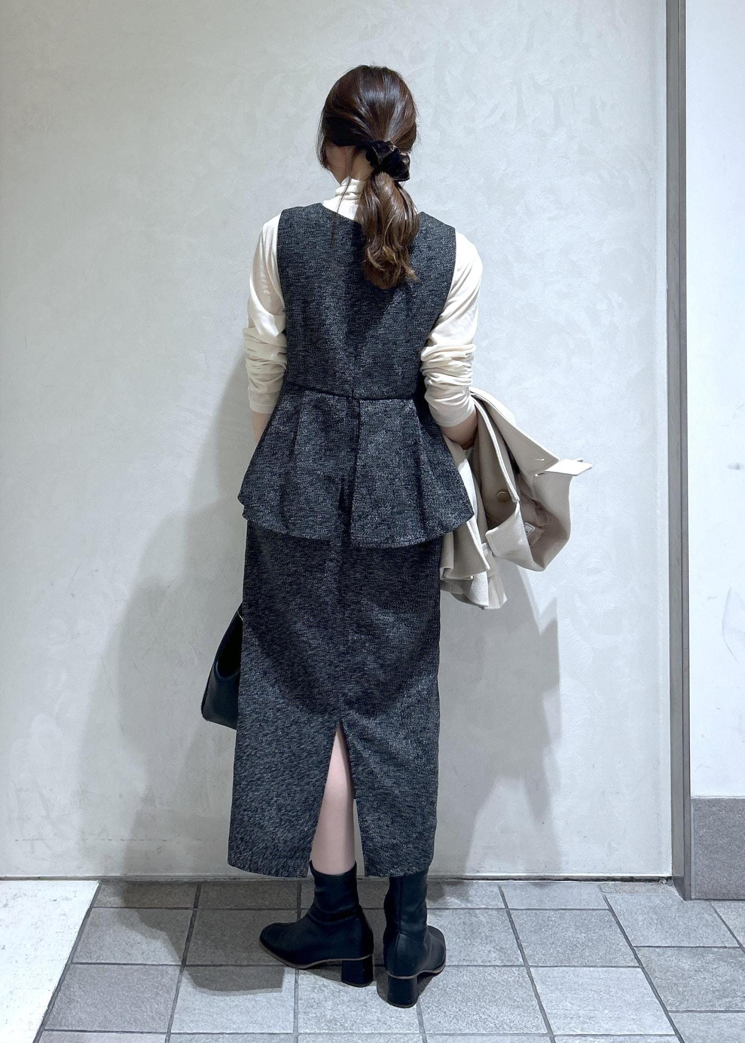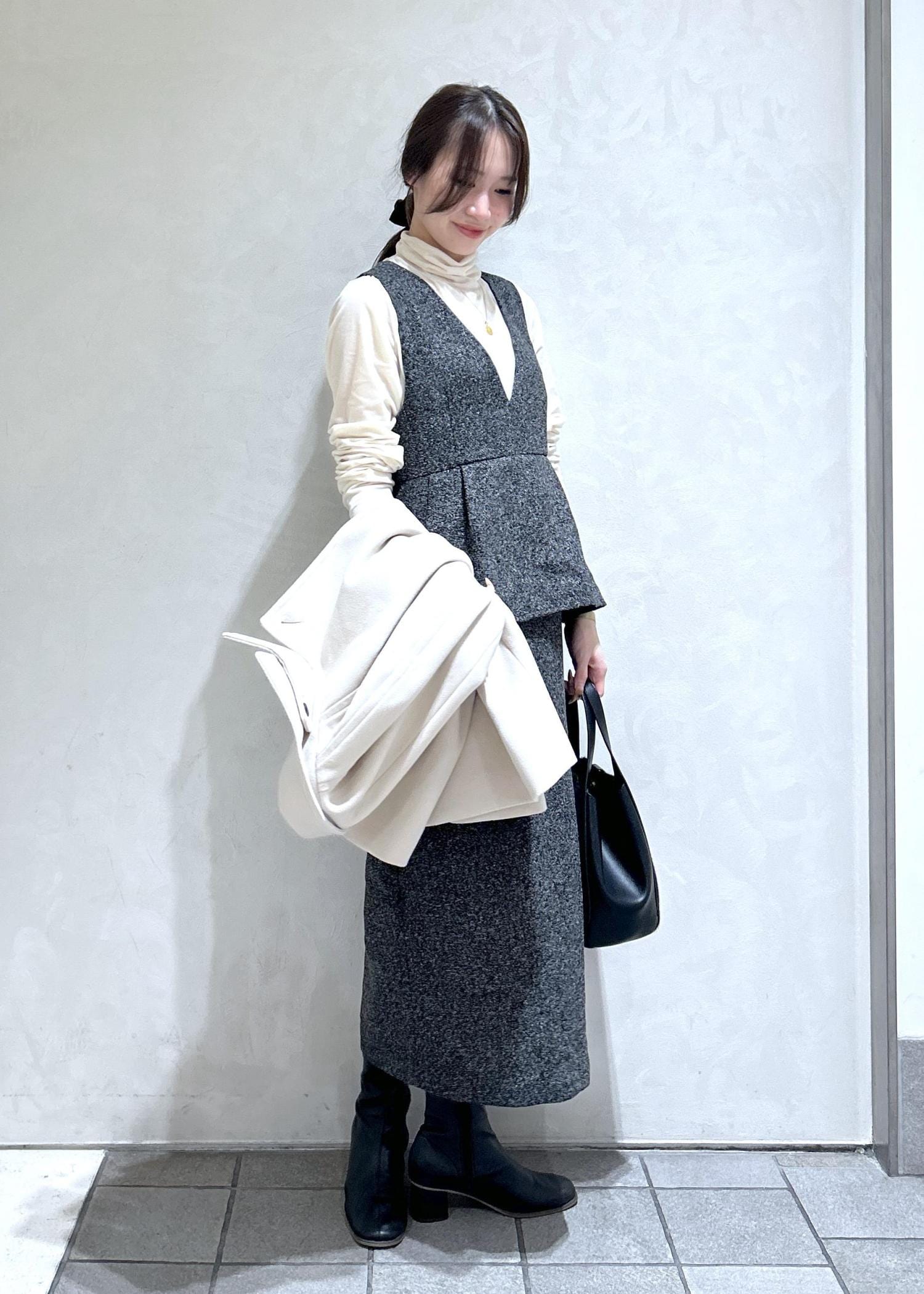 ツイード風なワンピースに、白のアウターでキレイめな冬スタイリングにしました。