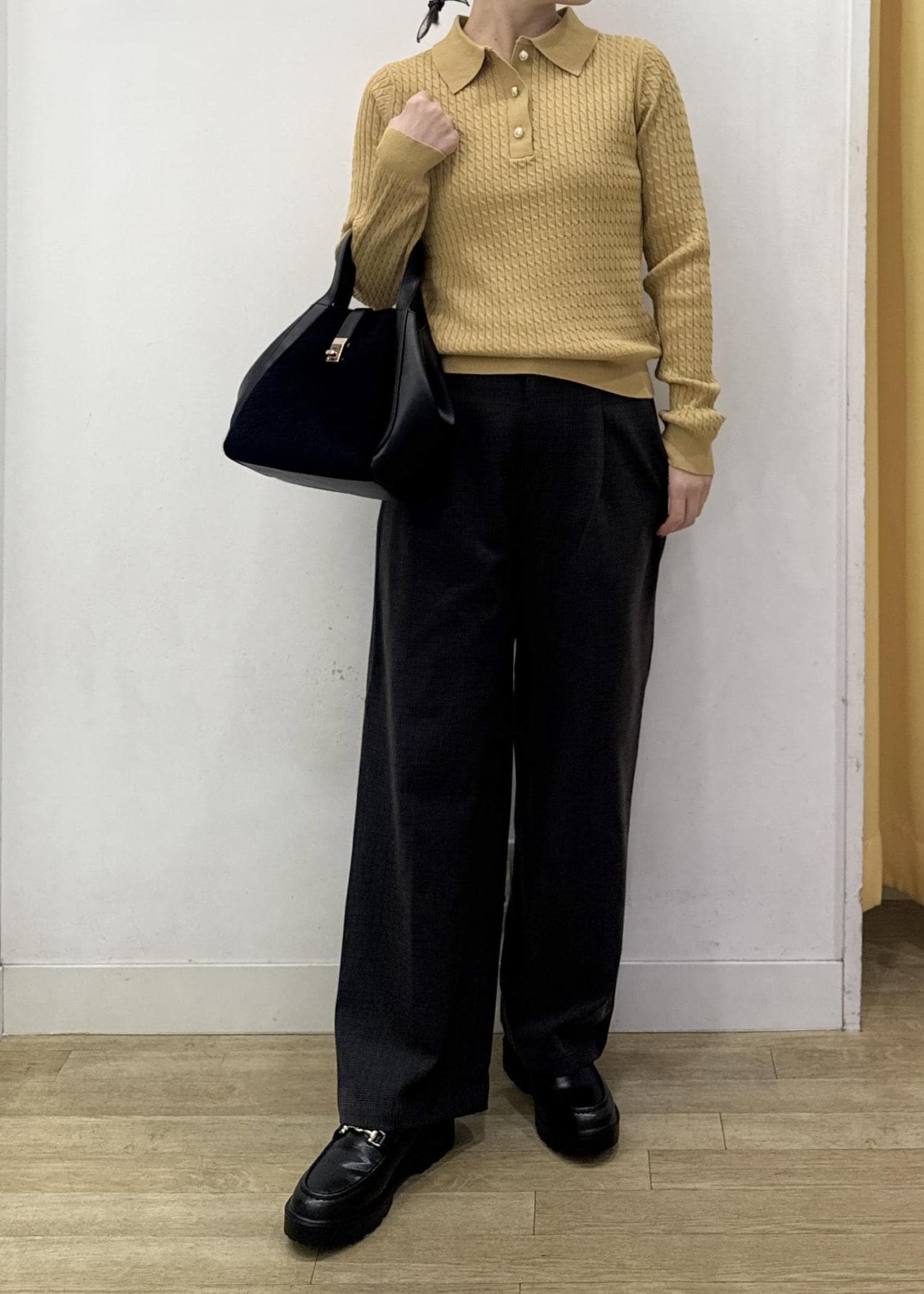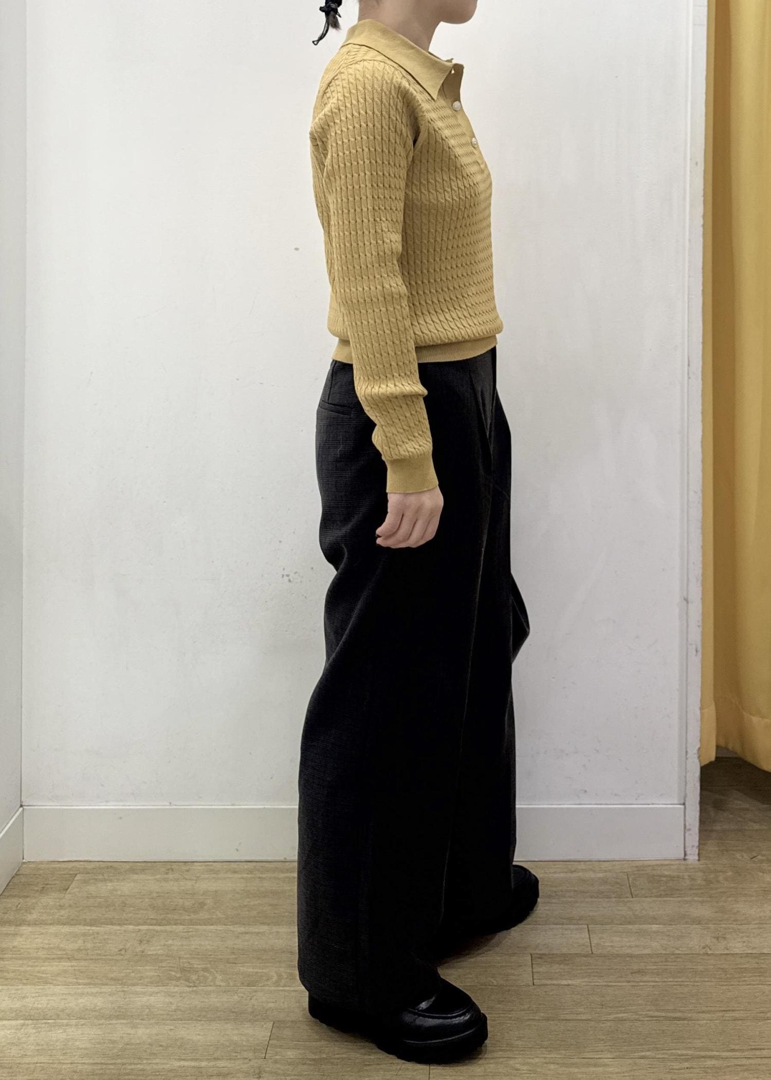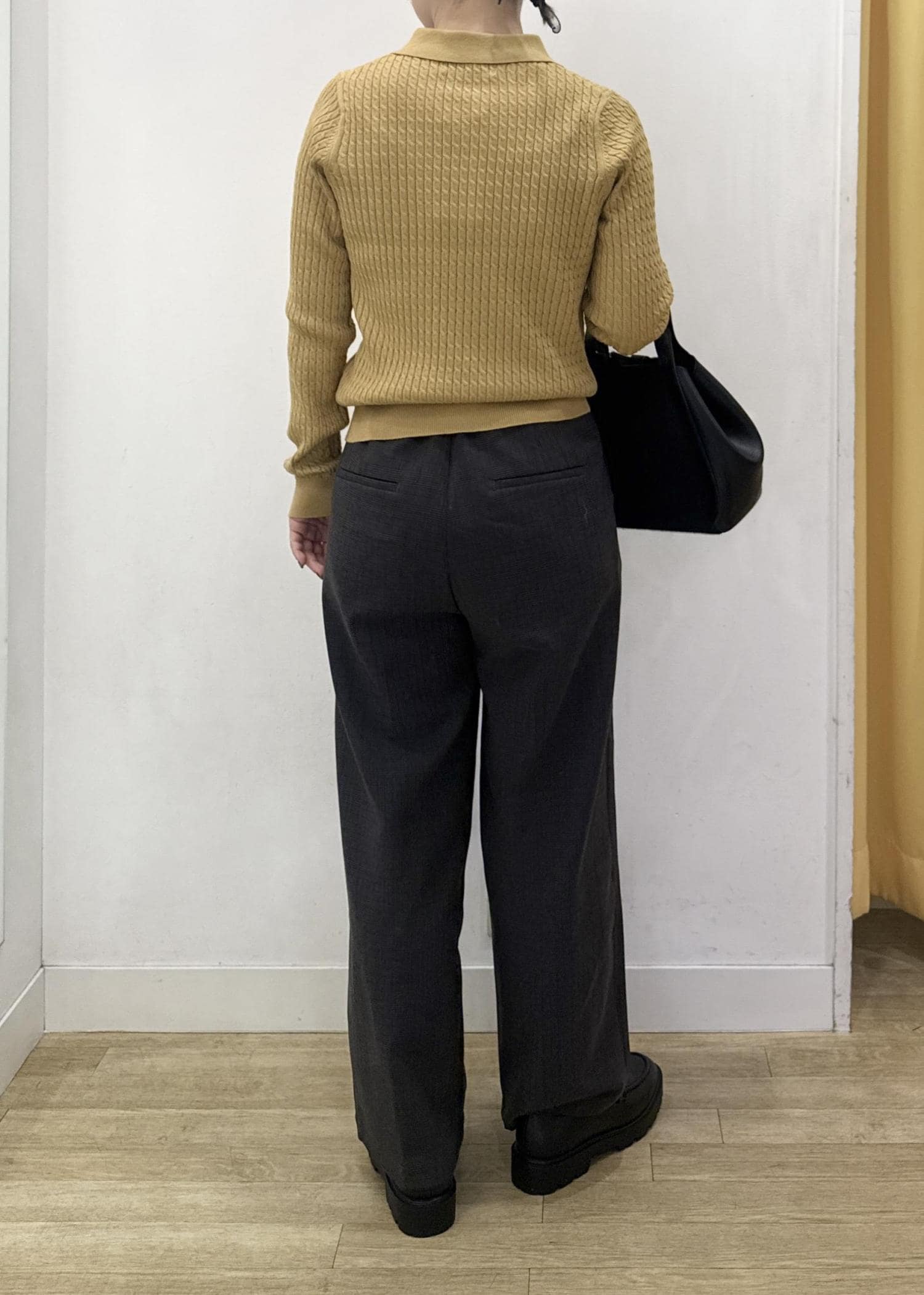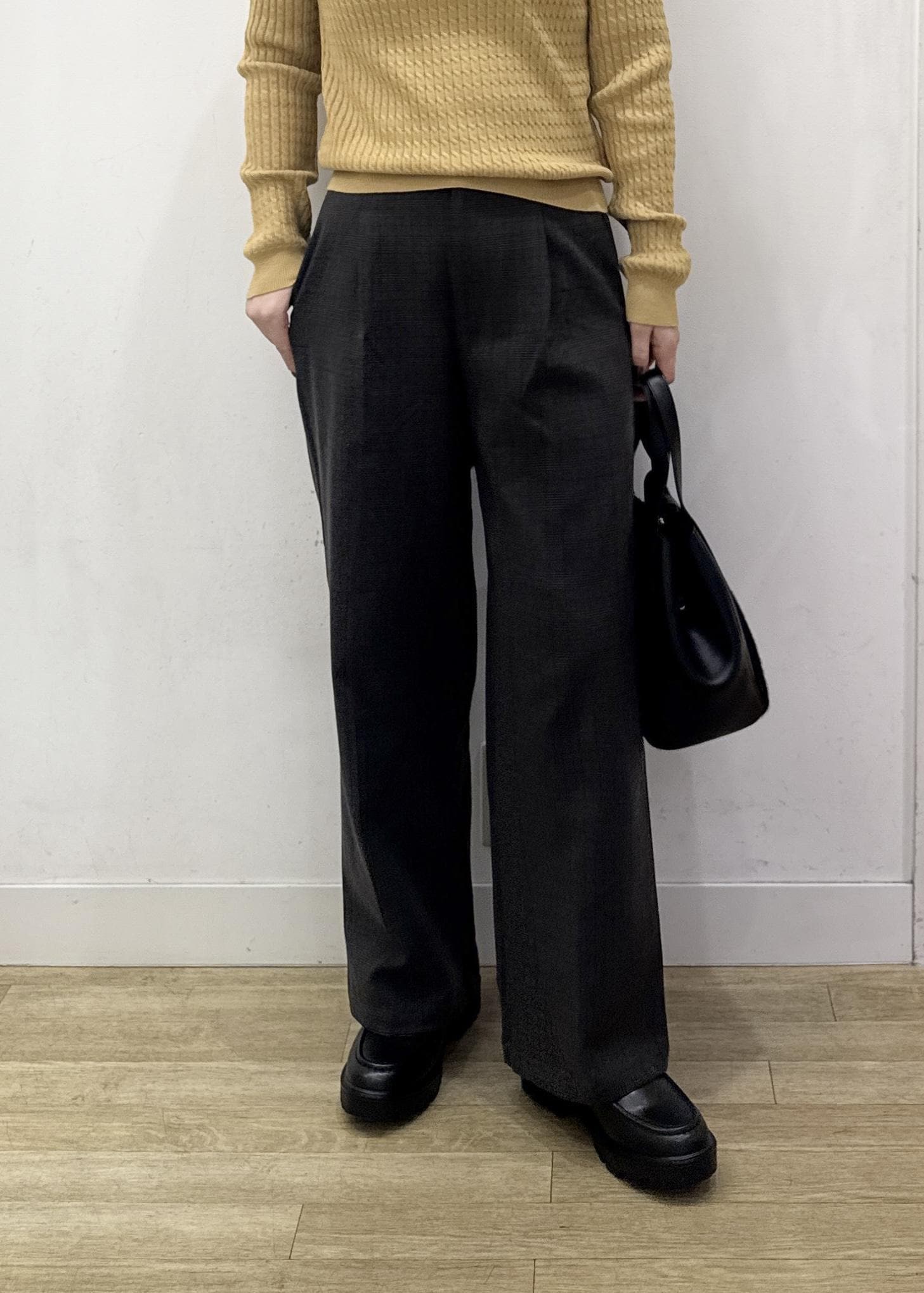 素材感は程よく厚みもあり、脚のラインを気にせずに穿けるゆったりシルエットです。 -