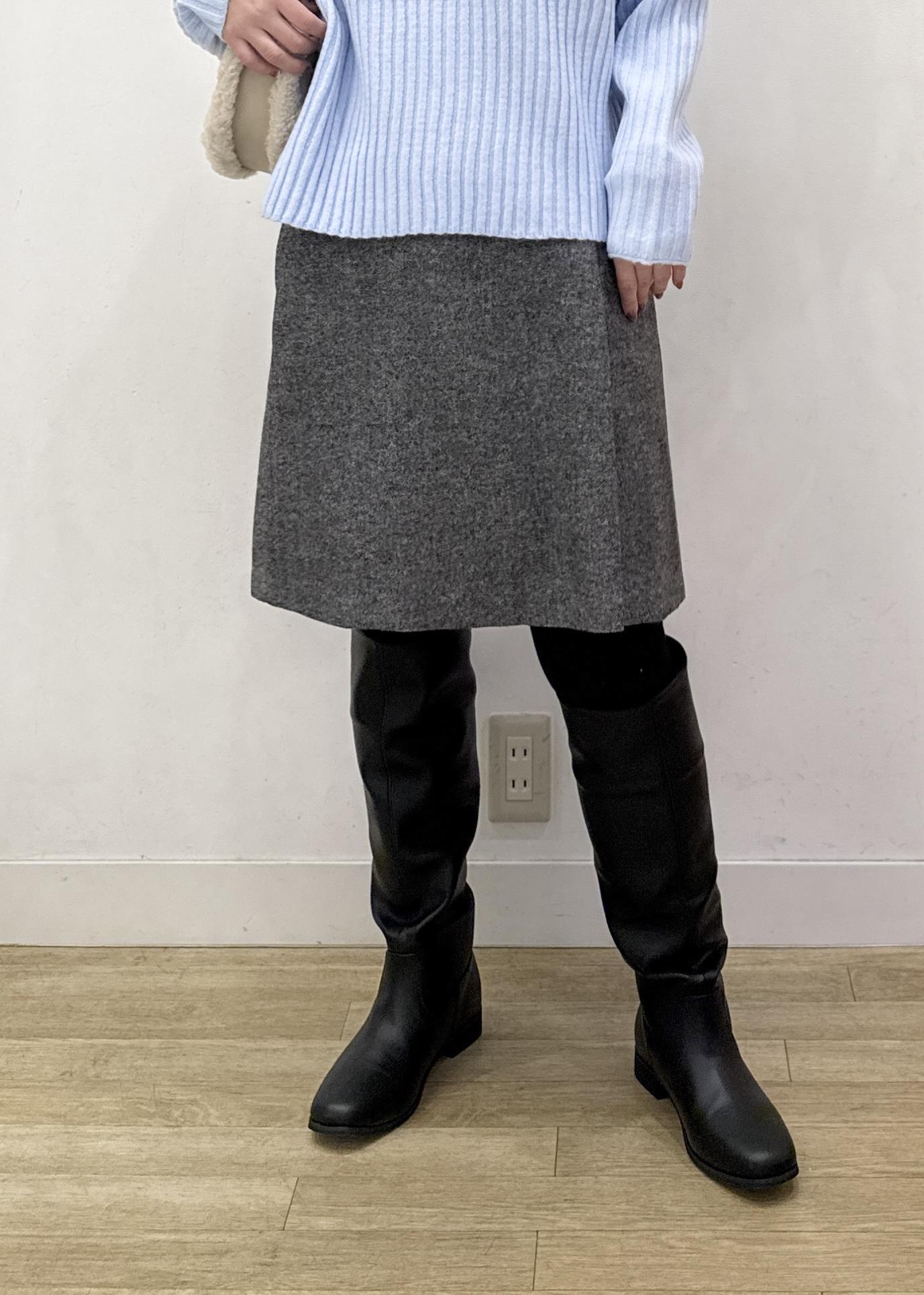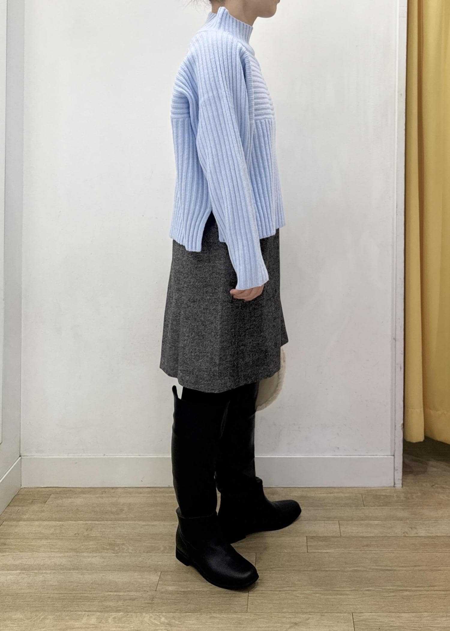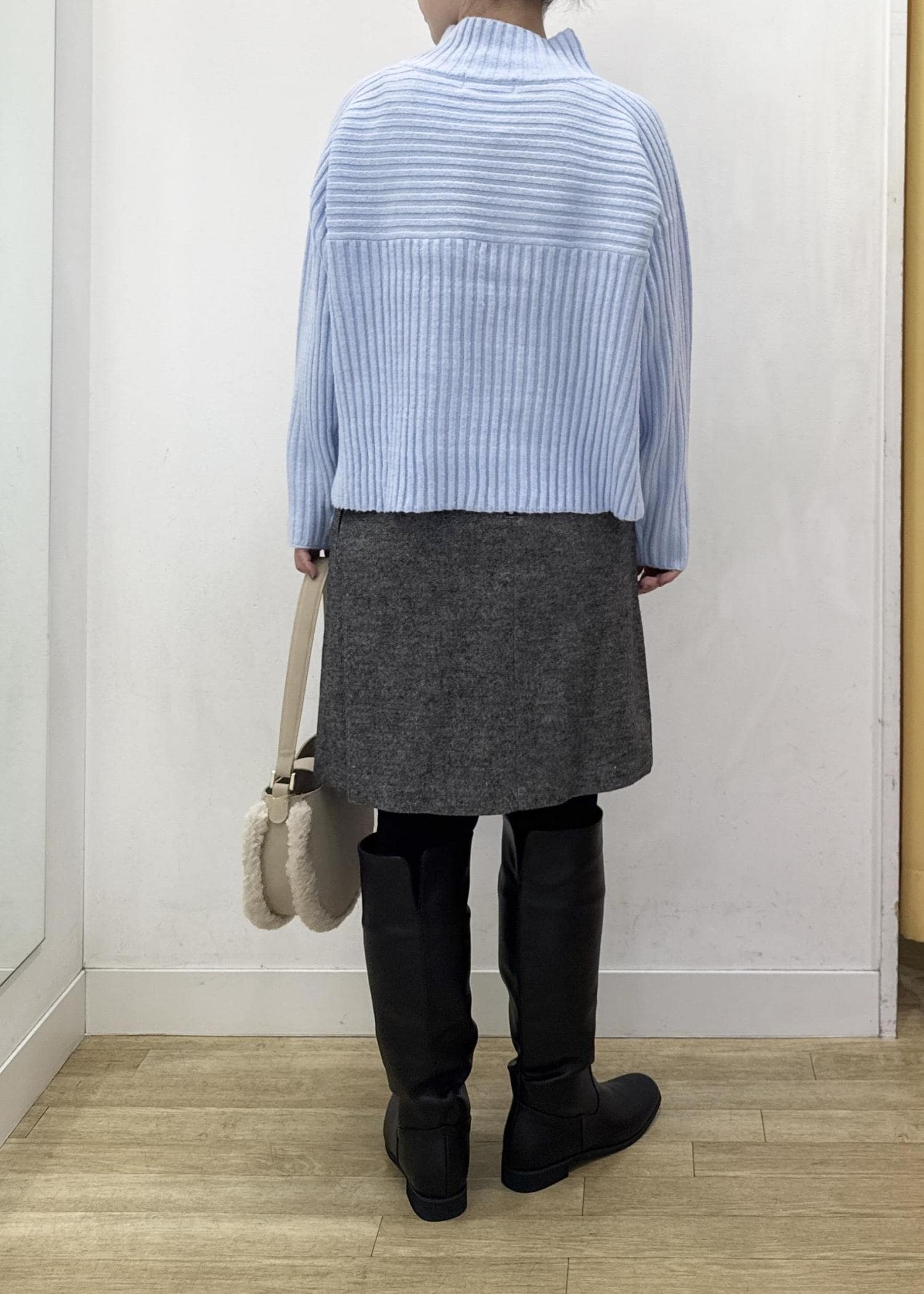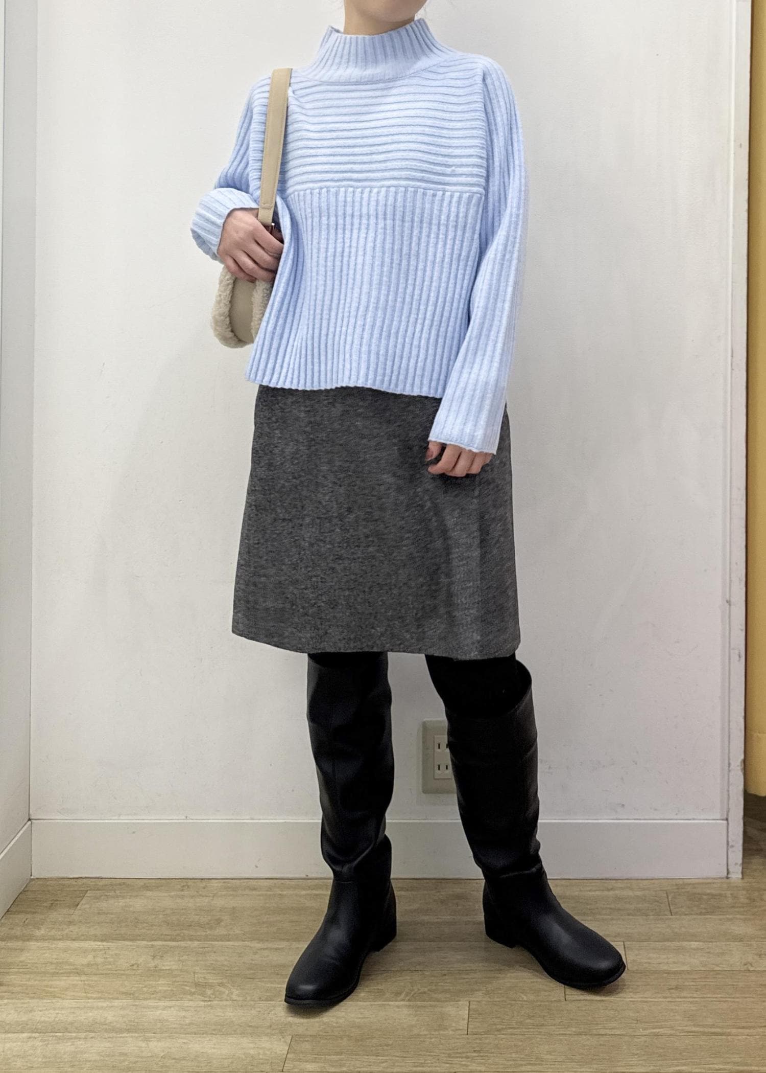 柔らかいサックスカラーのニットに、ミニ丈スカートを合わせてロングブーツでスッキリ合わせるのがオススメ☺︎
