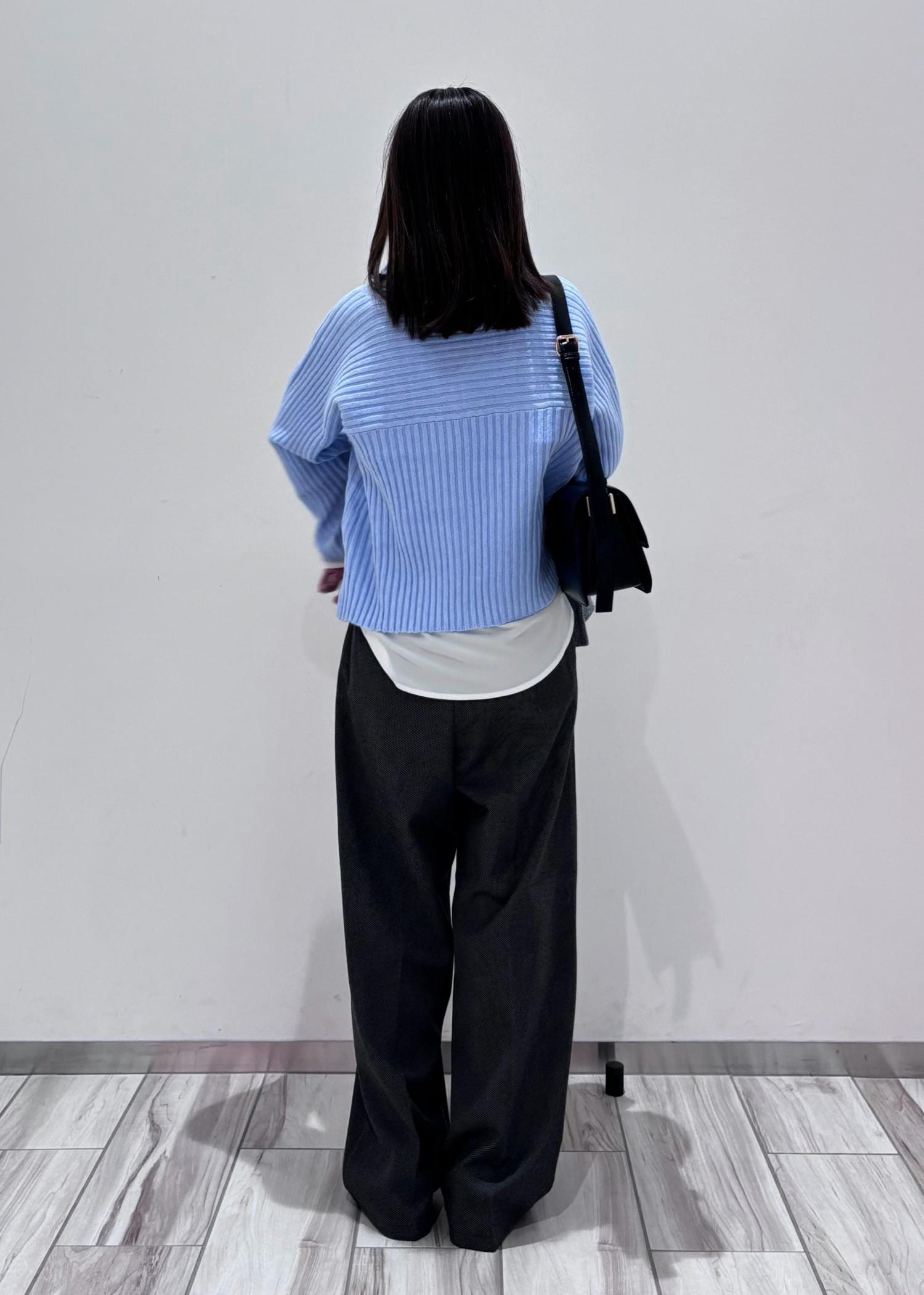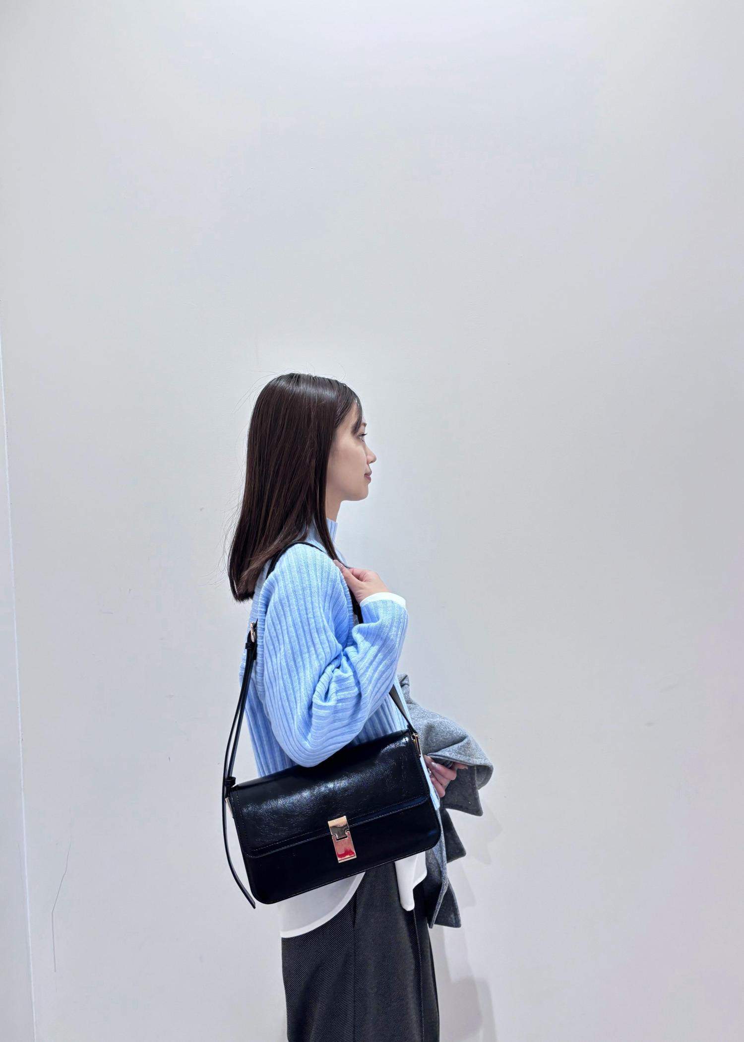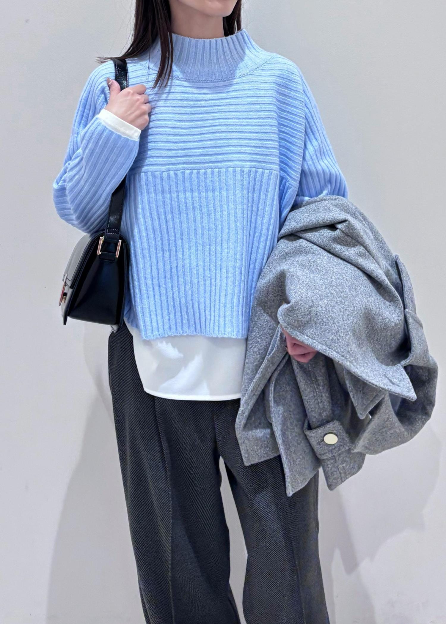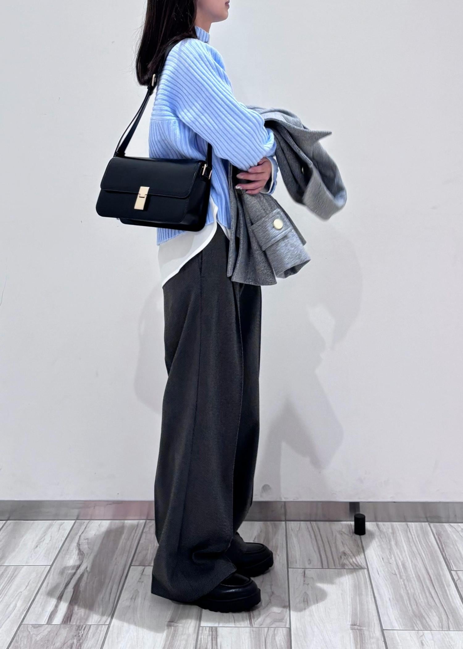 鮮やかな水色ニットにレイヤードで同系色のワイドパンツを合わせてみました。涼しい印象になりすぎない様、温かみのあるジャージーワイドパンツでバランスをとり、濃淡をつけてみました。小物と靴は黒で統一し、締め色に◎