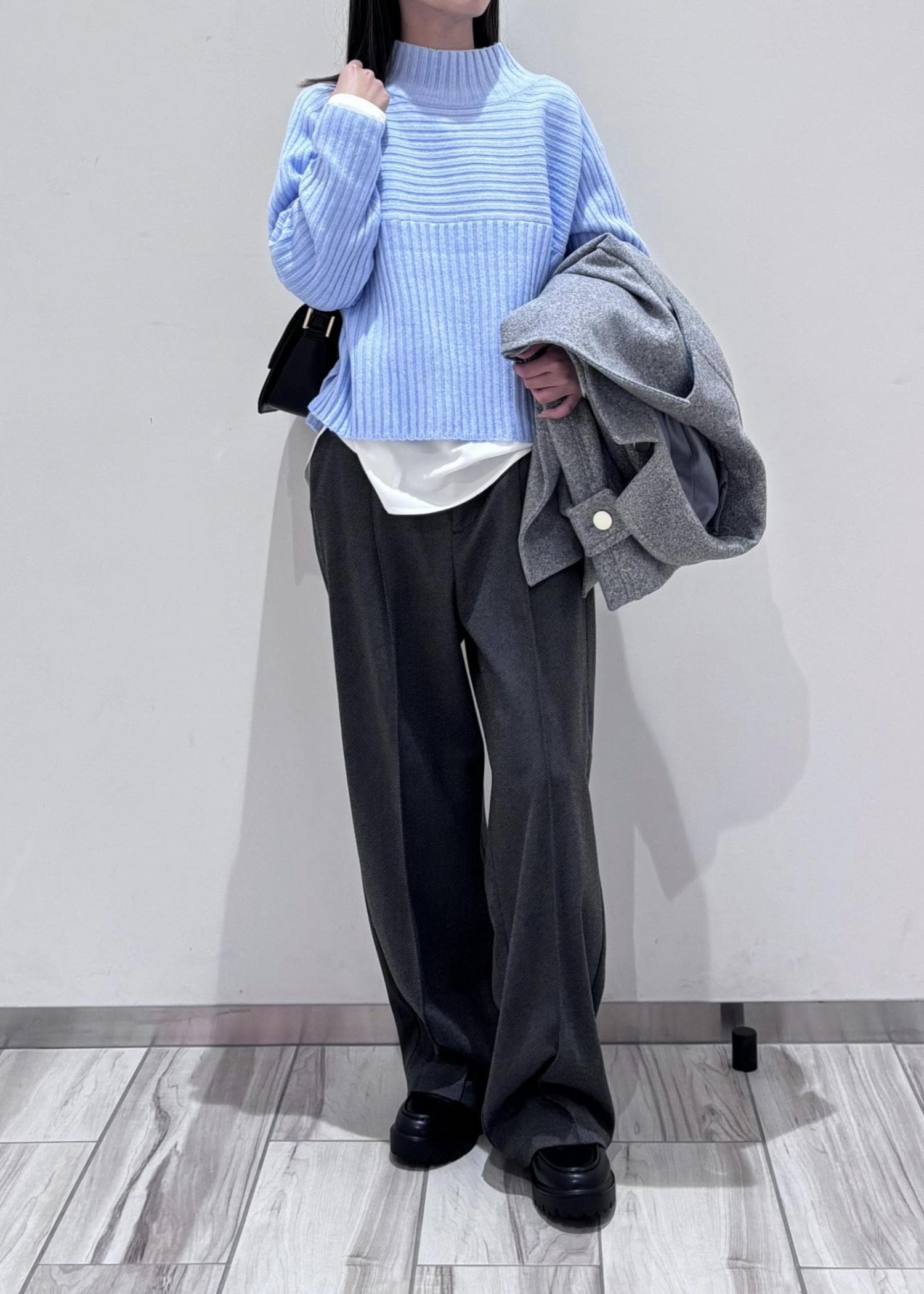 ライトブルーニット×グレーアウターで秋冬お出掛けコーデ♪