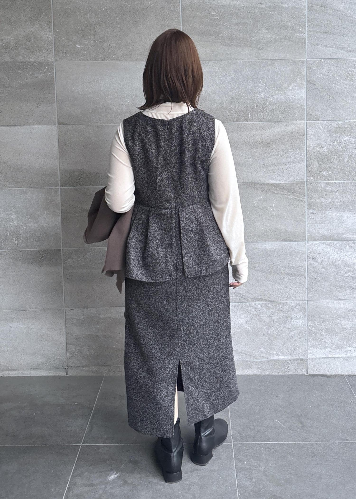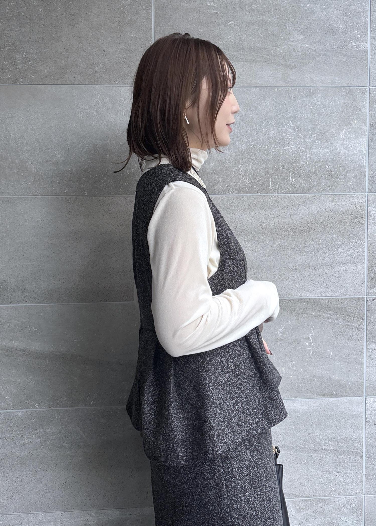 骨格ウェーブの気になる腰回りをペプラムでカバーできる綺麗目スタイル。