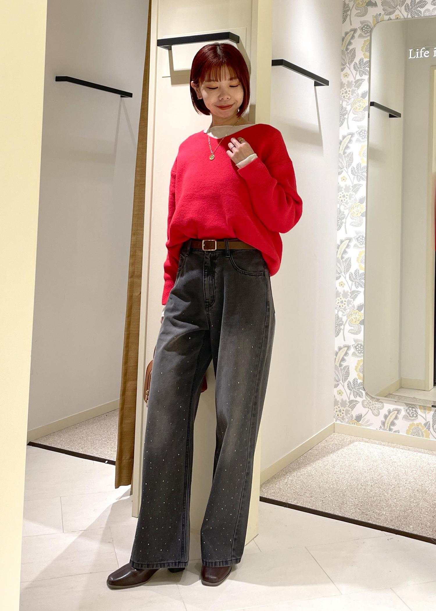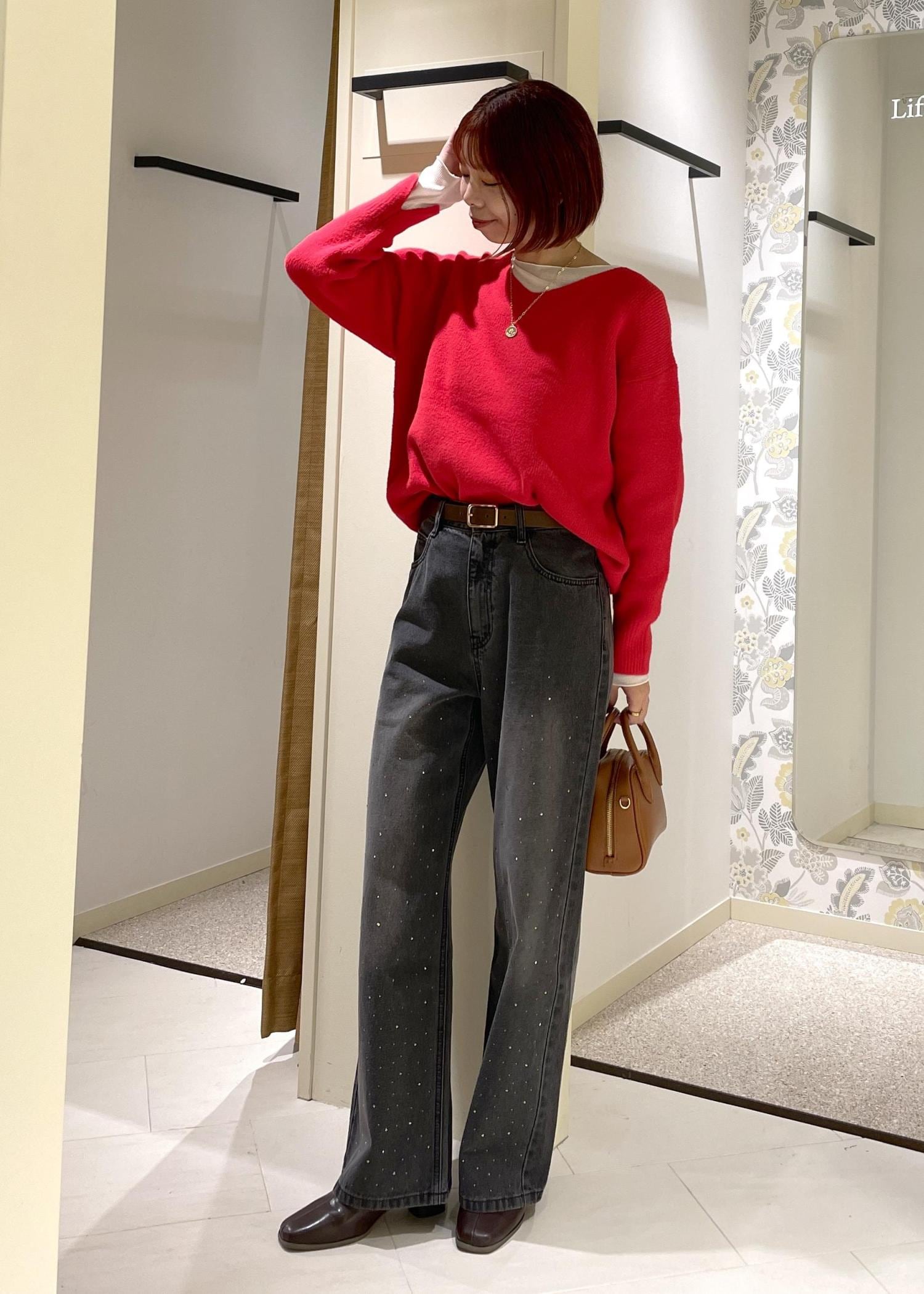 今回は、シアー感のある薄手のトップスをレイヤードし、ボトムはビジューデニムを合わせてカジュアルな中にも、女性らしさを取り入れてみました◎