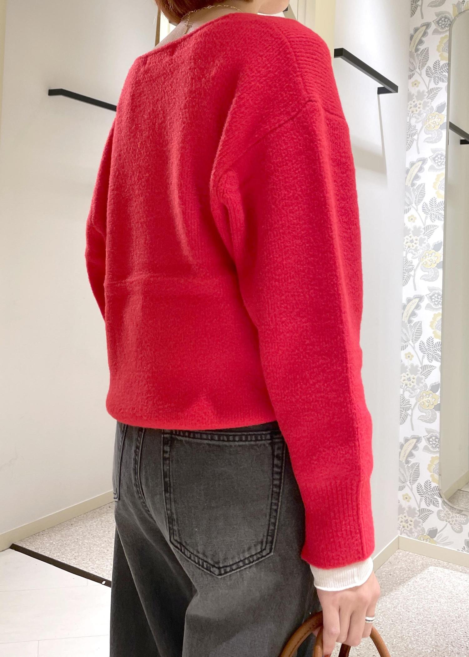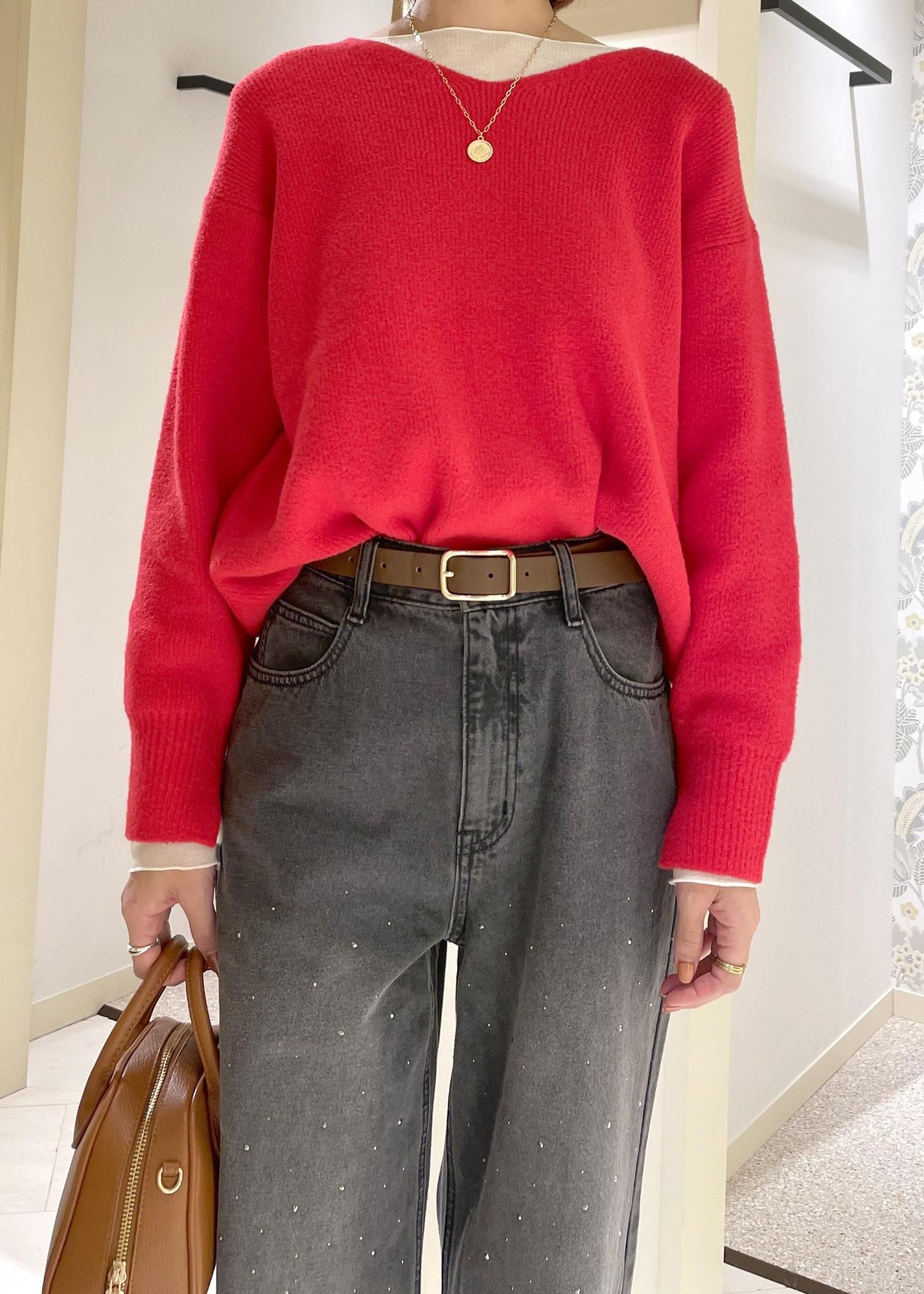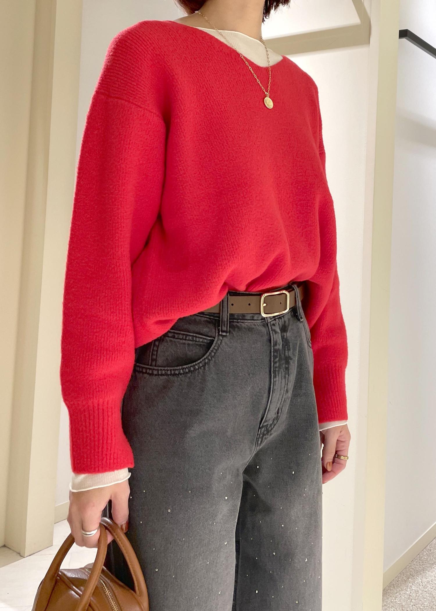 程良い開きのVネックで、顔まわりはすっきりと抜け感がつくれます。