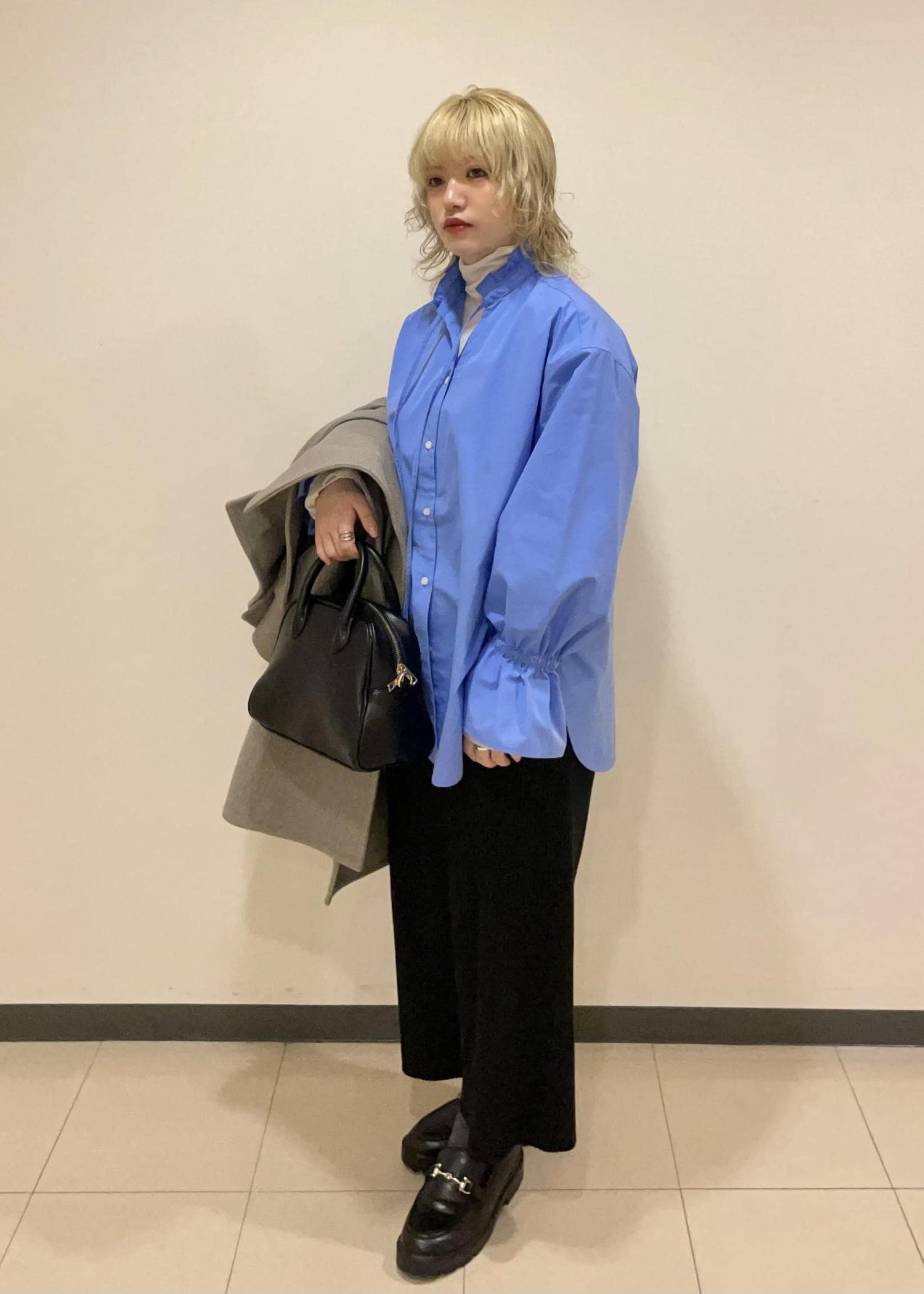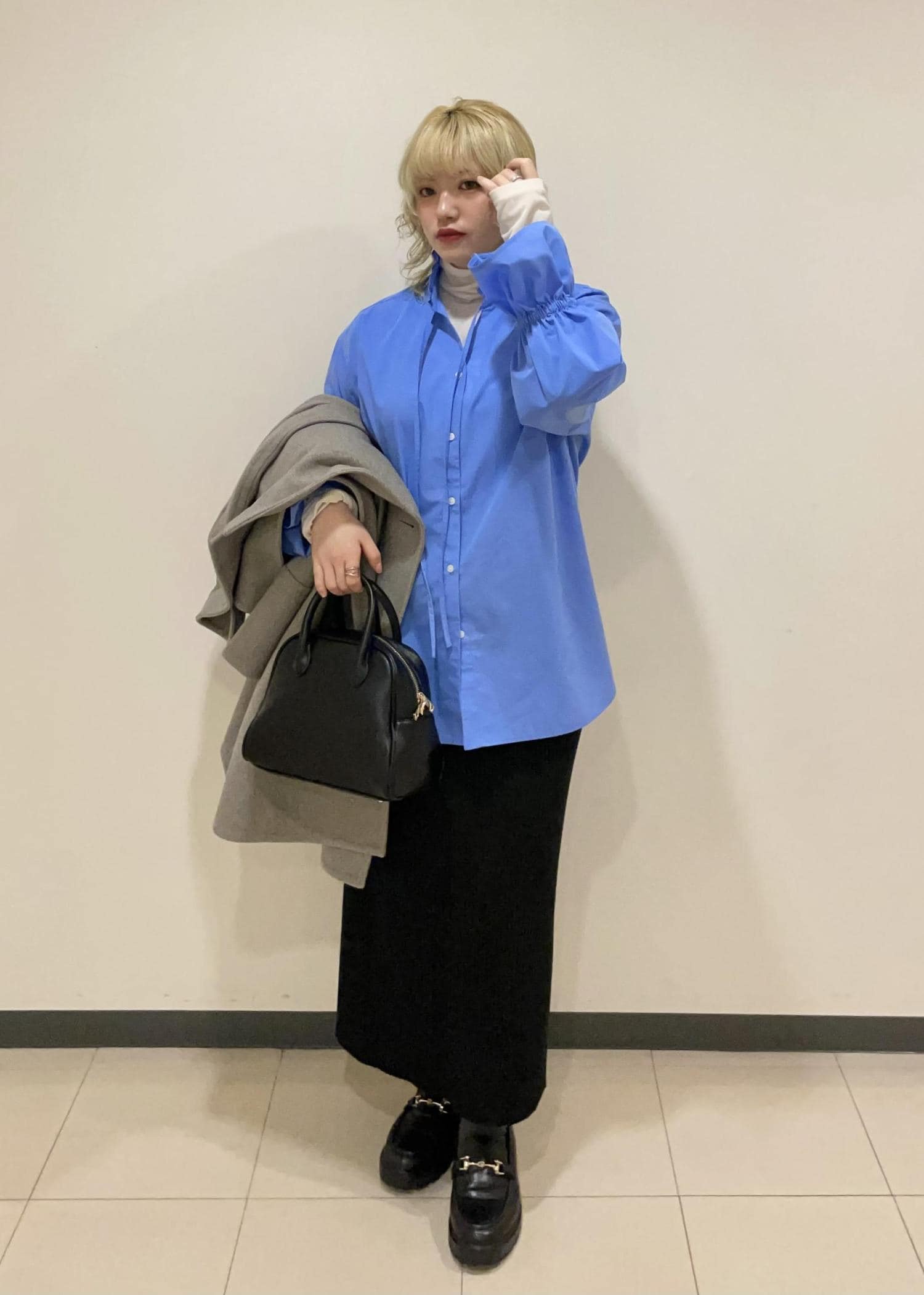 寒い時期はシャツの上にニットをレイヤードするのもおすすめです。