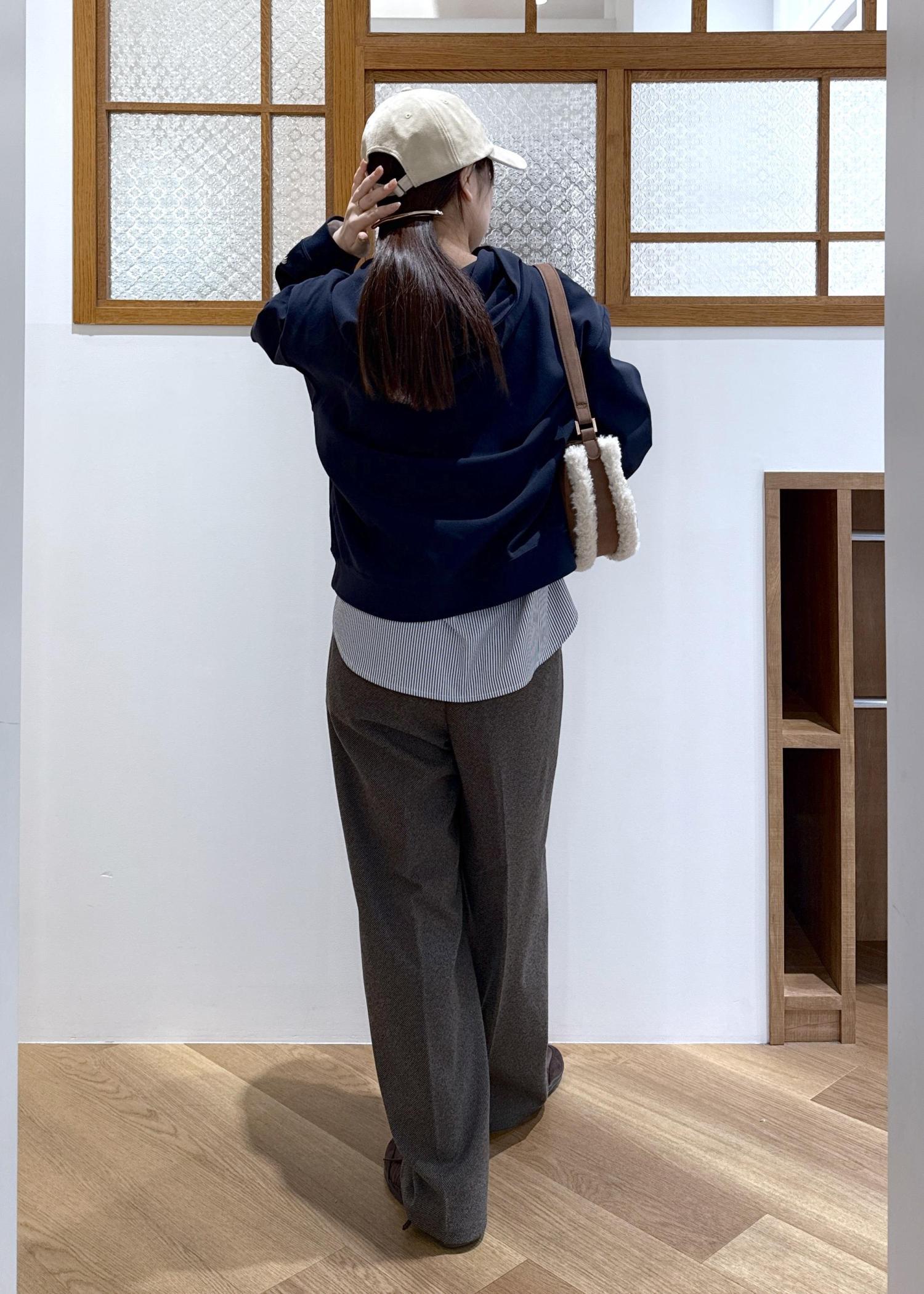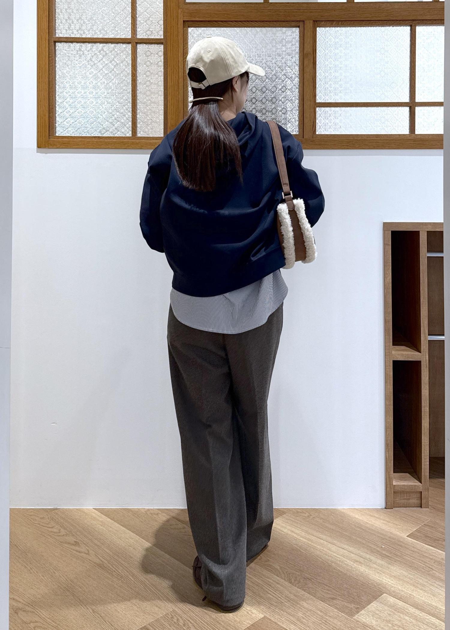 脚がまっすぐ見えるパンツとやや短め丈のトップスを組み合わせることで脚長効果を発揮。