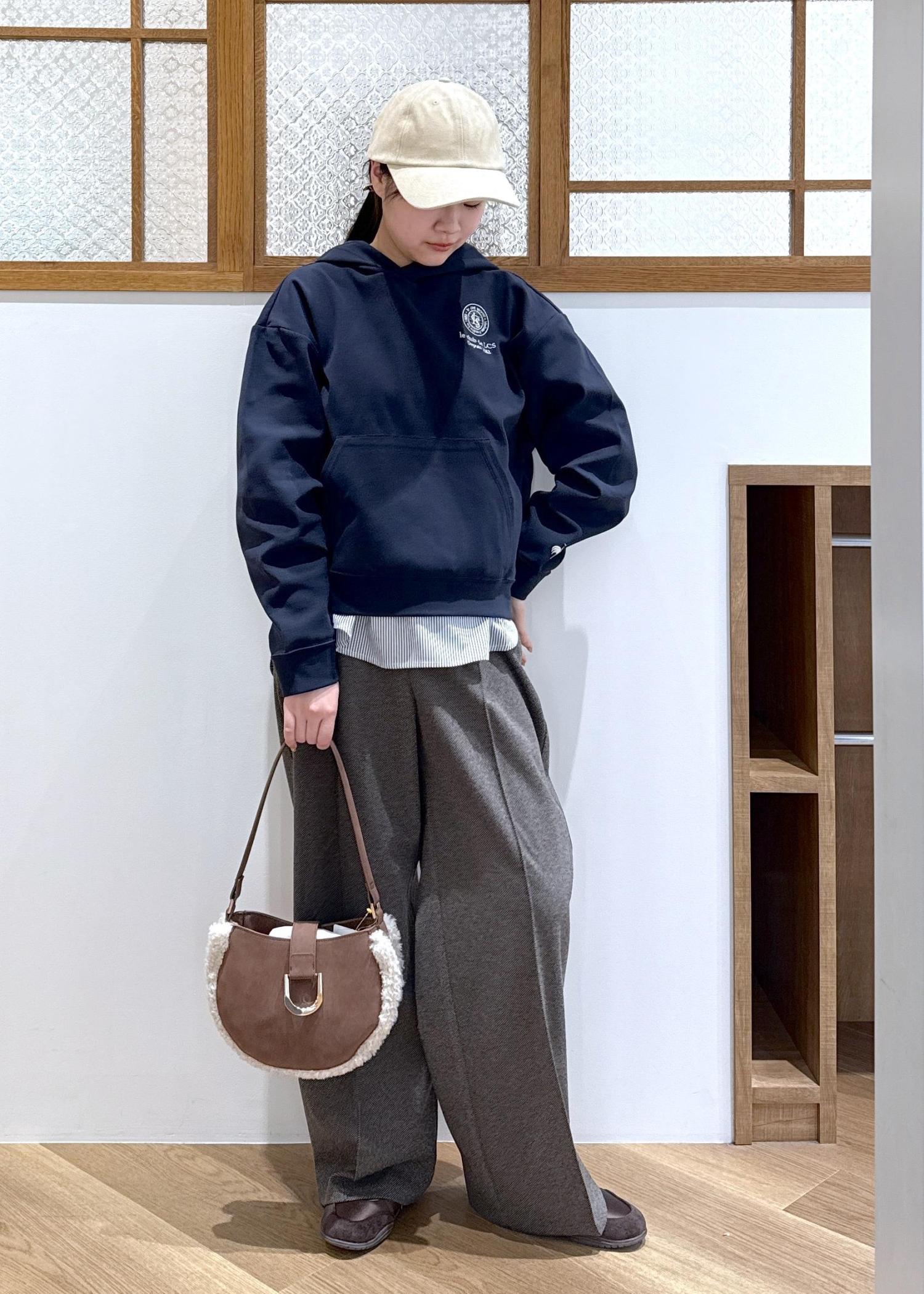 スエード調のキャップとバッグを合わせて今年らしさをプラスしているのがポイントです。