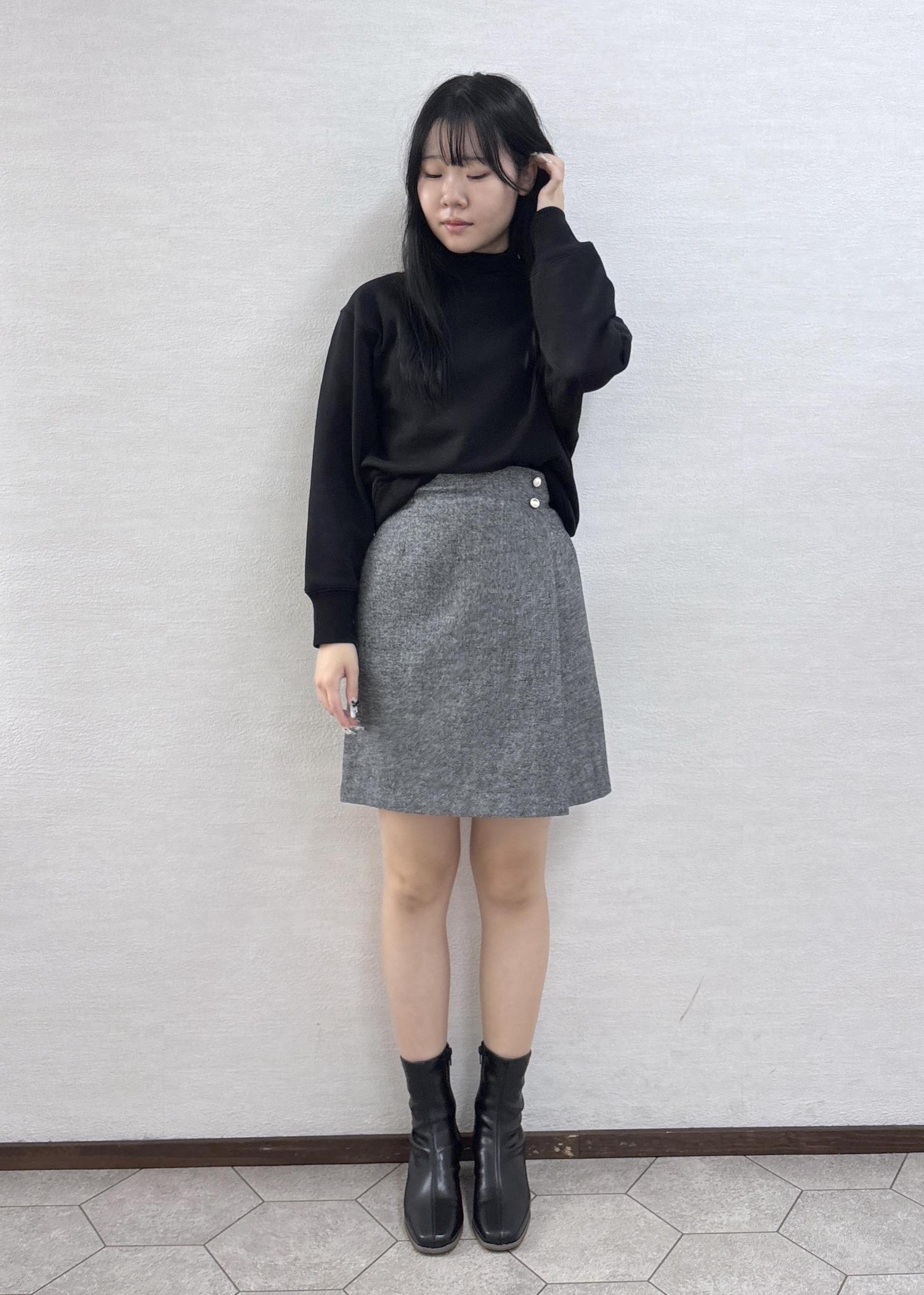 首元があいているトップスですが下にタートルネックを着ることで安心感のあるコーデを組みました。今回はショートブーツですが、ロングブーツを合わせても可愛いです!