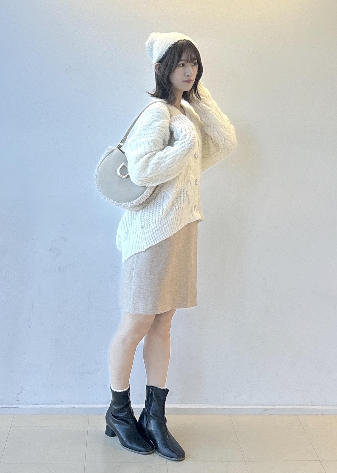 ニット帽×ニット×スカートの組み合わせが女の子らしくてとっても可愛い!アウターは短めの丈感のものを合わせて足長効果。