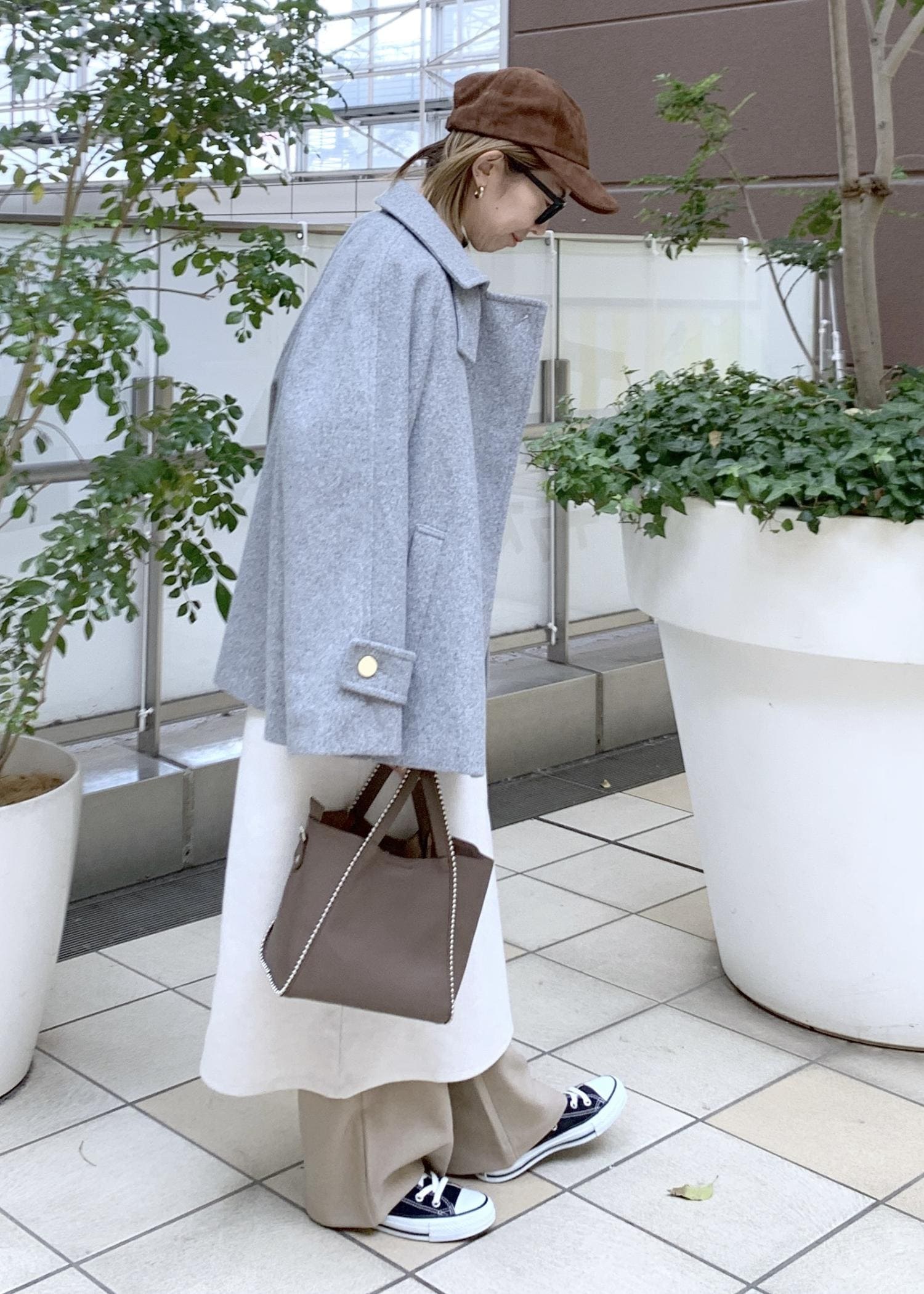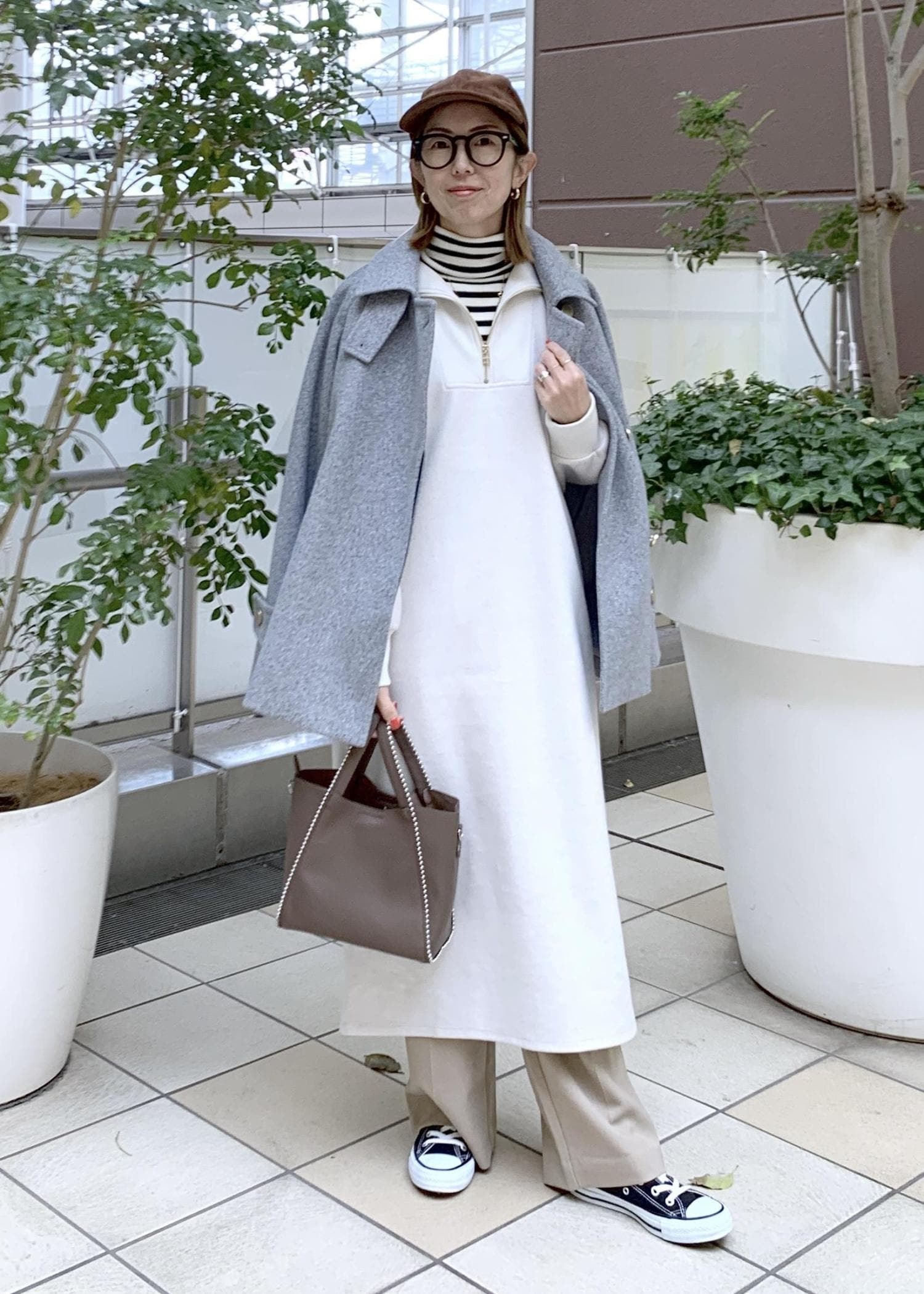 柔らかいトーンのカラーで合わせた大人のカジュアルスタイリング