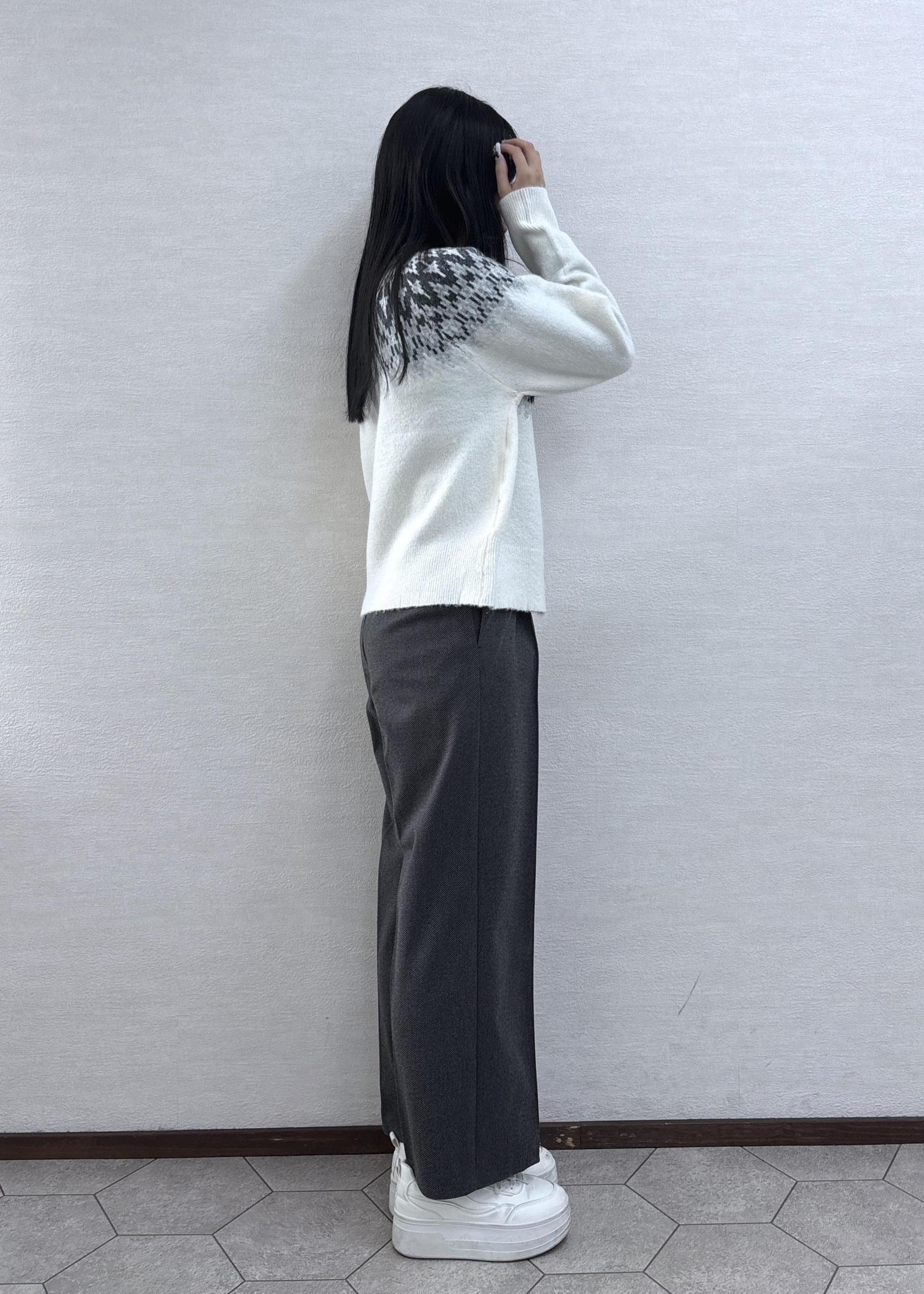 シンプルで可愛いコーデを組みました。今回はインナーとしてタートルネックを使いました。パンツは裏起毛で暖かくてこれからにたくさん使っていただけます。