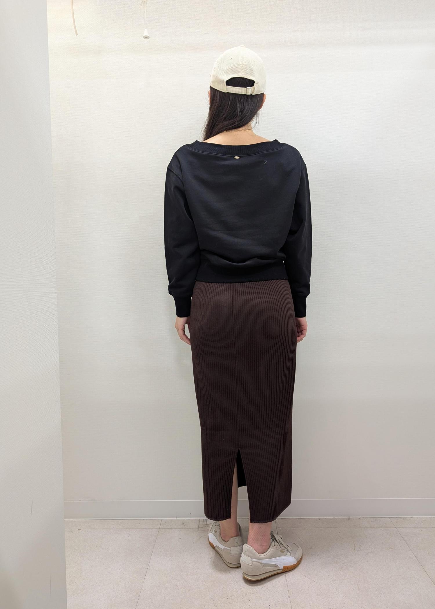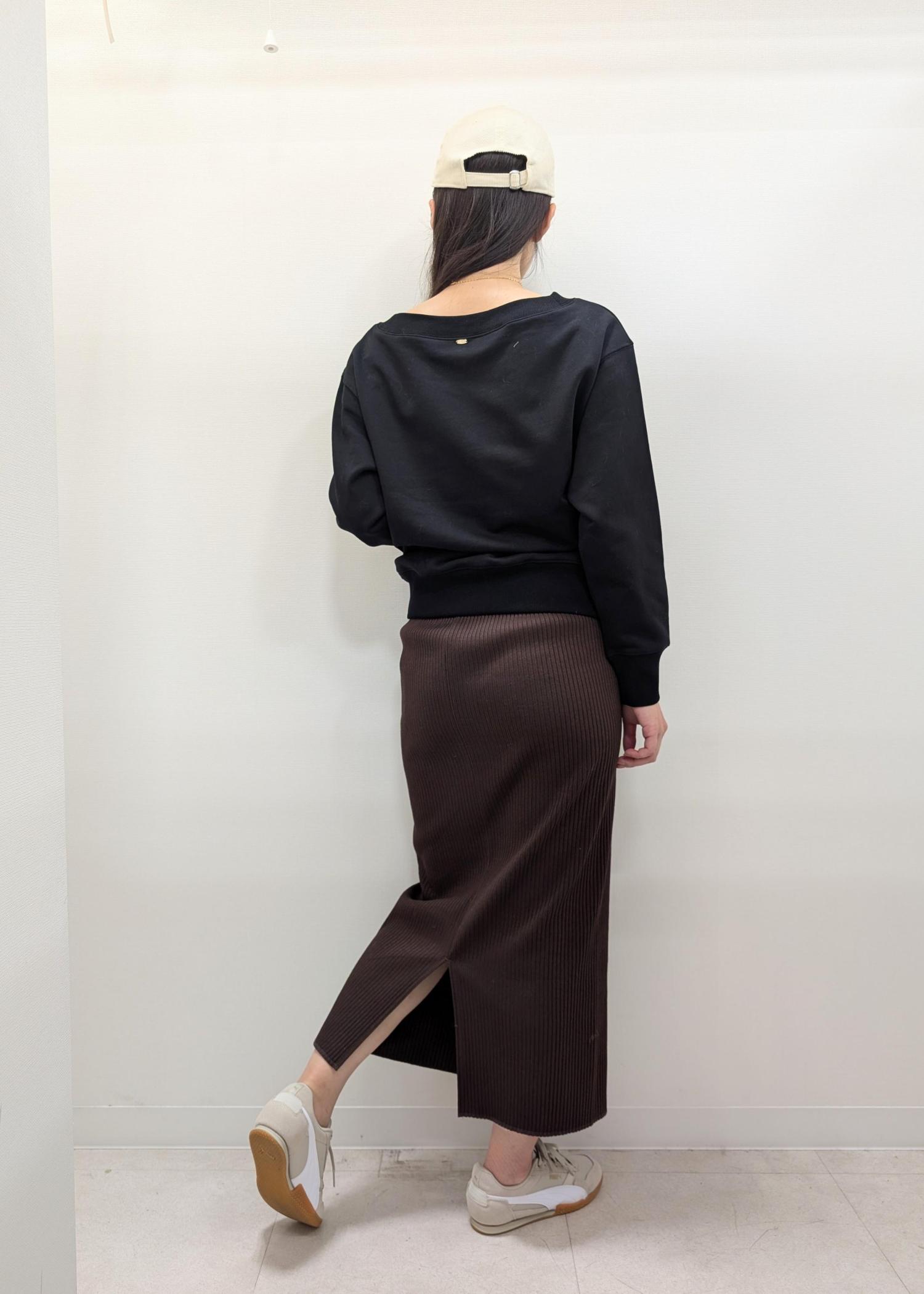 女性らしいデコルテの開きが魅力のスウェットとタイトスカートのカジュアルコーデ。