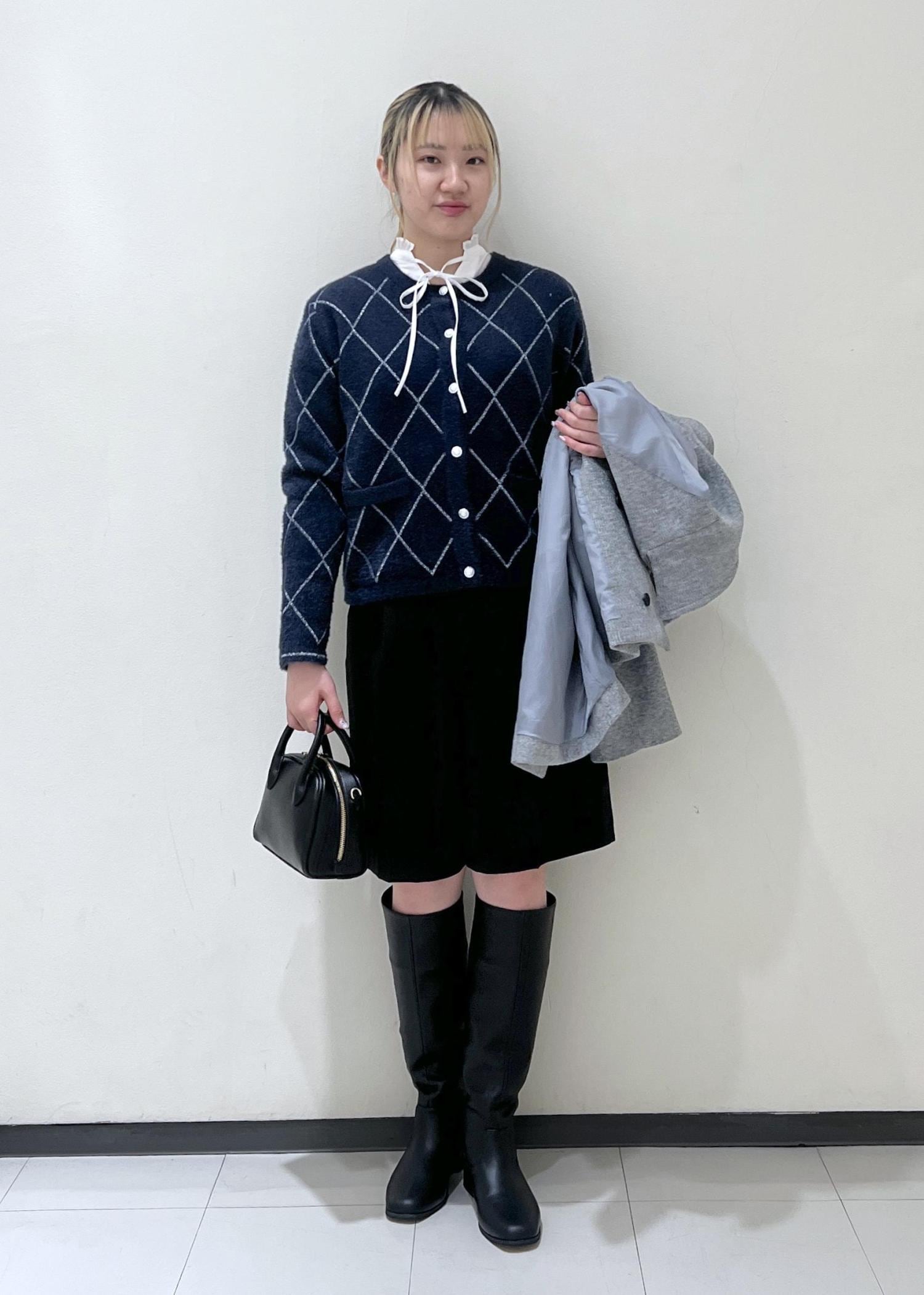 ゆとりがあるシルエットなので中にはカーディガンとシャツのレイヤードスタイルを合わせました。