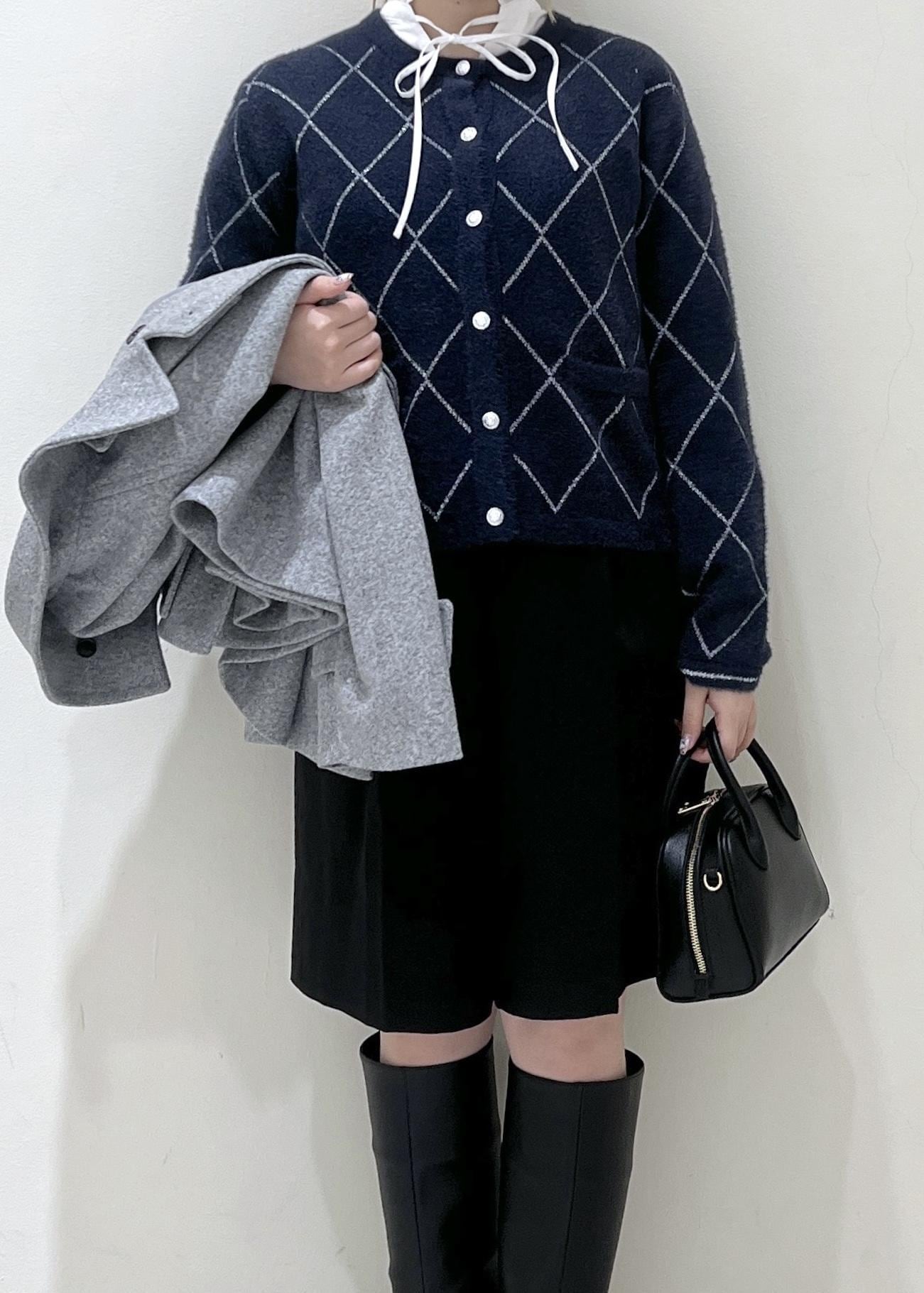 白のシャツとネイビーのカーディガンでメリハリをつけることでバランス良くお召いただけます。