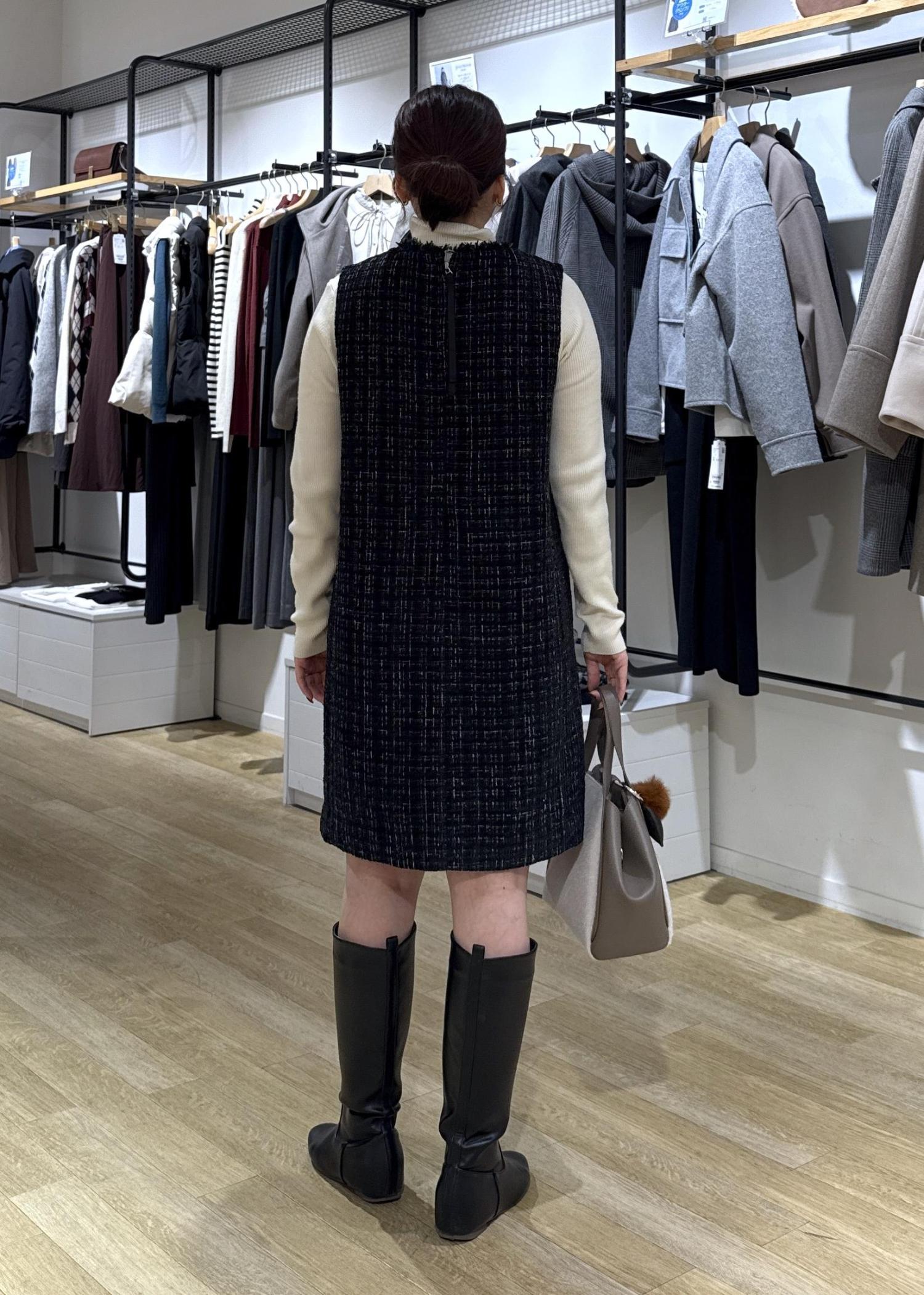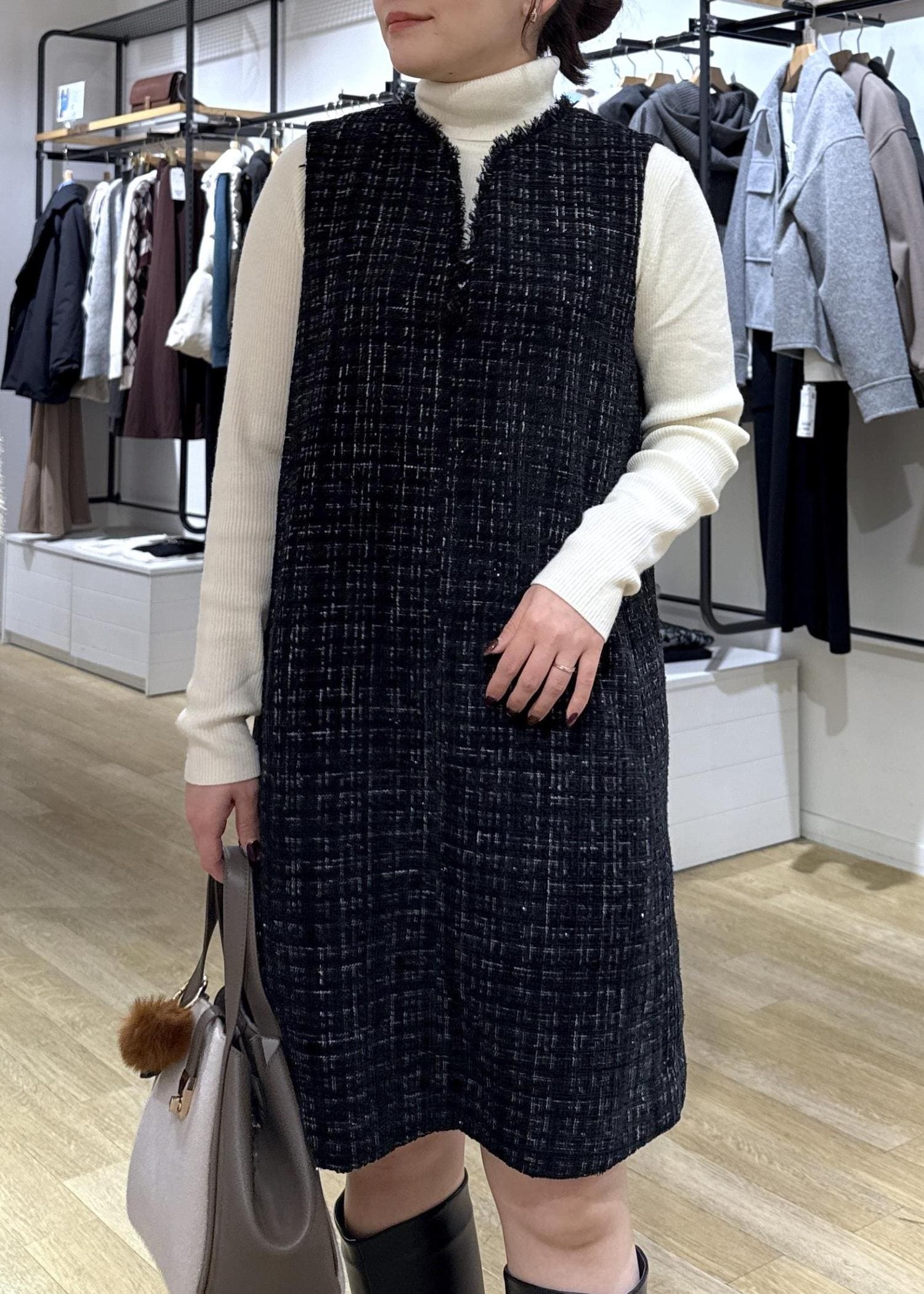 ラメの入ったツイード素材がほどよく華やかなワンピースです。
