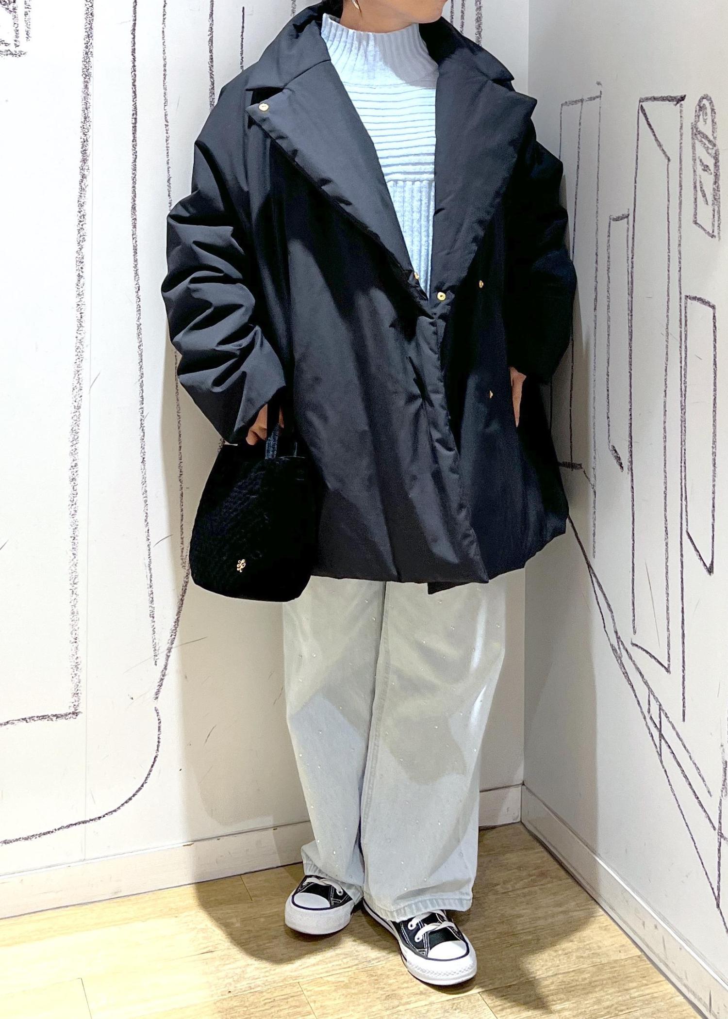 ROPÉ PICNIC2WAY中綿テーラードコートスミクロ / F¥10,890レビューコクーンシルエットのオーバーサイズテーラードコート。147cmでお尻がすっぽり隠れる着丈。袖丈は長いもののアウターなので許容範囲であまり気にならないです。襟元は2wayで開けてスッキリ、閉めてスタンドカラーで温かく着用可能なのは嬉しいポイント◎中綿で軽く温かいキレイめカジュアルコート。