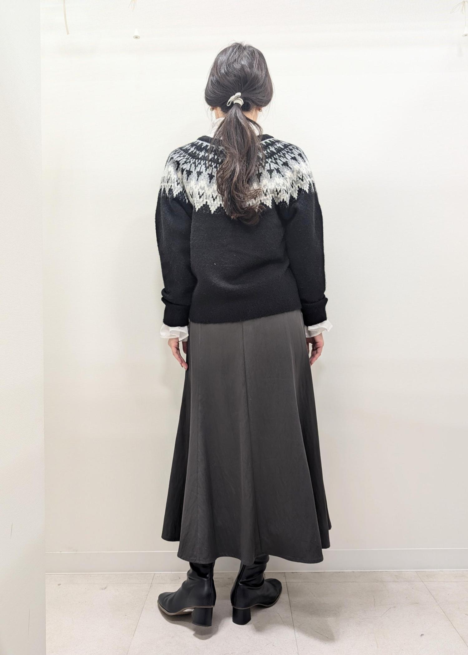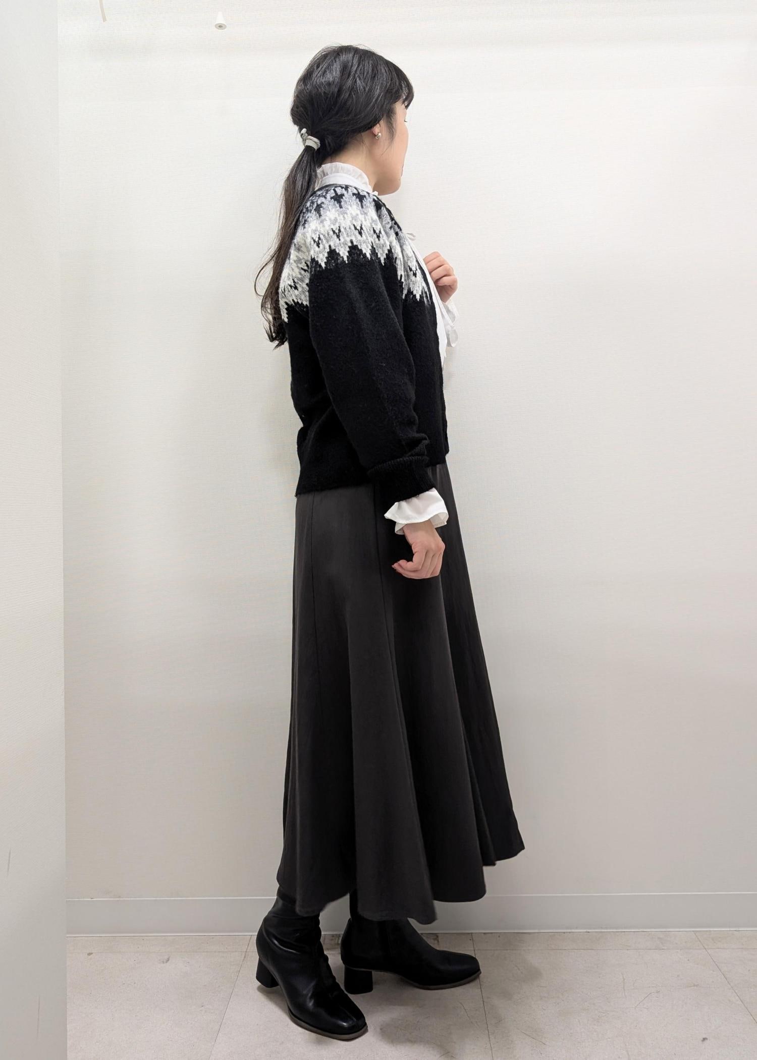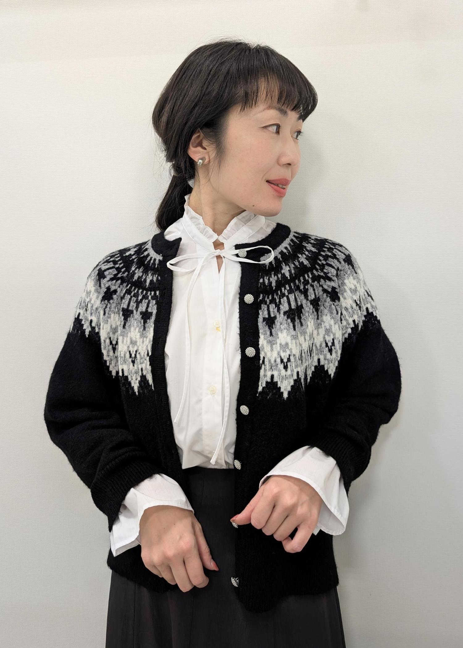 冬らしいジャガードカーディガンと可愛らしいスタンドフリルのブラウスで、街並みが華やかな季節にぴったりのお出かけコーデ。
