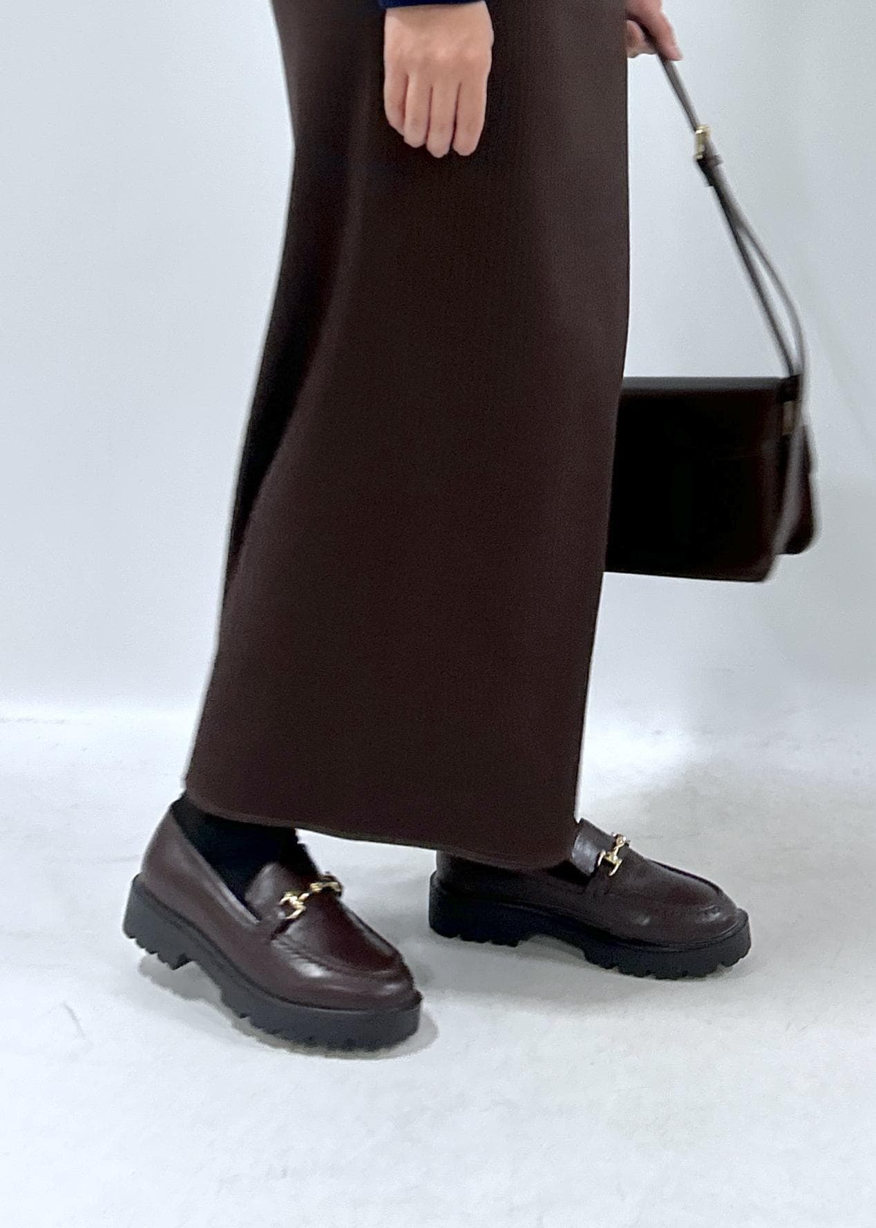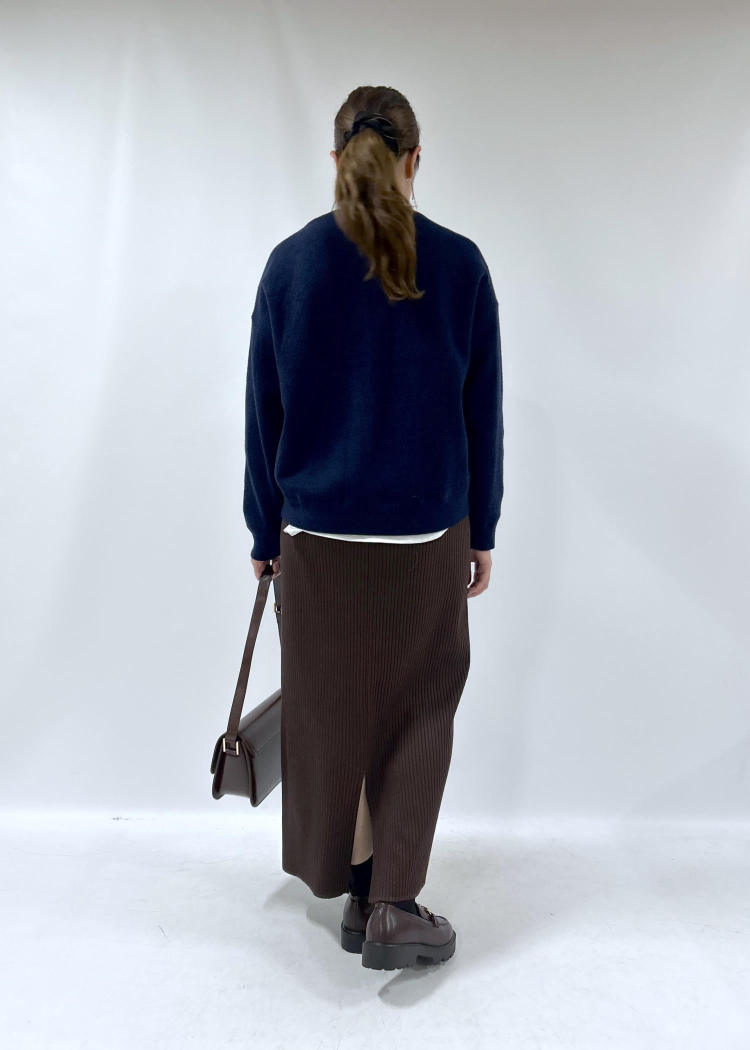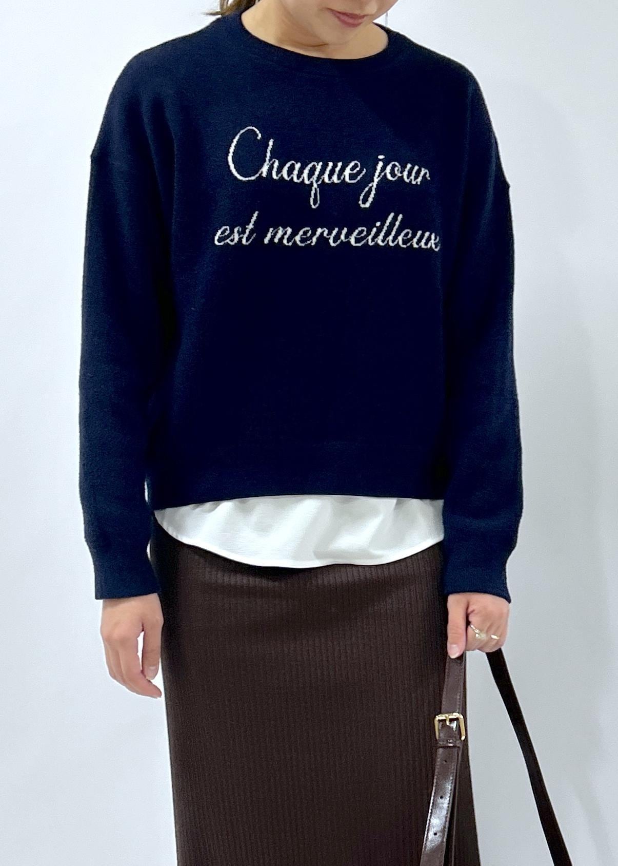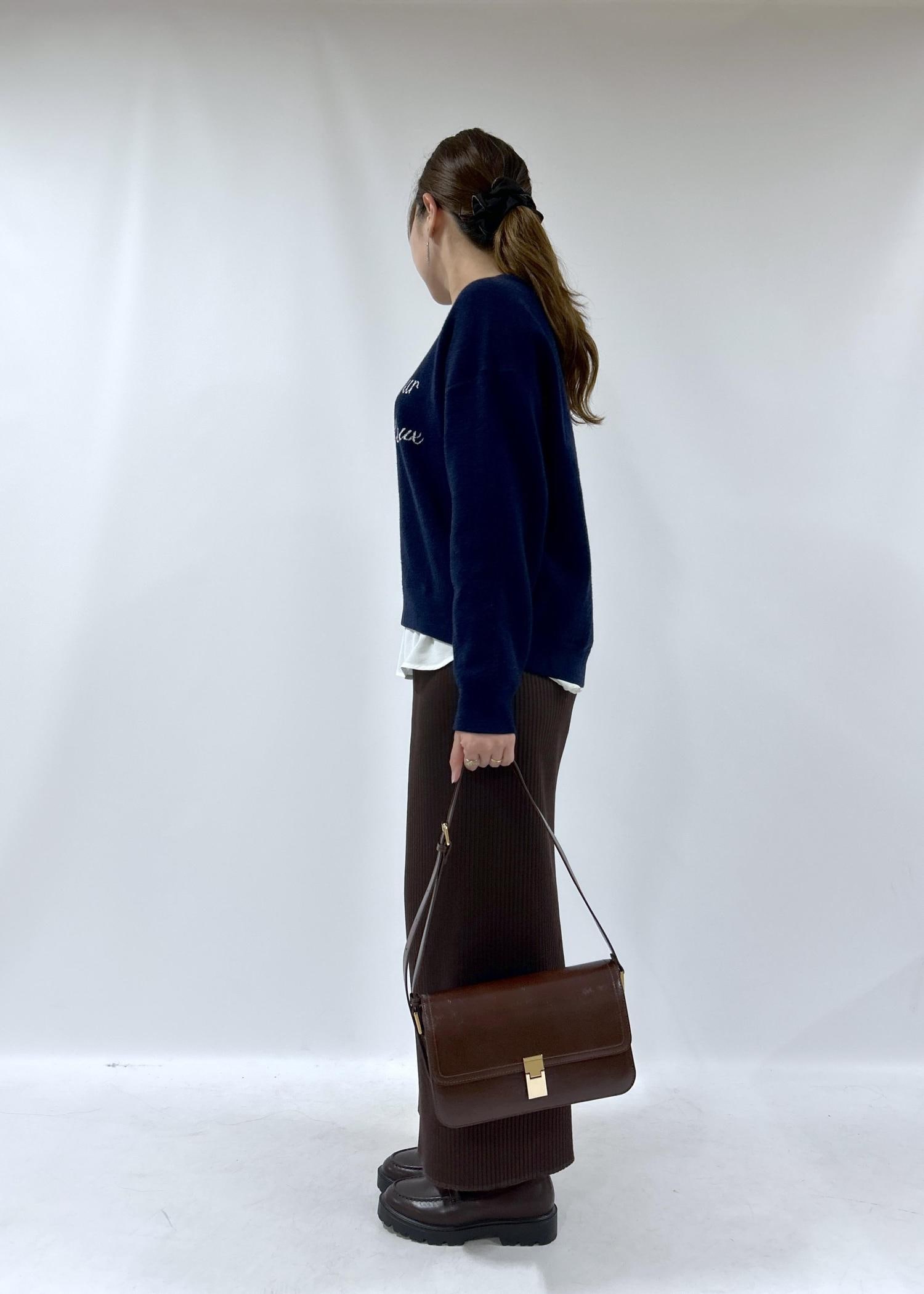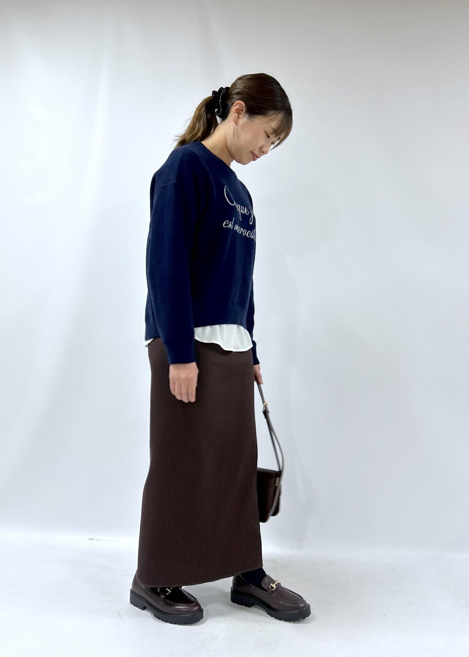 ロゴニットとアイラインスカートで大人カジュアルなコーディネートです。