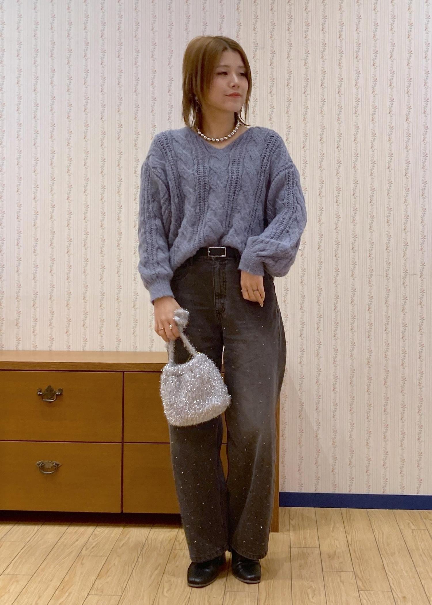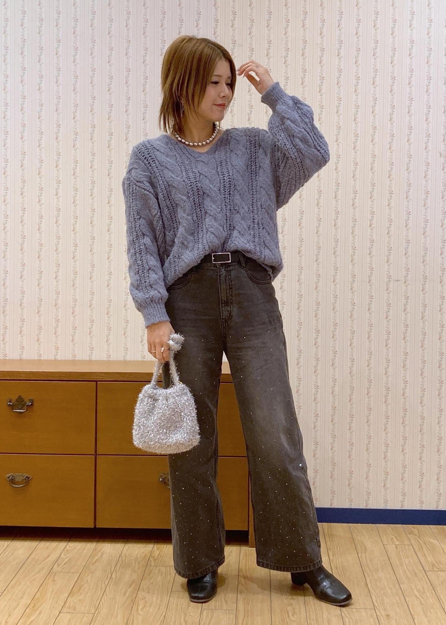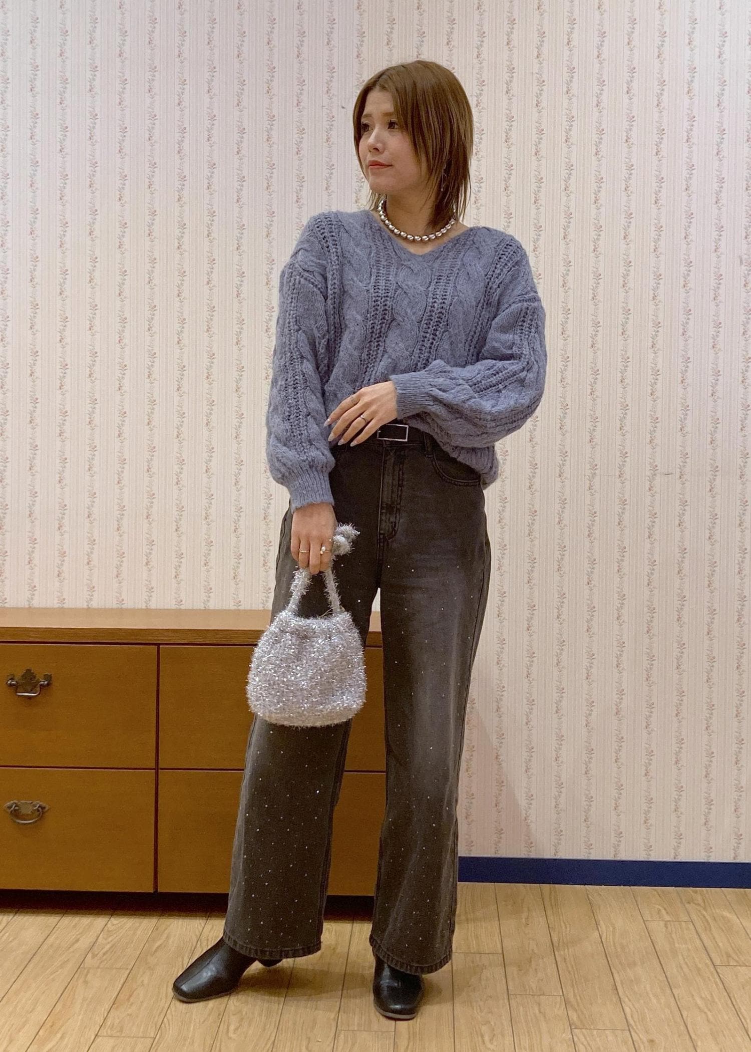 くすみブルーのニットにキラキラのビジューデニムを合わせてホリデーシーズンにピッタリのシンプルキレイめカジュアルコーディネート!