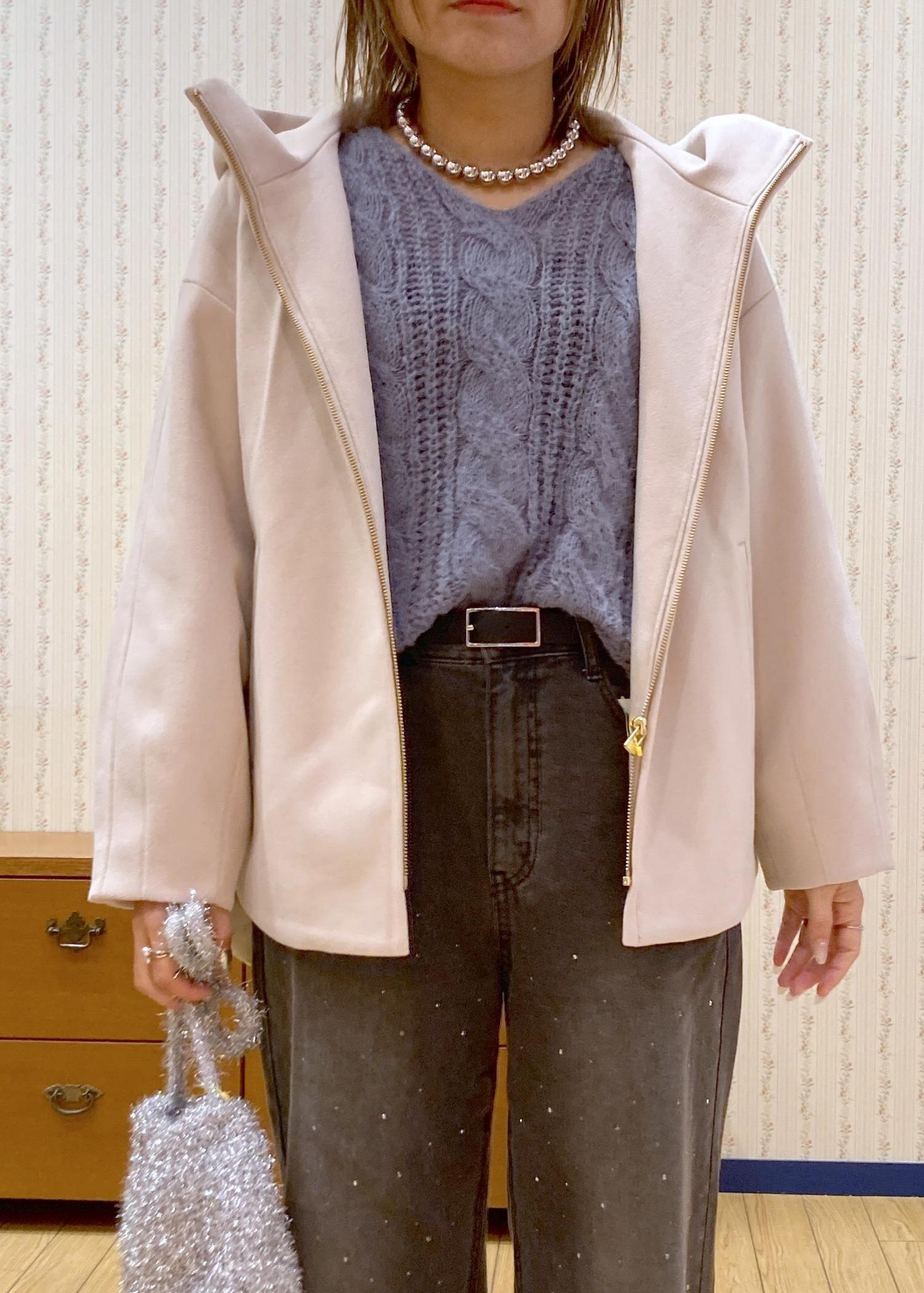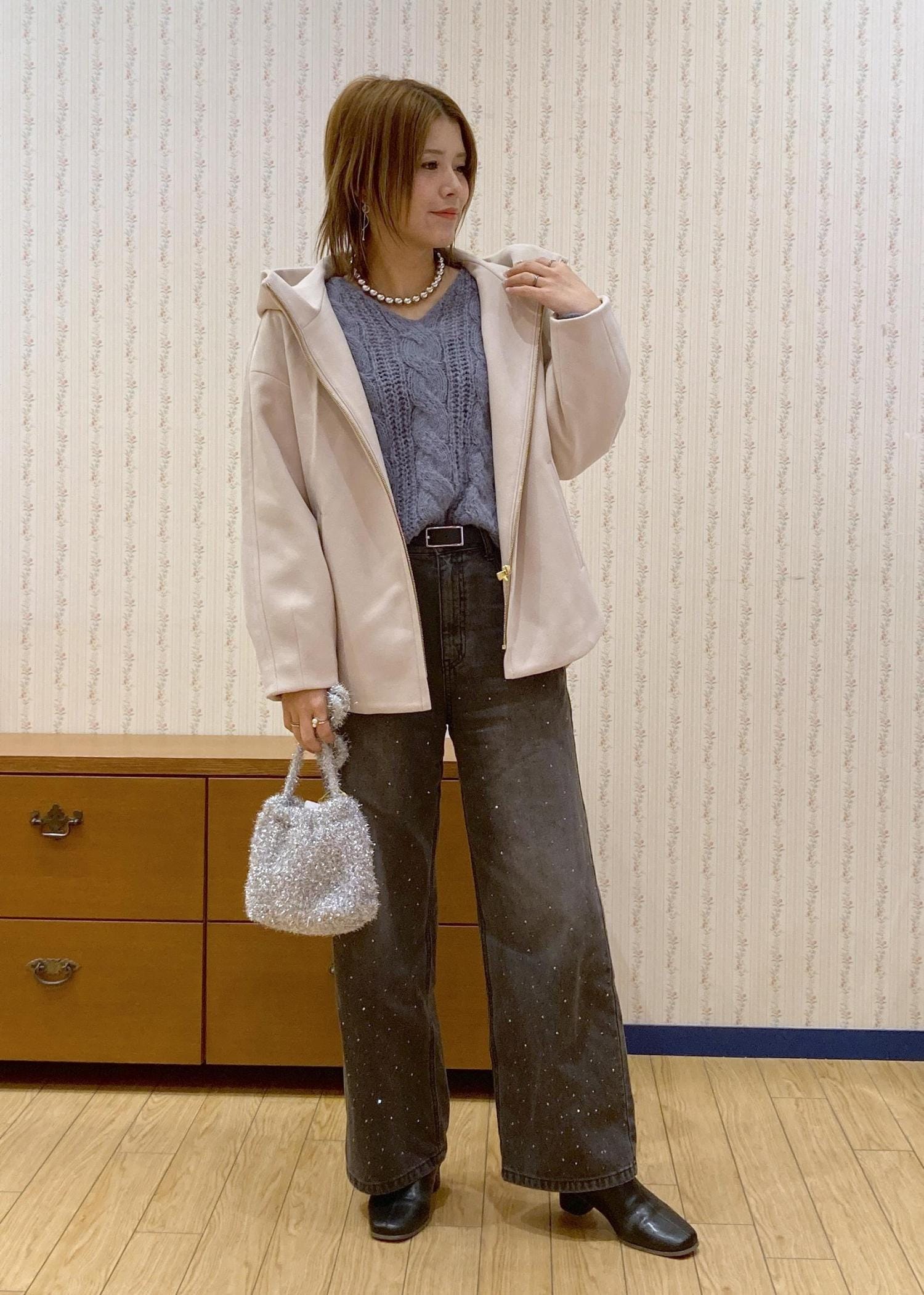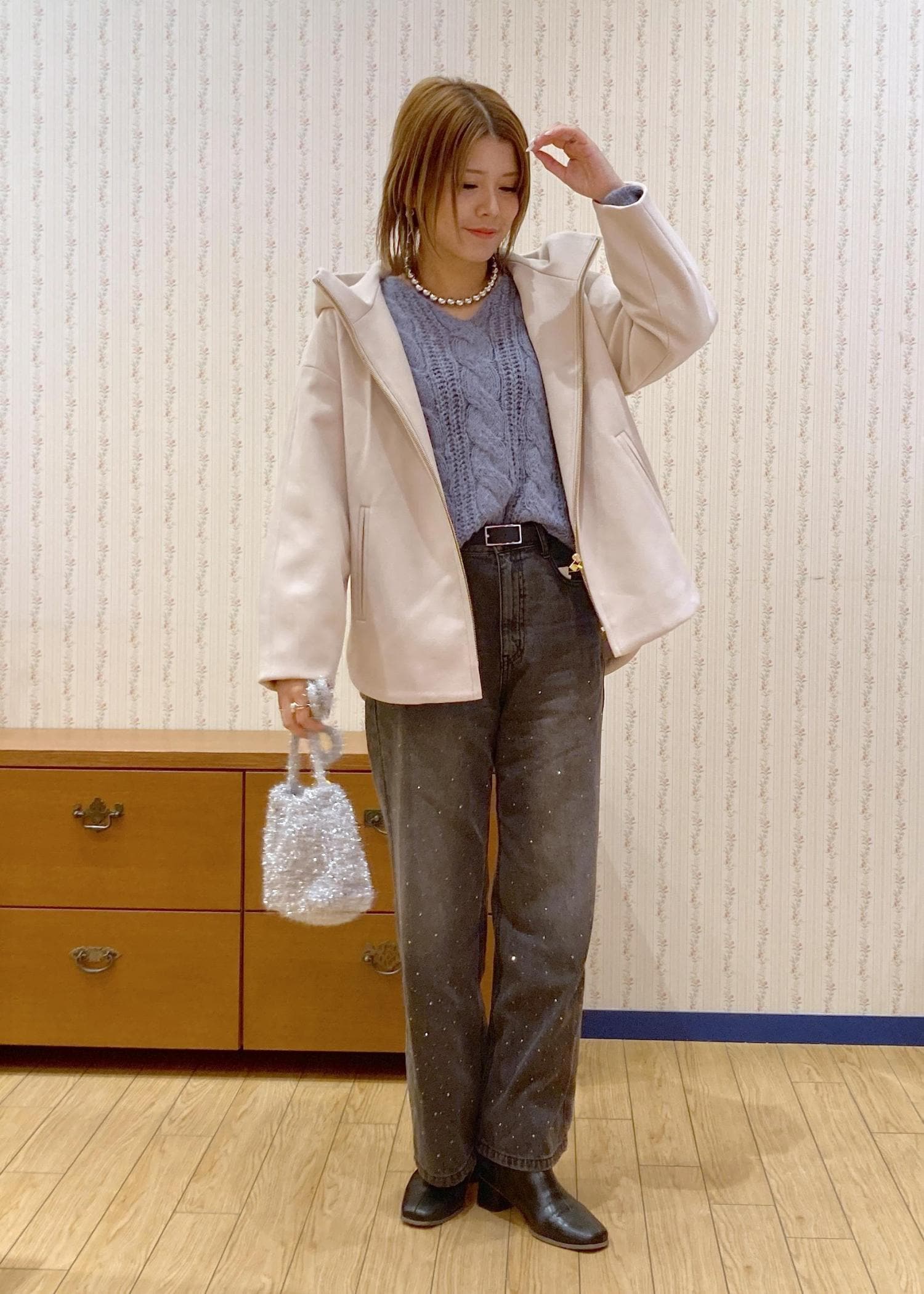 くすみブルーのニットにキラキラのビジューデニムを合わせてホリデーシーズンにピッタリのシンプルキレイめカジュアルコーディネート!