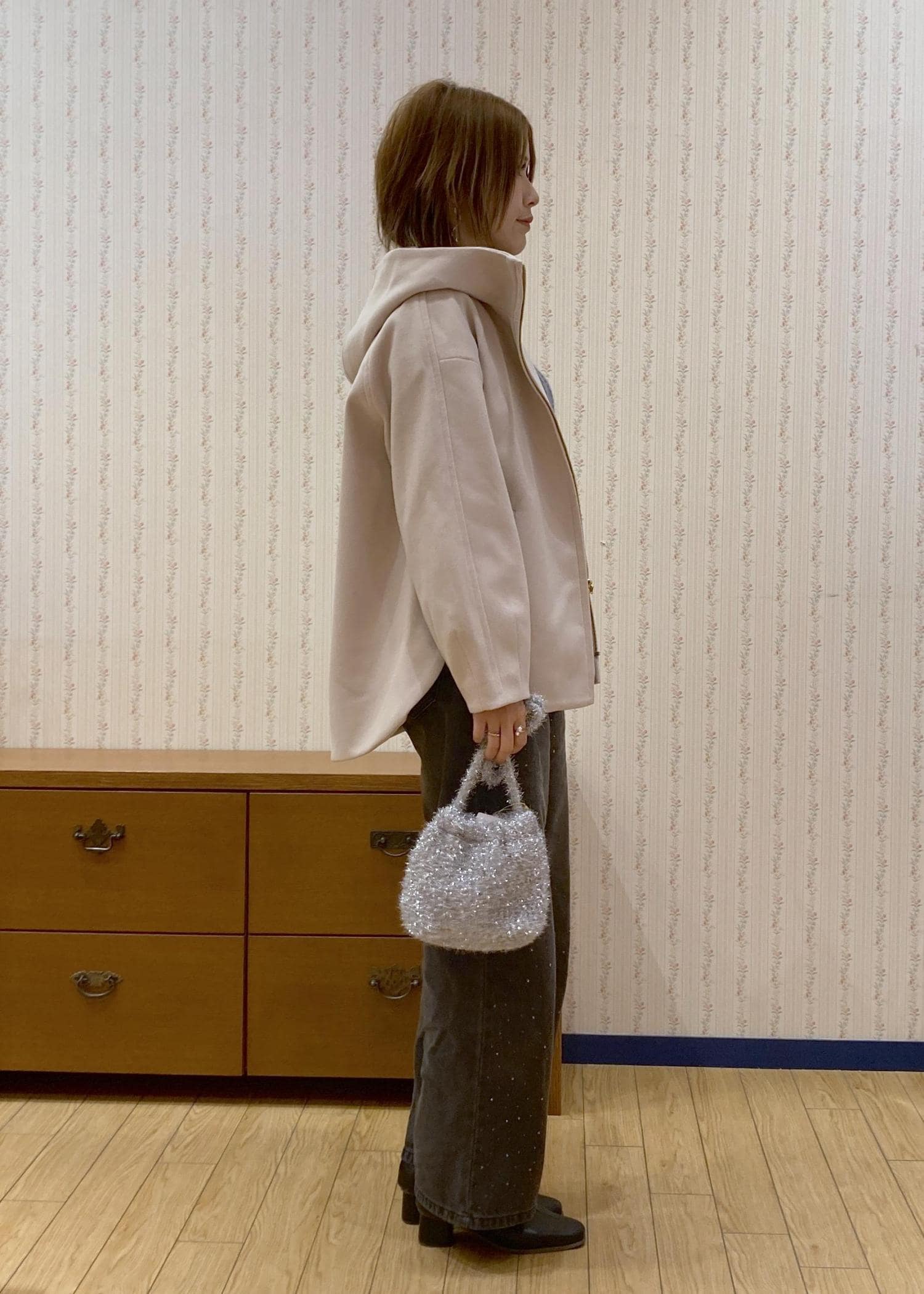 バッグもキラキラしているものを合わせて、華やかさをプラスしました。