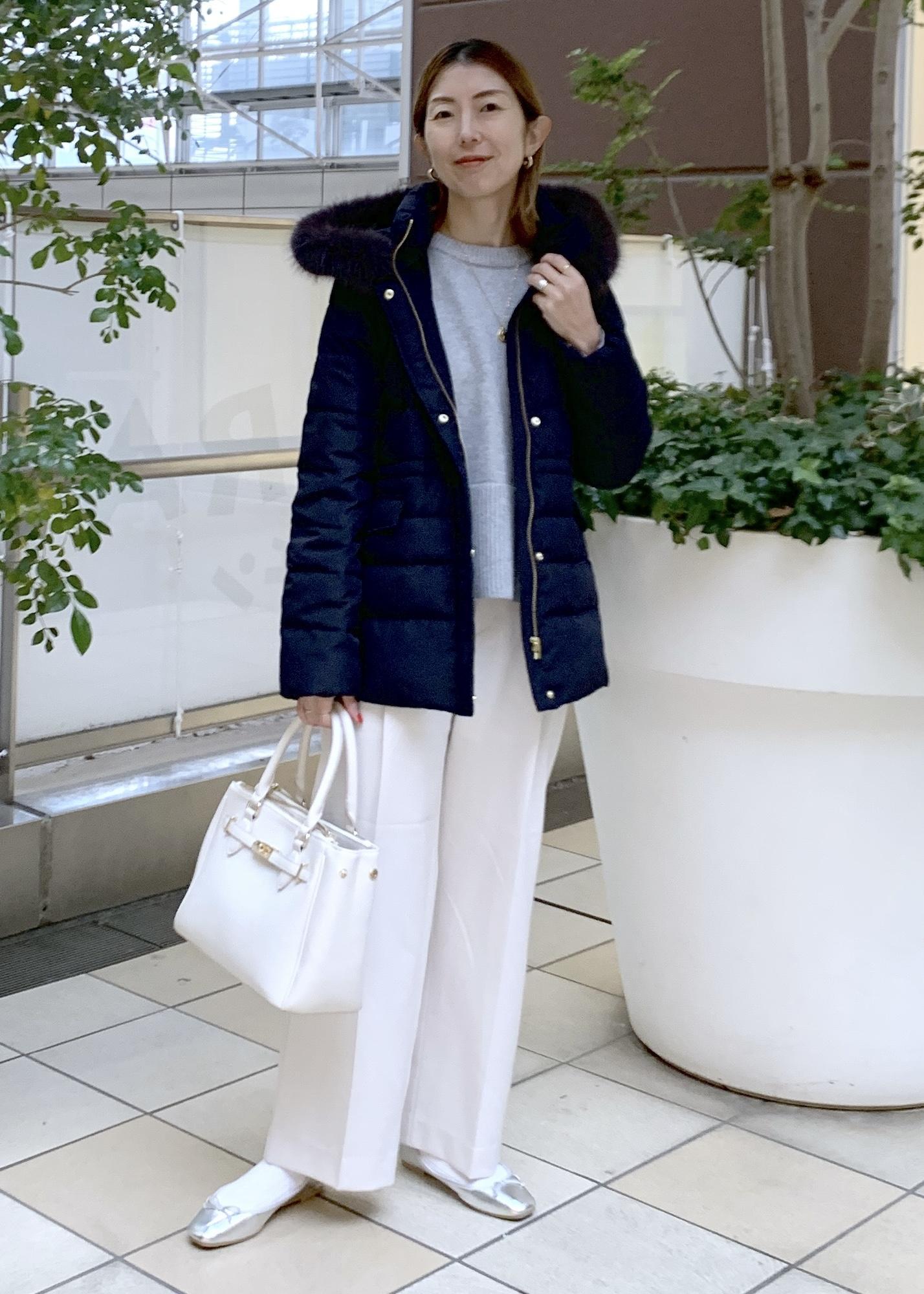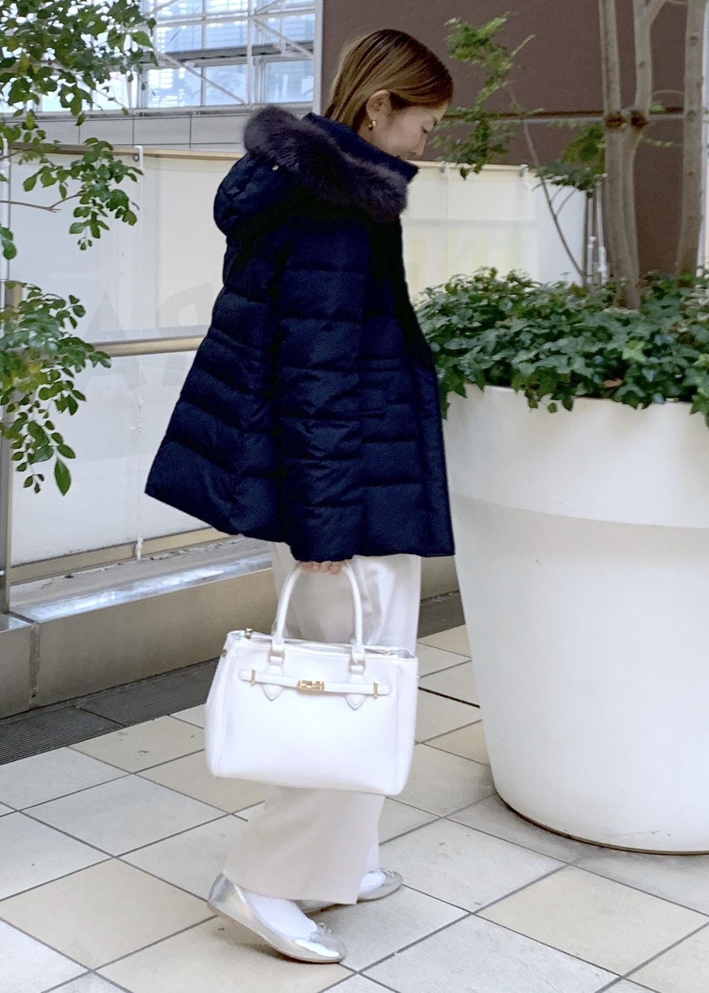 綺麗めな印象のファー付きミドル丈ダウンコート。